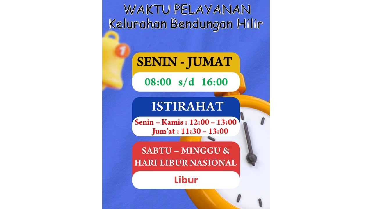 WAKTU PELAYANAN Senin - Jum'at :08:00 WIB s/d 16:00 WIB ISTIRAHAT Senin - Kamis : 12:00 WIB - 13:00 WIB Jum'at : 11:30 WIB - 13:00 WIB
