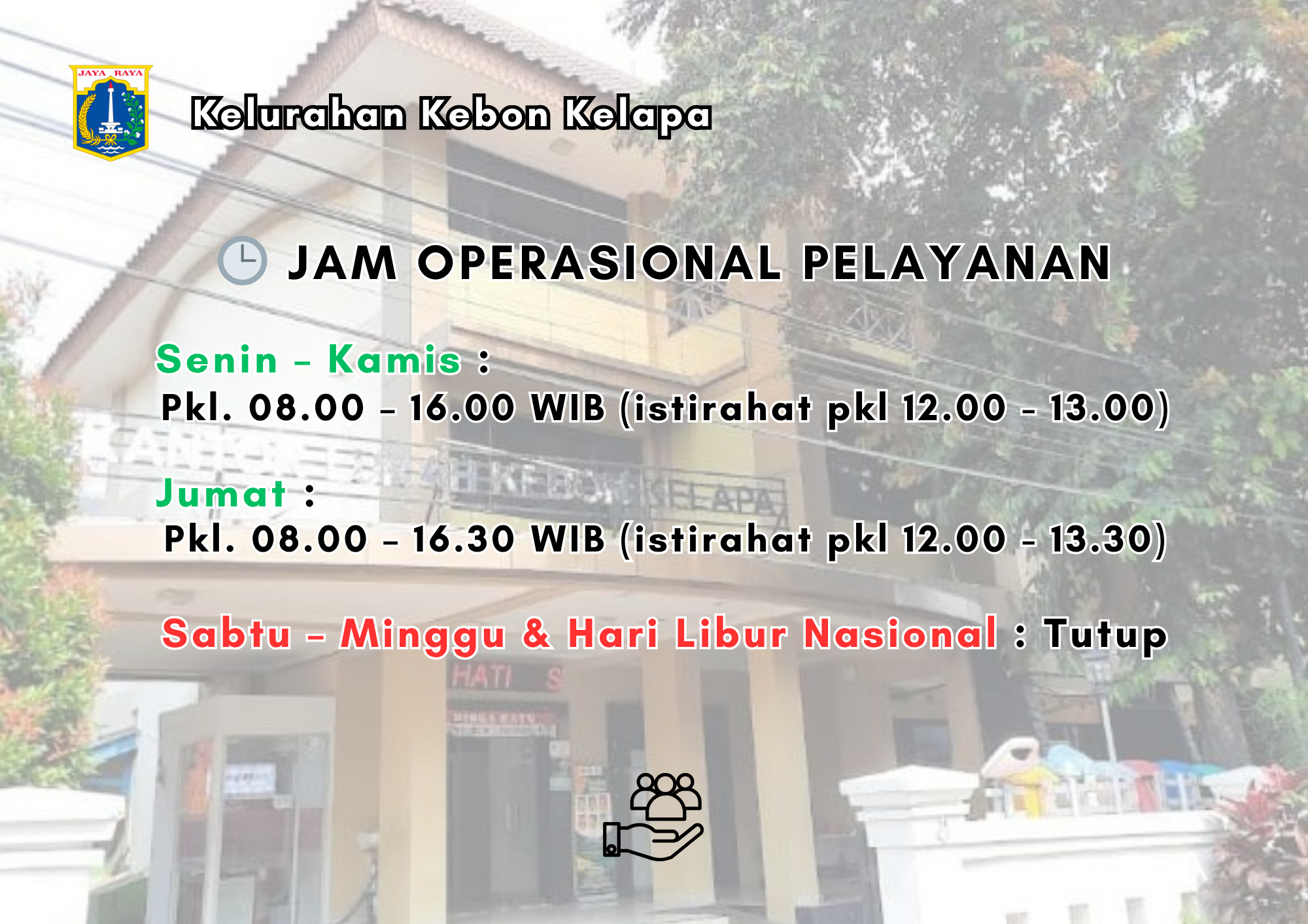 🕒 Jam Operasional Pelayanan Kelurahan Senin – Kamis : pkl. 08.00 – 16.00 wib (istirahat pkl 12.00 - 13.00) Jumat : 08.00 – 16.30 (istirahat pkl 12.00 - 13.30) Sabtu –...
