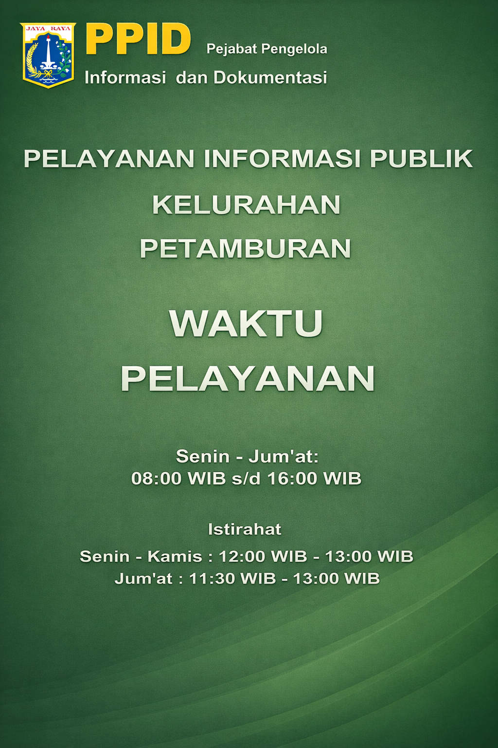WAKTUPELAYANANSenin - Jum'at:08:00 WIB s/d 16:00 WIB IstirahatSenin - Kamis : 12:00 WIB - 13:00 WIB Jum'at : 11:30 WIB - 13:00 WIB