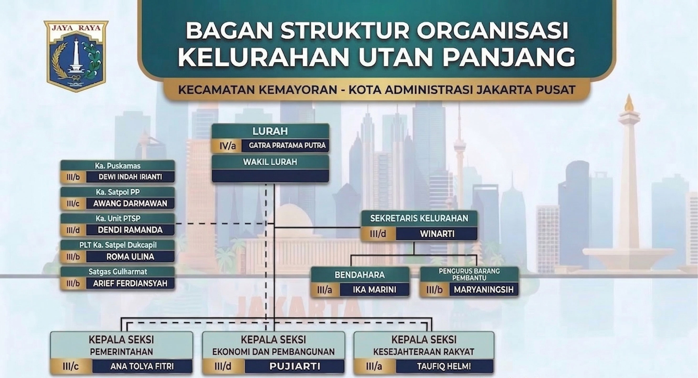 Bagan Struktur Organisasi Kelurahan Utan Panjang disusun berdasarkan peraturan perundang-undangan yang berlaku untuk menggambarkan tata kelola administrasi wilayah yang transparan dan akuntabel. Struktur ini mencakup unsur pimpinan, sekretariat, unit bendahara, serta unit teknis (Seksi Pemerintahan, Seksi Ekonomi dan Pembangunan, serta Seksi Kesejahteraan Rakyat) guna memastikan pelayanan publik yang prima bagi seluruh warga.