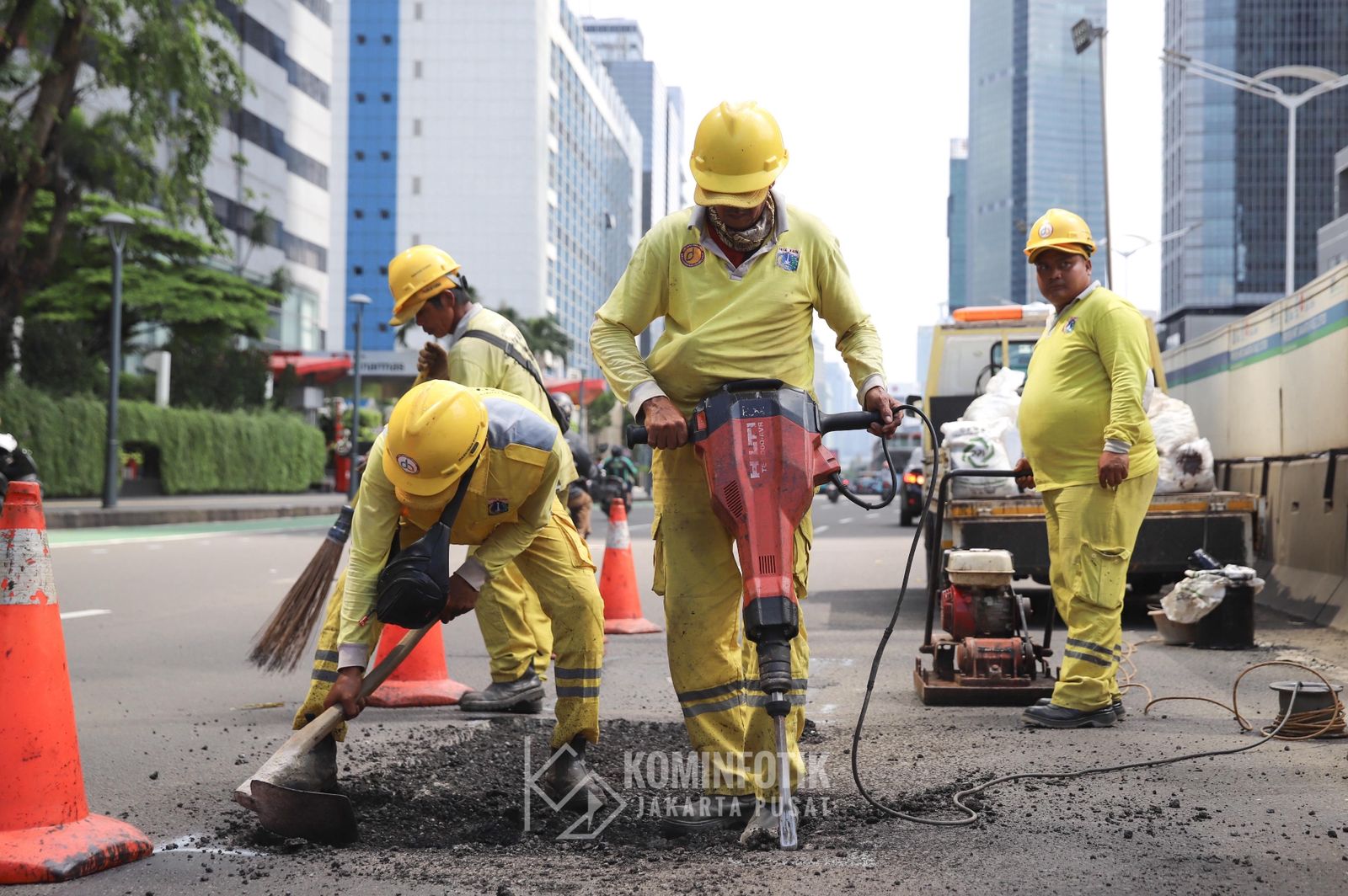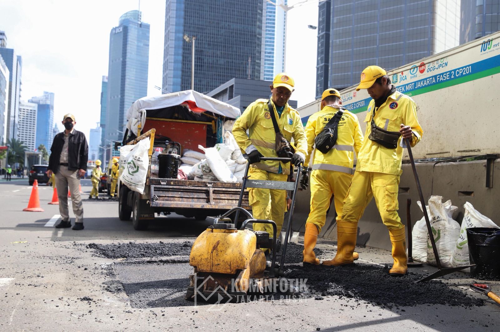 Wakil Gubernur DKI Jakarta Rano Karno didampingi Wali Kota Administrasi Jakarta Pusat Arifin meninjau penambalan jalan berlubang di Jalan Thamrin, Selasa (3/2).