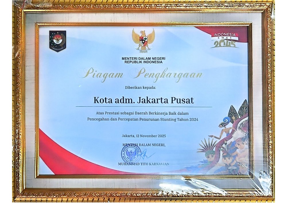 Piagam Penghargaan Diberikan Kepada Kota Administrasi Jakarta Pusat Atas Prestasi sebagai Daerah Berkinerja Baik dalam Pencegahan dan Percepatan Penurunan Stunting Tahun 2024