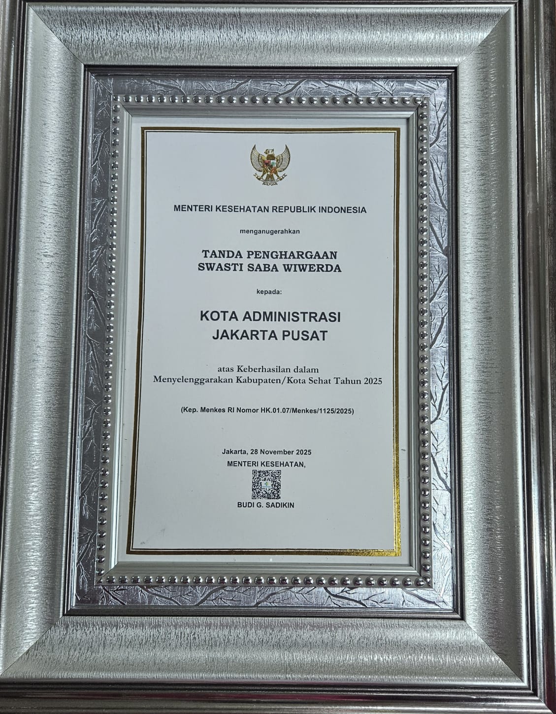 Tanda Penghargaan Swasti Saba Wiwerda kepada: Kota Administrasi Jakarta Pusat atas Keberhasilan dalam Menyelenggarakan Kabupaten/Kota Sehat Tahun 2025