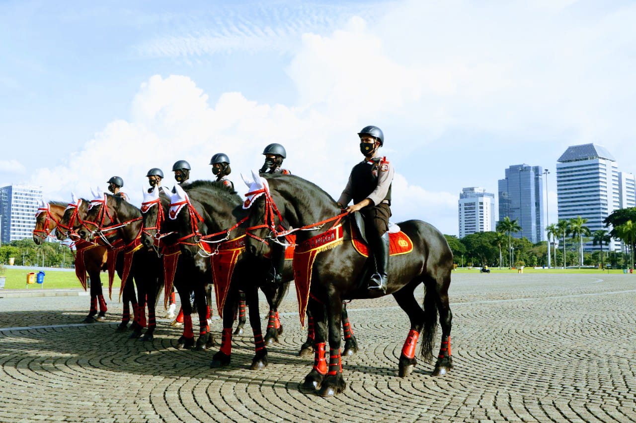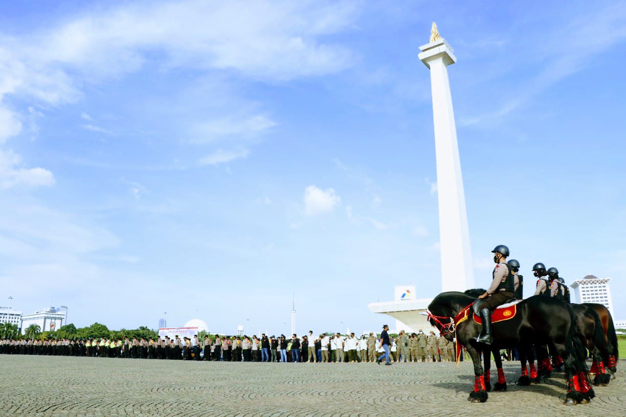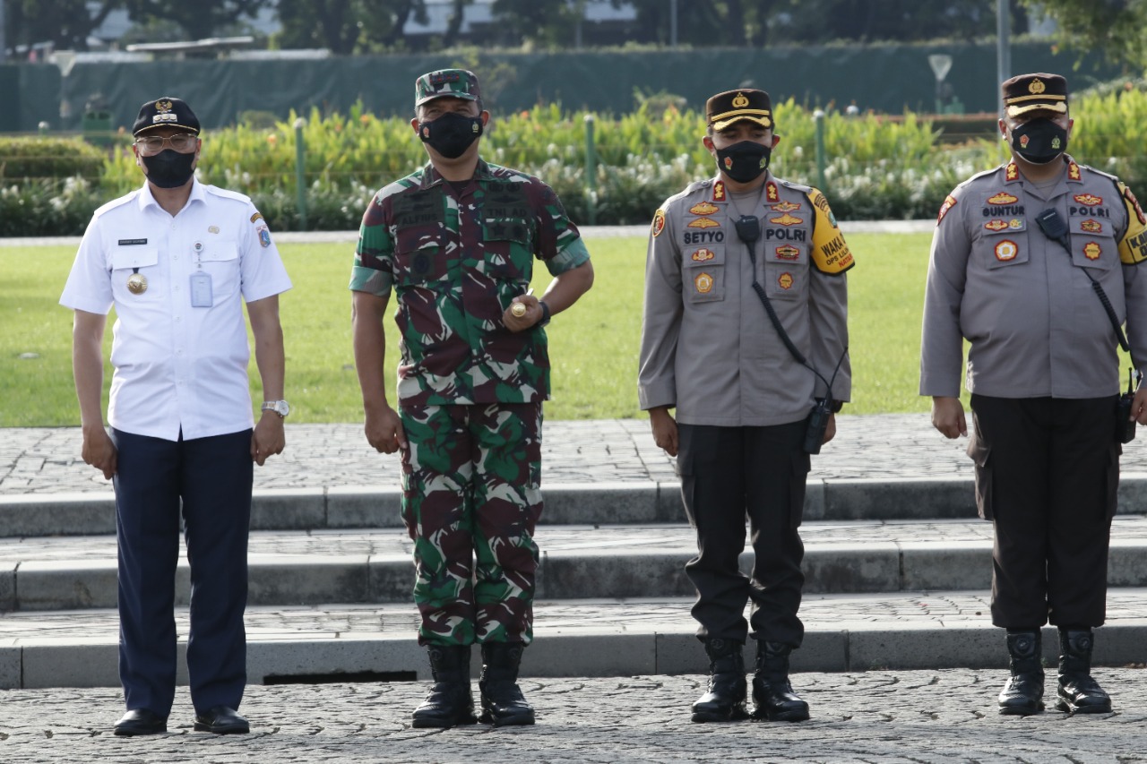 Jajaran Tiga Pilar Kota Administrasi Jakarta Pusat melaksanakan Apel Gelar Pasukan Pengamanan Malam Tahun Baru 2022, di Cawan Monas Selatan, Gambir, Jumat (31/12).