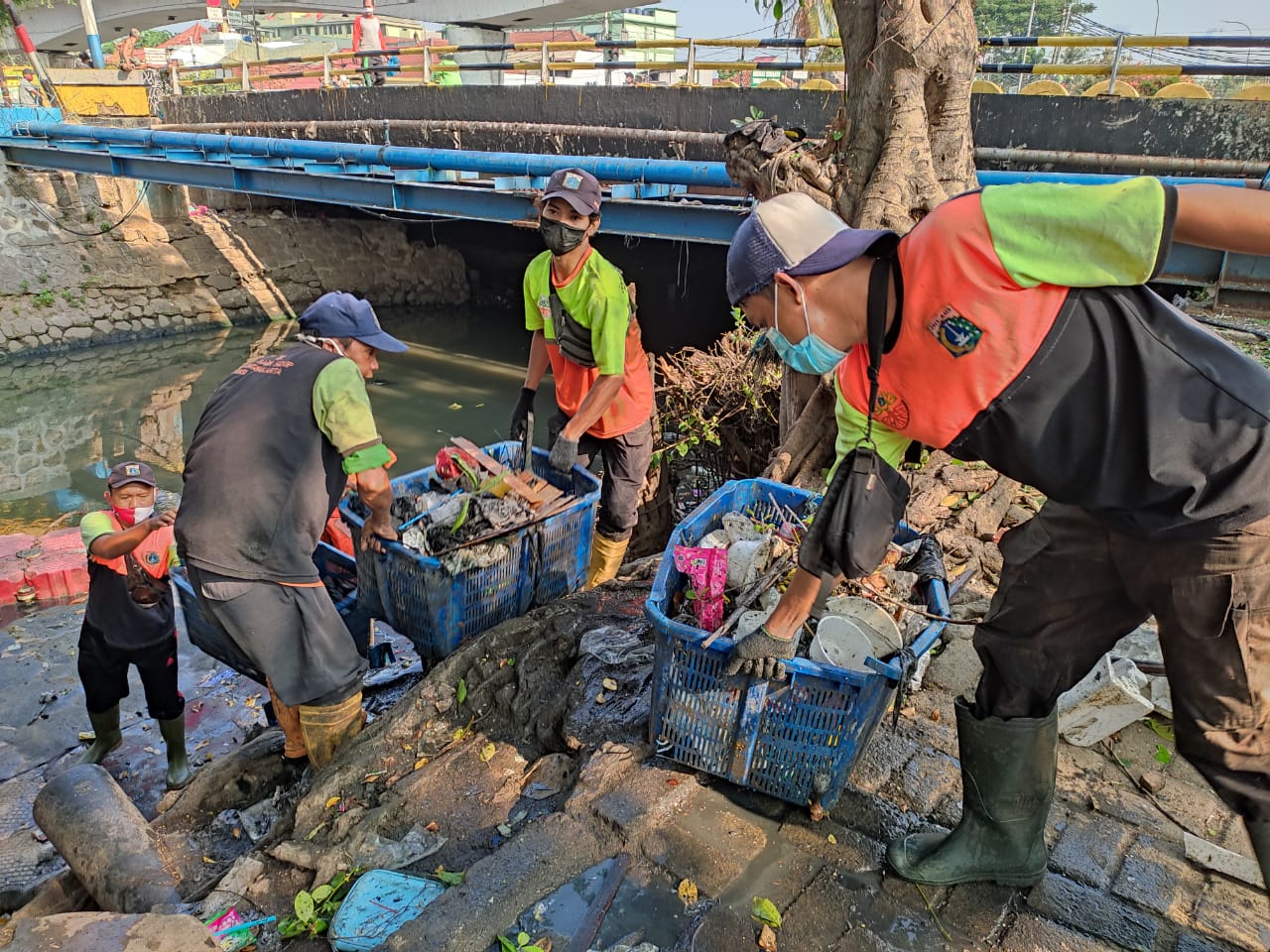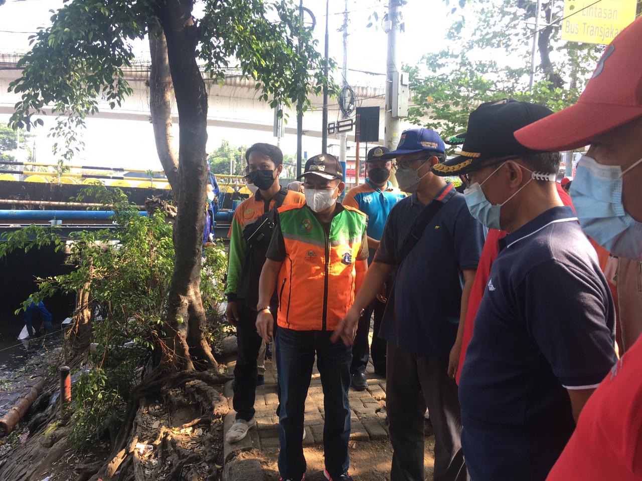 Wakil Wali Kota Administrasi Jakarta Pusat Irwandi monitor gerebek lumpur di Kali Sentiong, Kelurahan Galur, Kecamatan Johar Baru, Minggu (3/10).