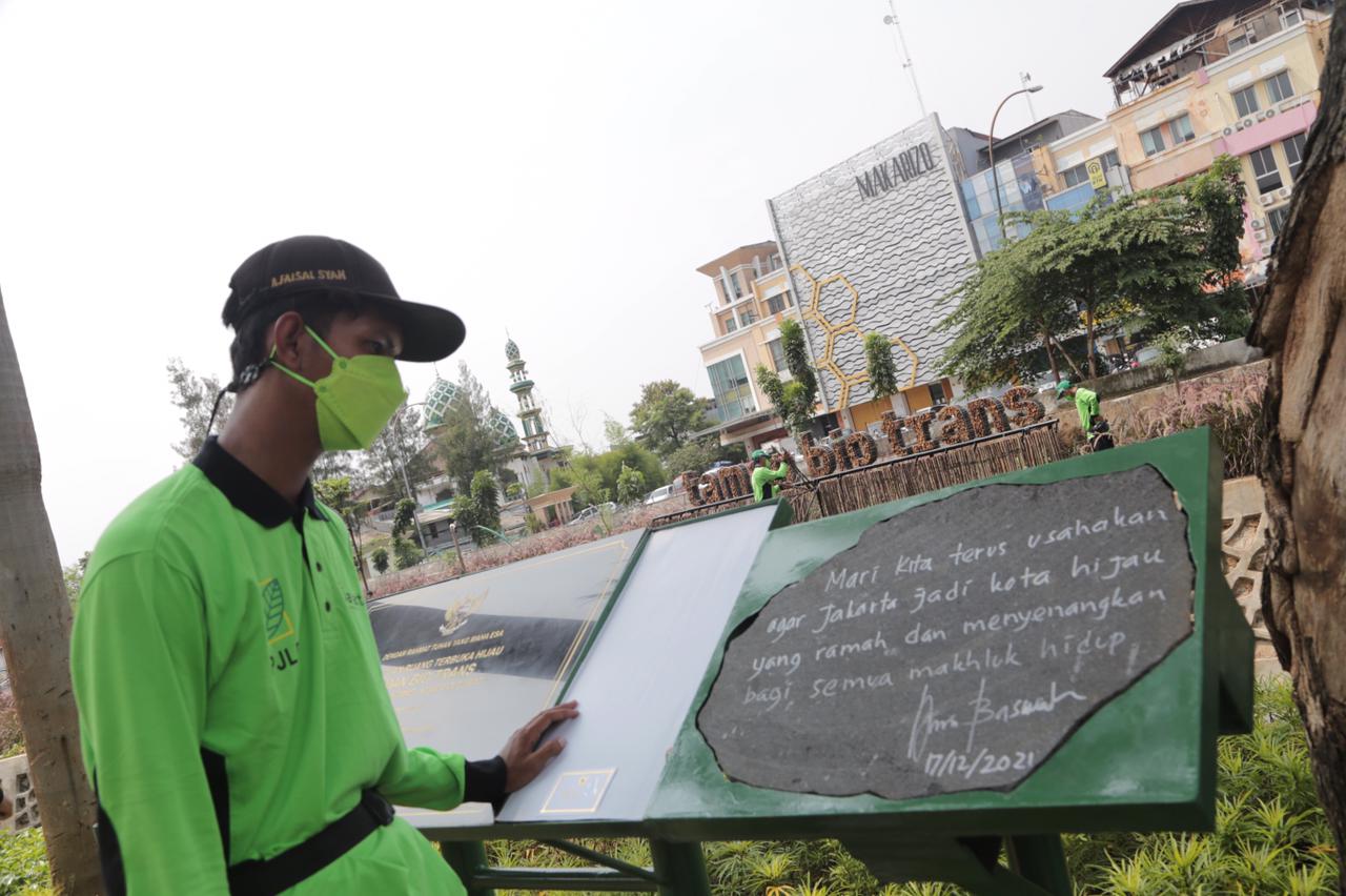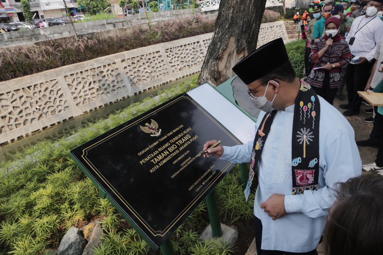 Taman Bio Trans diresmikan oleh Gubernur DKI Jakarta, Anies Baswedan Jumat (17/12) siang tadi. Turut hadir mendampingi Anies di antaranya Asisten Sekda Bidang Pembangunan dan Lingkungan Hidup, Afan Adriansyah, Kepala Dinas Pertamanan dan Hutan Kota, Suzi Marsitawati, dan Wali Kota Adm. Jakarta Pusat, Dhany Sukma.