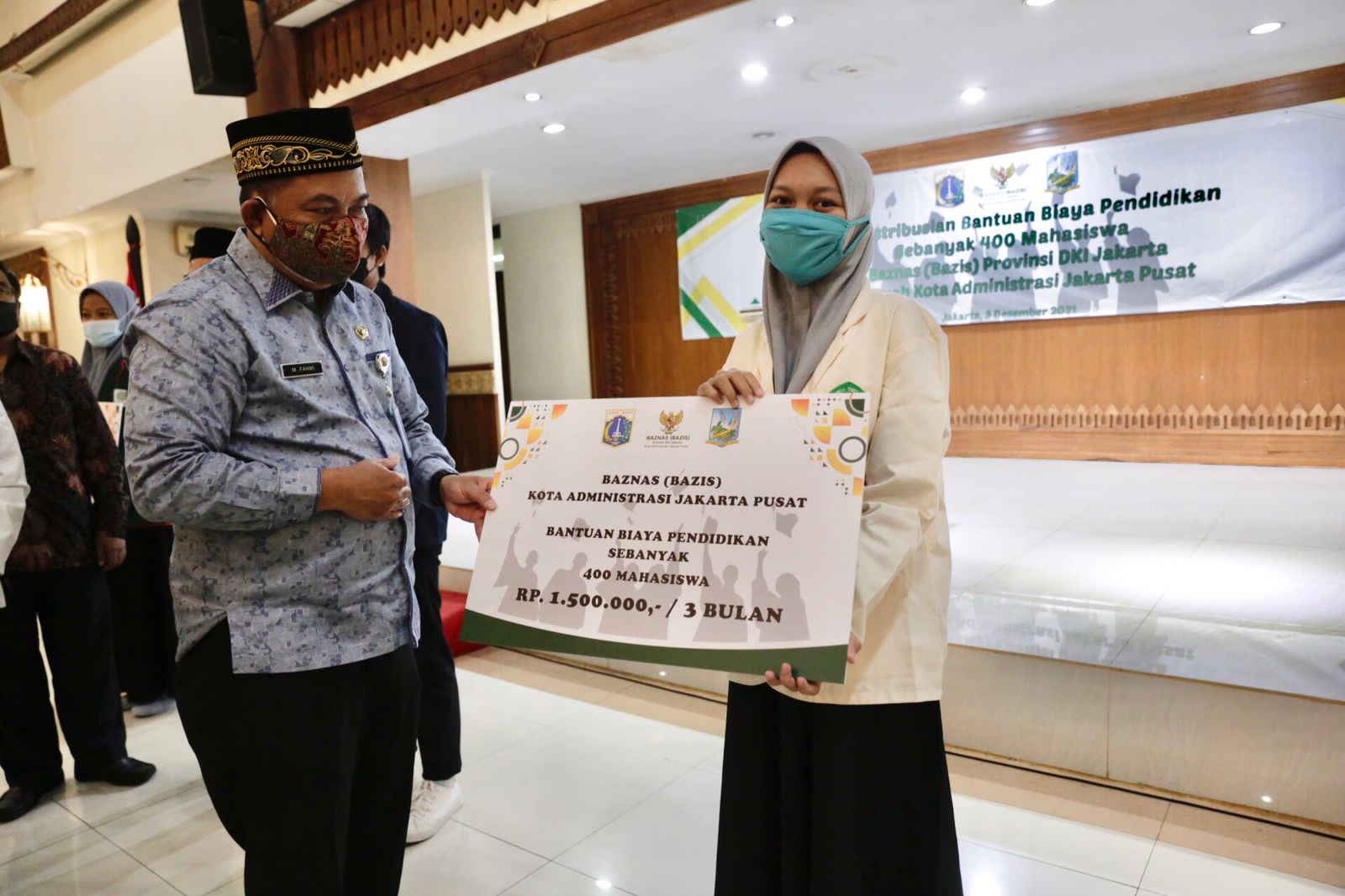 Pemerintah Kota Administrasi Jakarta Pusat berkolaborasi dengan Baznas Bazis mendistribusikan bantuan biaya pendidikan untuk 400 mahasiswa, di Ruang Serbaguna Utama, Kantor Wali Kota Jakarta Pusat, Jumat (3/12).