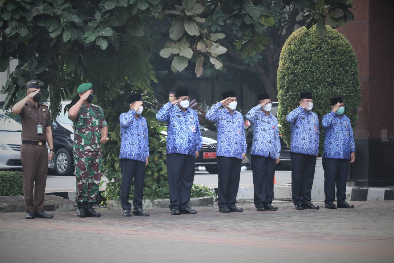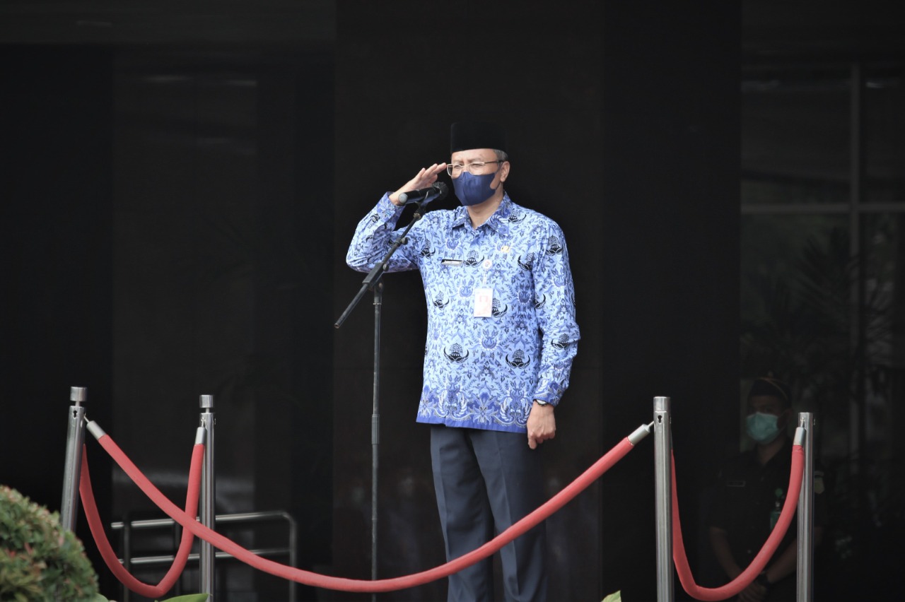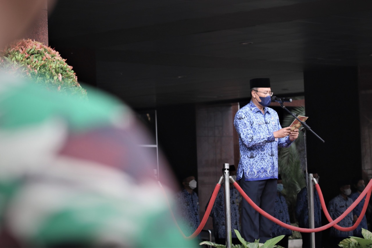Wali Kota Administrasi Jakarta Pusat Dhany Sukma memimpin upacara peringatan Hari Bela Negara ke 73, di Halaman Kantor Wali Kota Administrasi Jakarta Pusat, Senin (20/12).