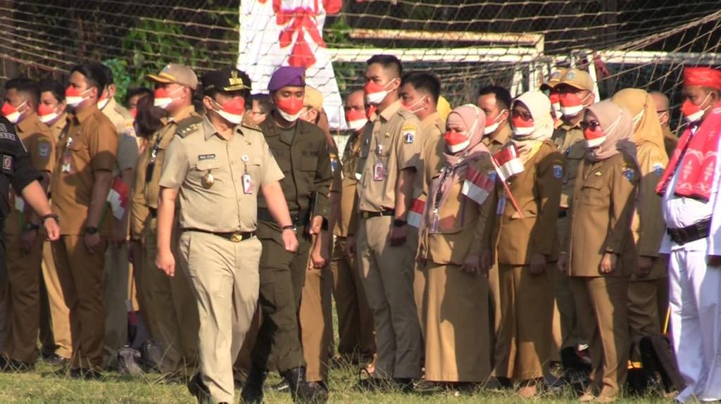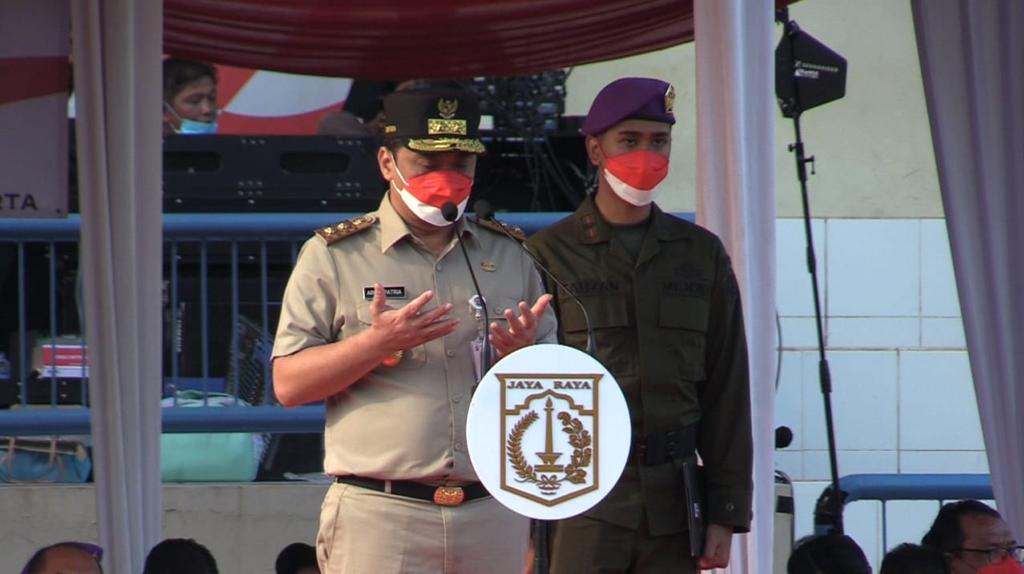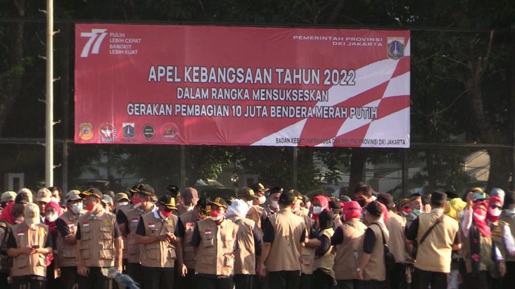 Pemerintah Provinsi DKI Jakarta menggelar Apel Kebangsaan Tahun 2022 dalam rangka menyambut dan memeriahkan Hari Ulang Tahun (HUT) Ke-77 Republik Indonesia serta mensukseskan Gerakan Pembagian 10 juta Bendera Merah Putih di Lapangan Banteng, Kelurahan Pasar Baru, Kecamatan Sawah Besar, Senin (15/8).