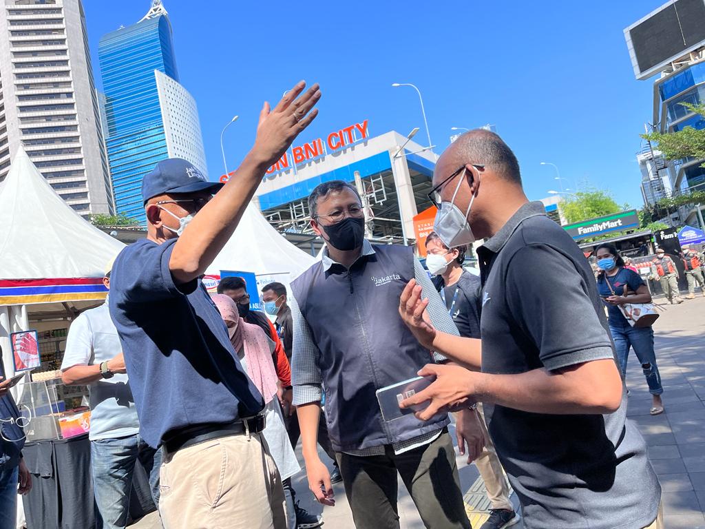 Wali Kota Administrasi Jakarta Pusat Dhany Sukma mencoba menjajaki peluang Bazar Jakpreneur saat mengunjungi stan Jakpreneur dalam acara Festival MRT 2022, di Terowongan Kendal, Kecamatan Menteng, Minggu (27/3).