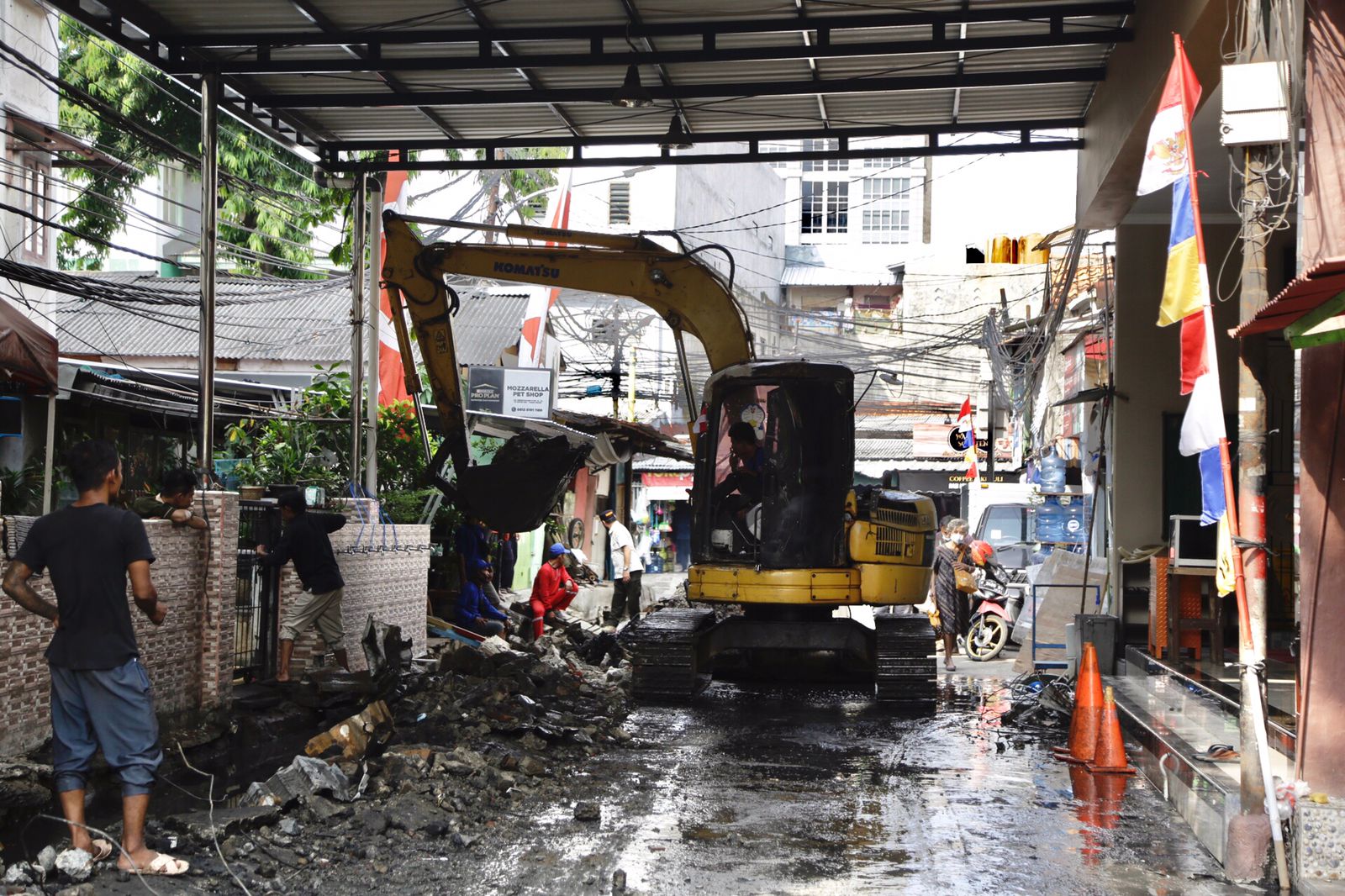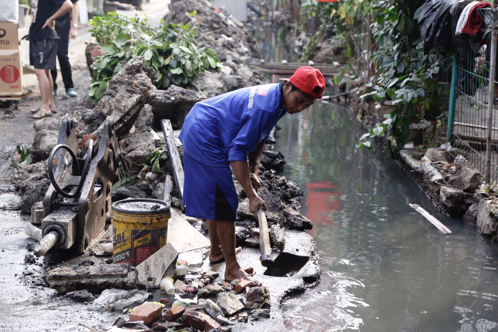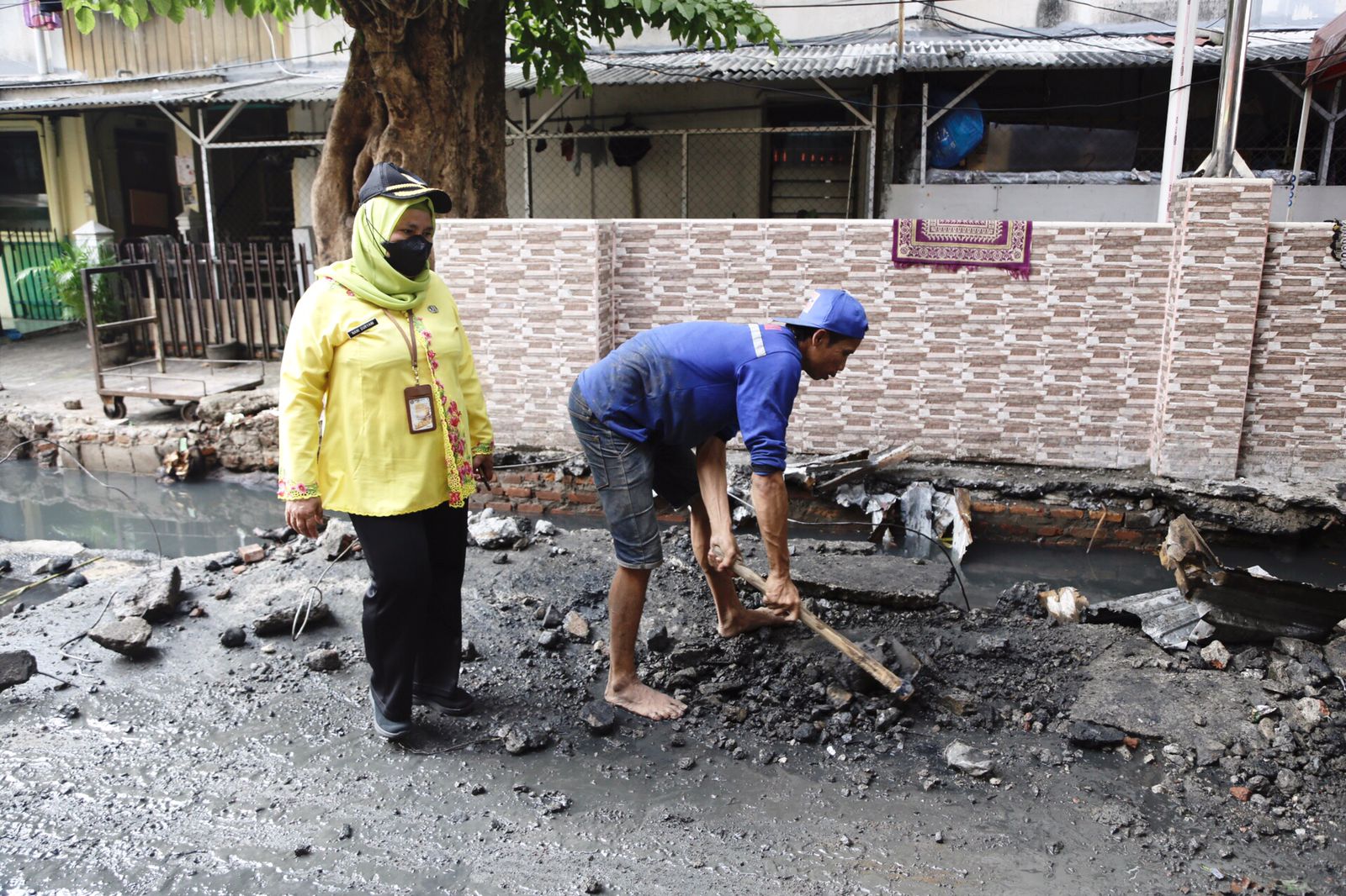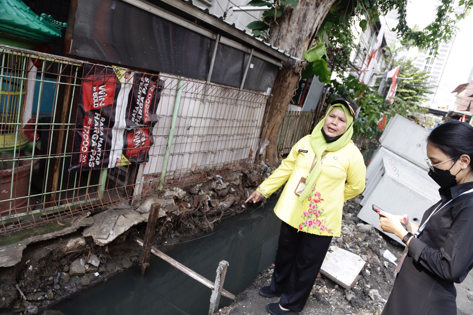 Lurah Kebon Kacang Nani Suryani meninjau normalisasi saluran air di Jalan Kebon Kacang 41, Kecamatan Tanah Abang, Jumat (5/8).