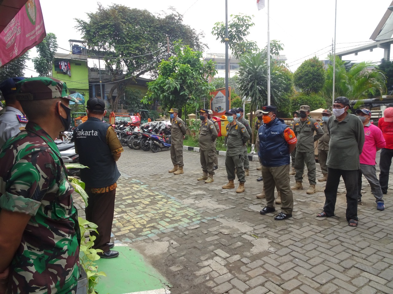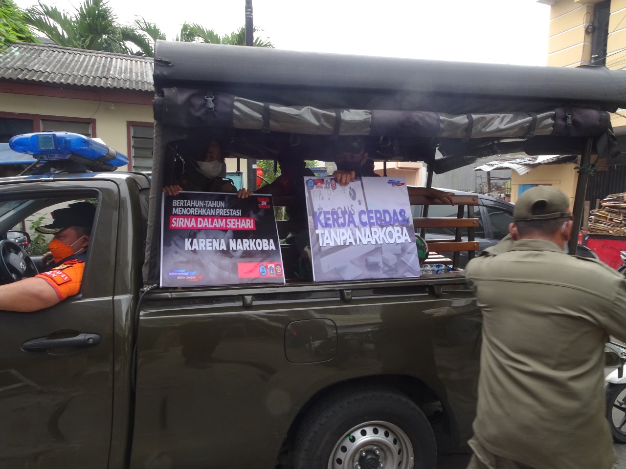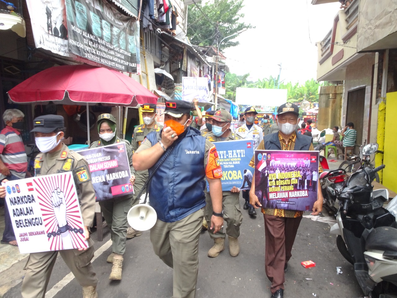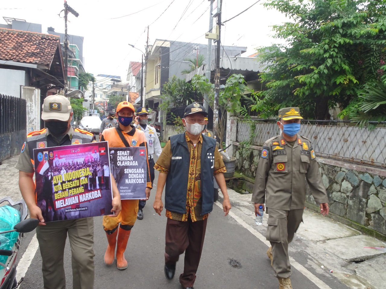 Jajaran tiga pilar Kelurahan Kwitang melakukan sosialisasi upaya pencegahan dini dan antisipasi penyalahgunaan narkoba, di lingkungan RW 01 dan 02 Kelurahan Kwitang, Kecamatan Senen, Jakarta Pusat, Kamis (17/3).
