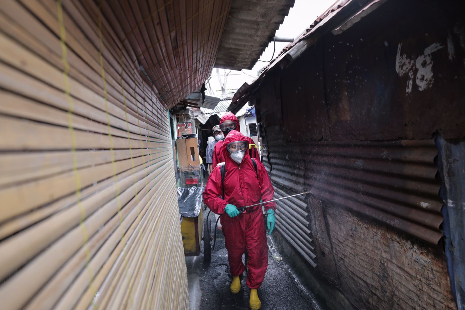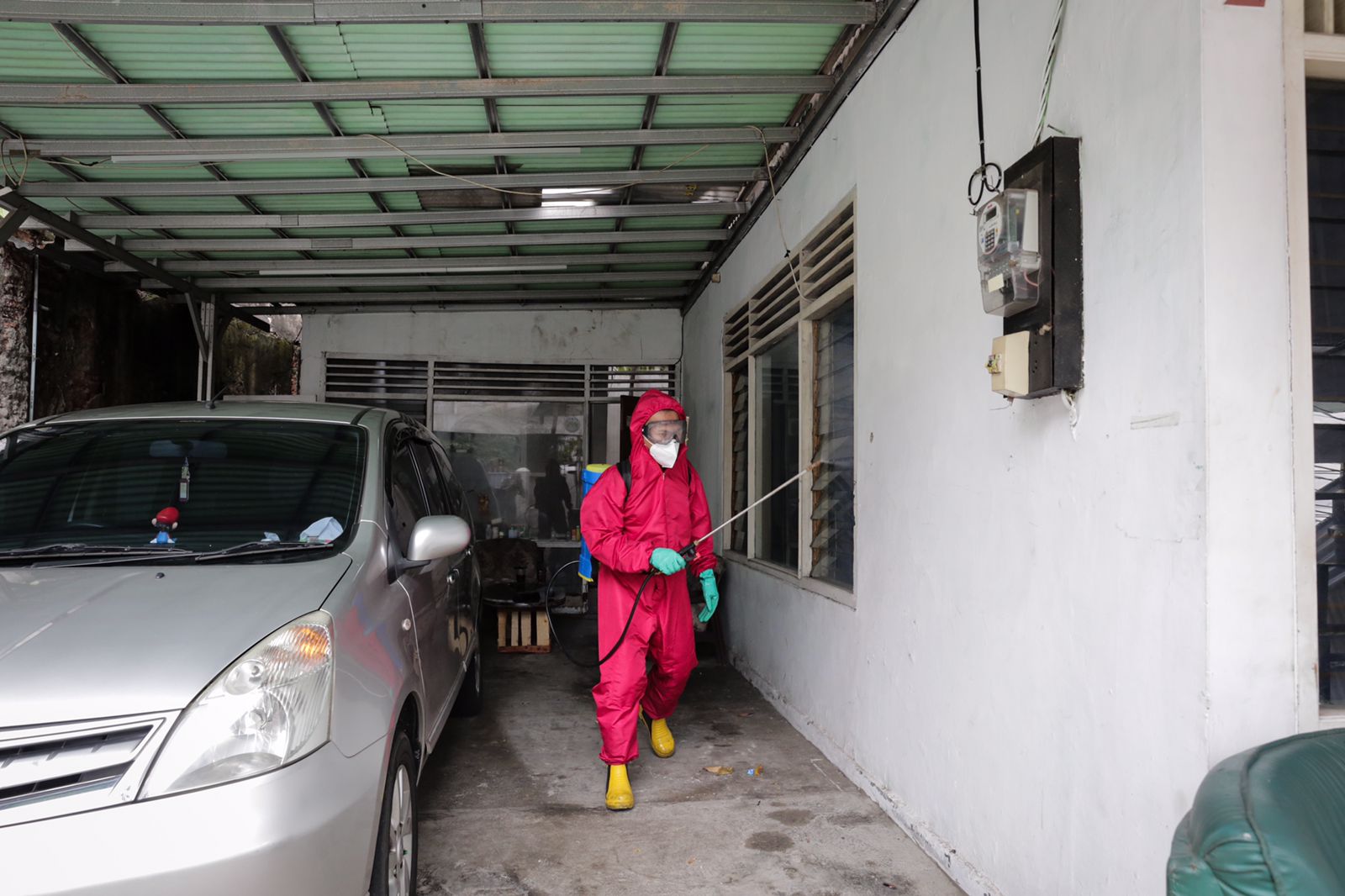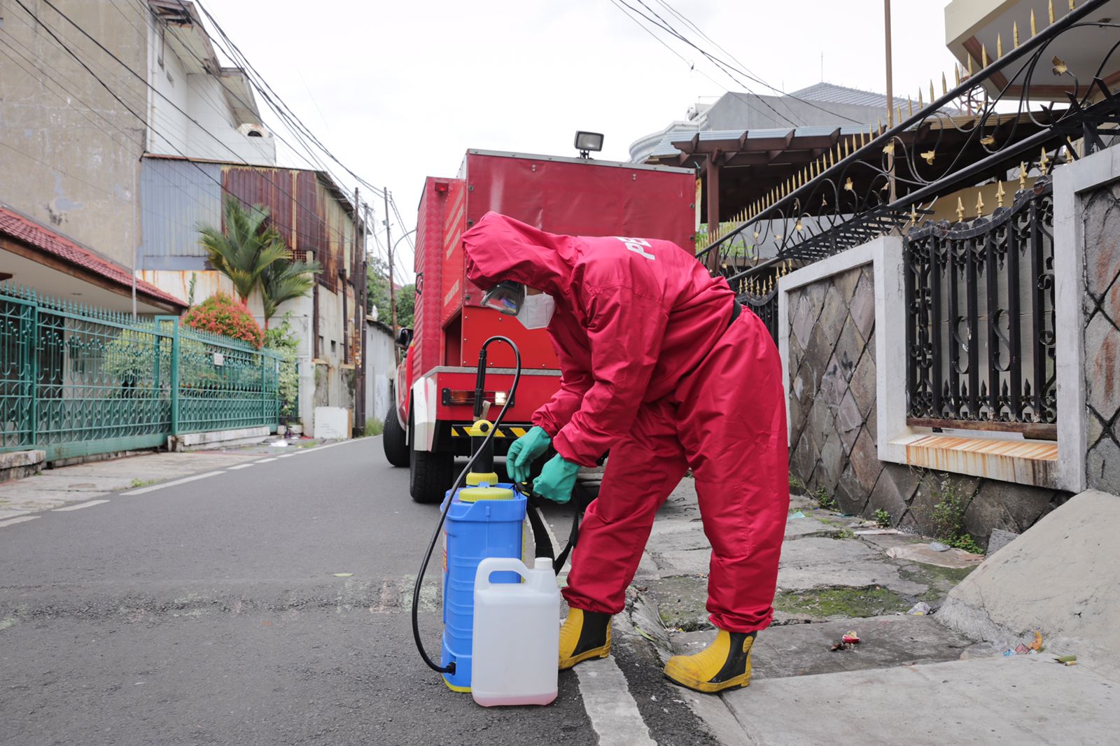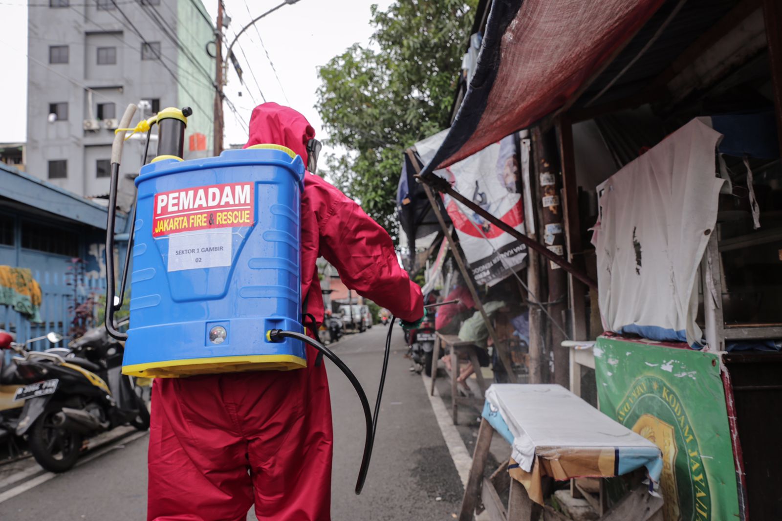 Suku Dinas (Sudin) Penanggulangan Kebakaran dan Penyelamatan (Gulkarmat) Kota Administrasi Jakarta Pusat melakukan penyemprotan Desinfektan di wilayah RW 04 Kelurahan Petojo Selatan, Kecamatan Gambir, Kamis (10/2).