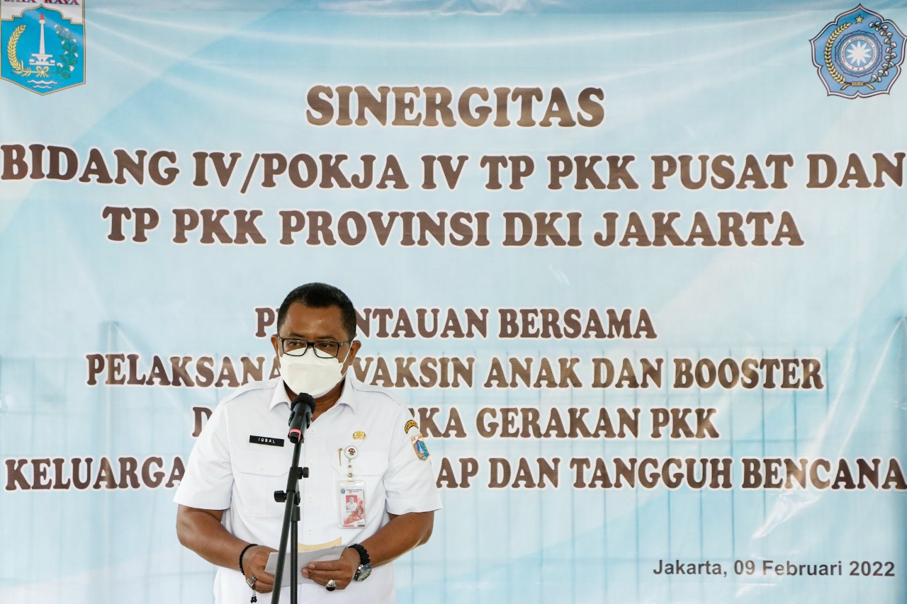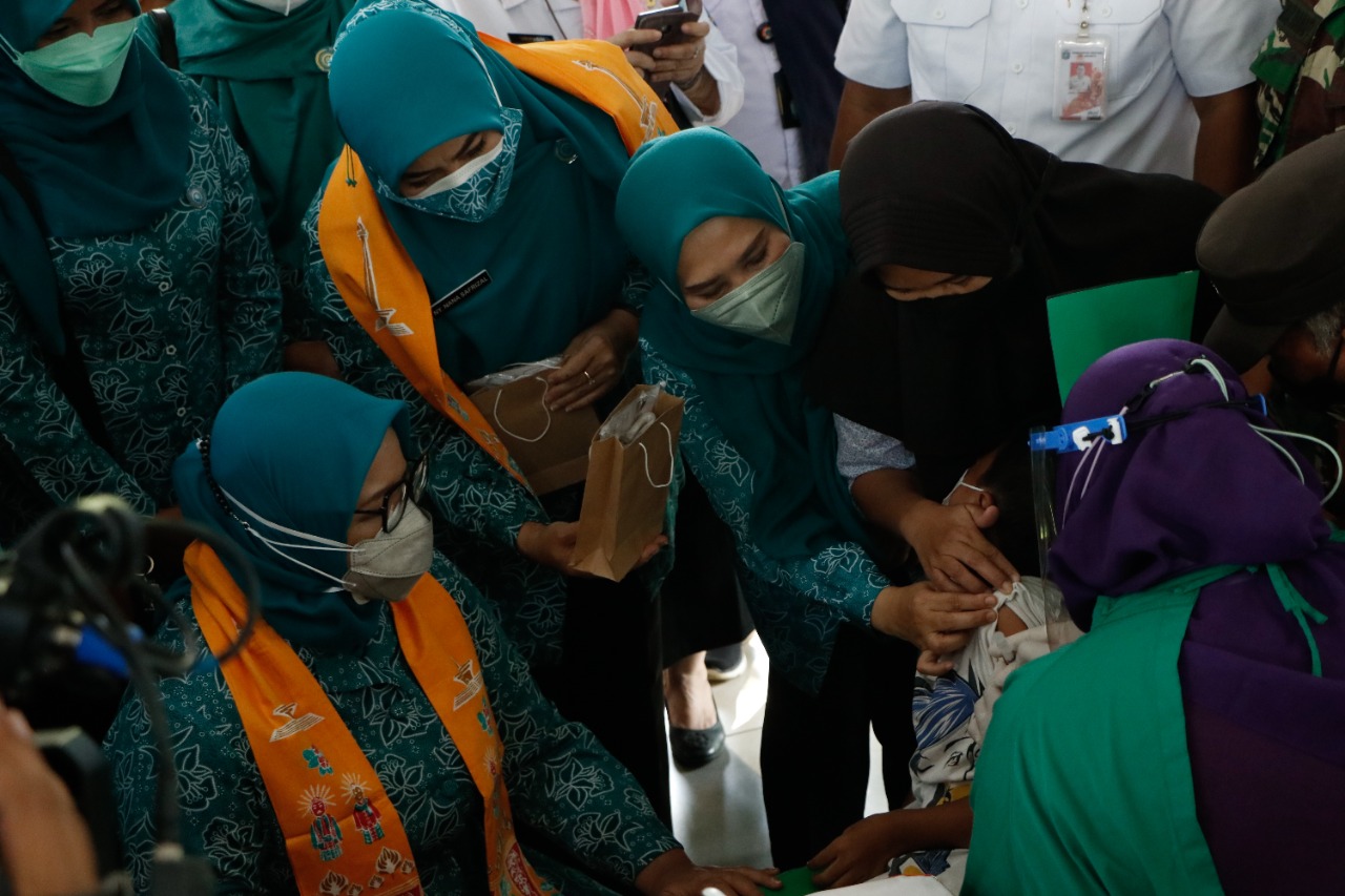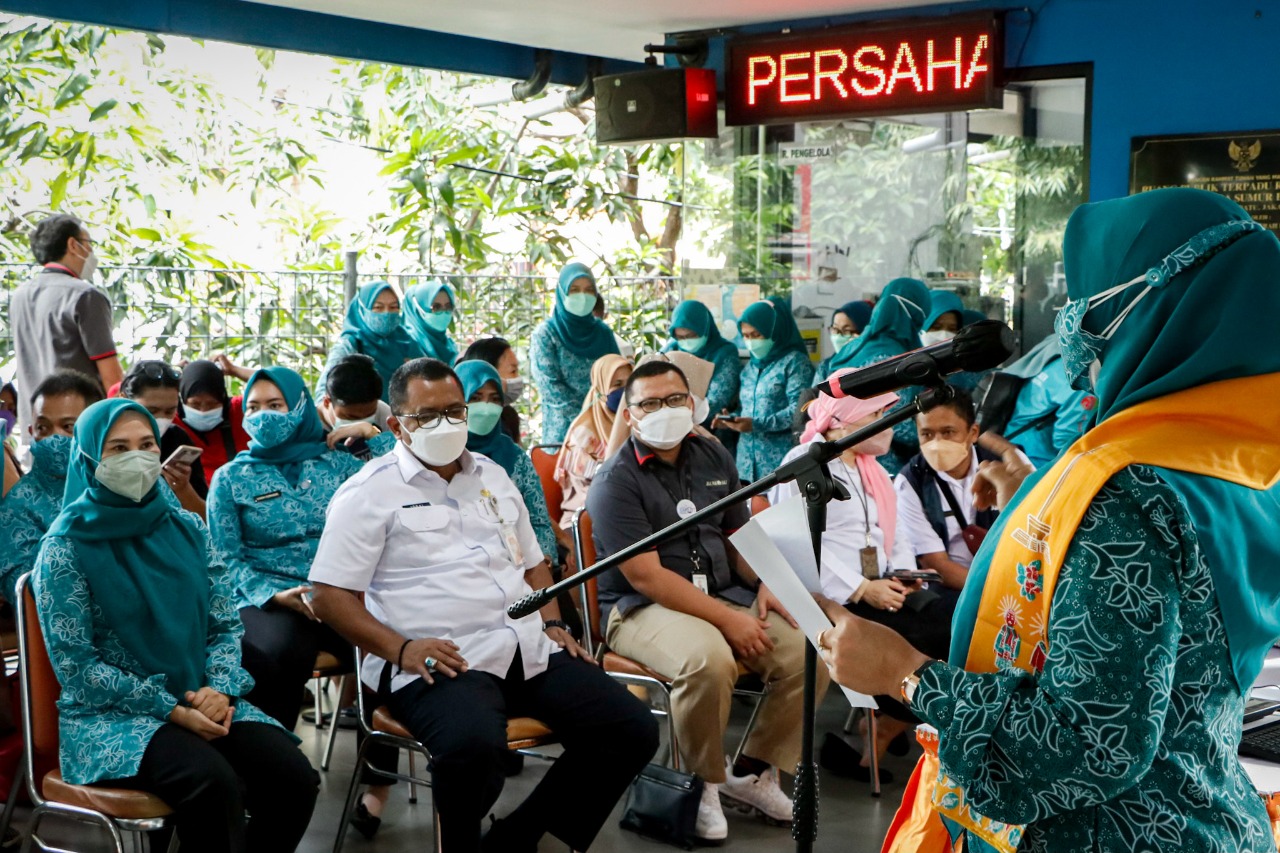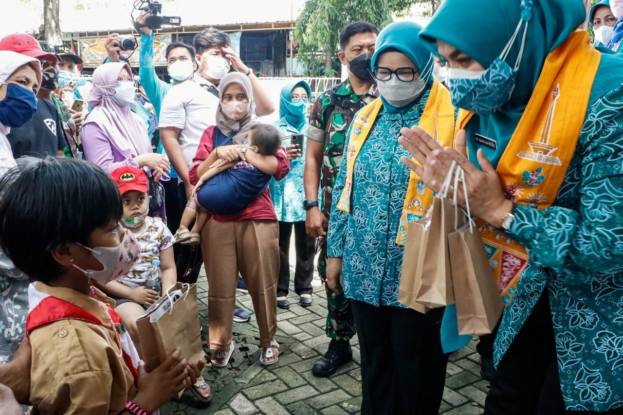 Tim Penggerak Pemberdayaan Kesejahteraan Keluarga (TP-PKK) Pusat meninjau pelaksanaan vaksinasi anak dan dosis ketiga dewasa di Ruang Publik Terpadu Ramah Anak (RPTRA) Mutiara, Sumur Batu, Rabu (9/2). Selain melihat langsung proses vaksin, TP-PKK Pusat juga menyerahkan bantuan berupa masker dan hand sanitizer.