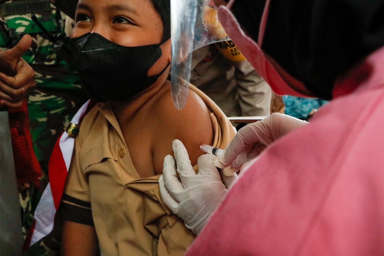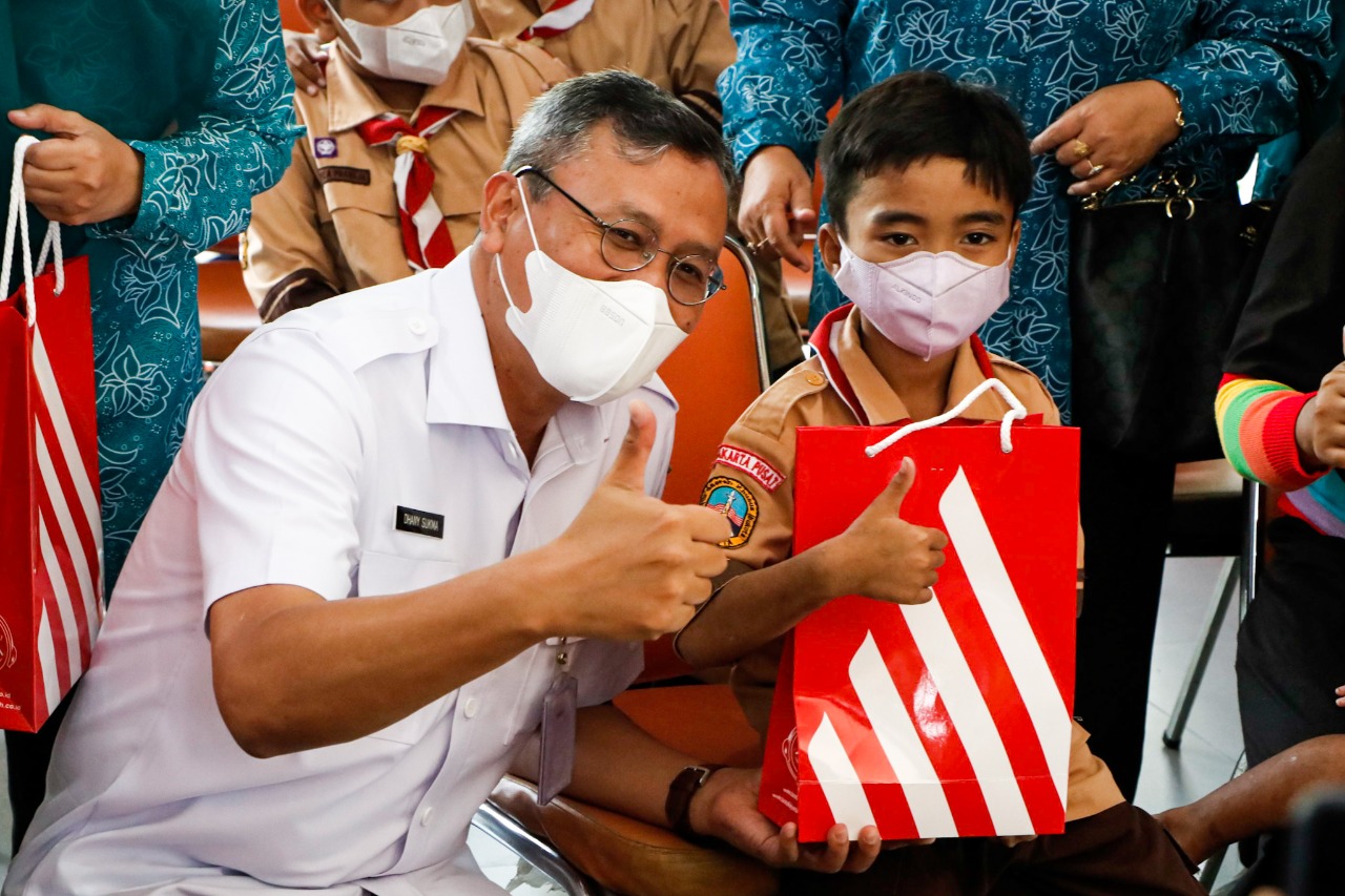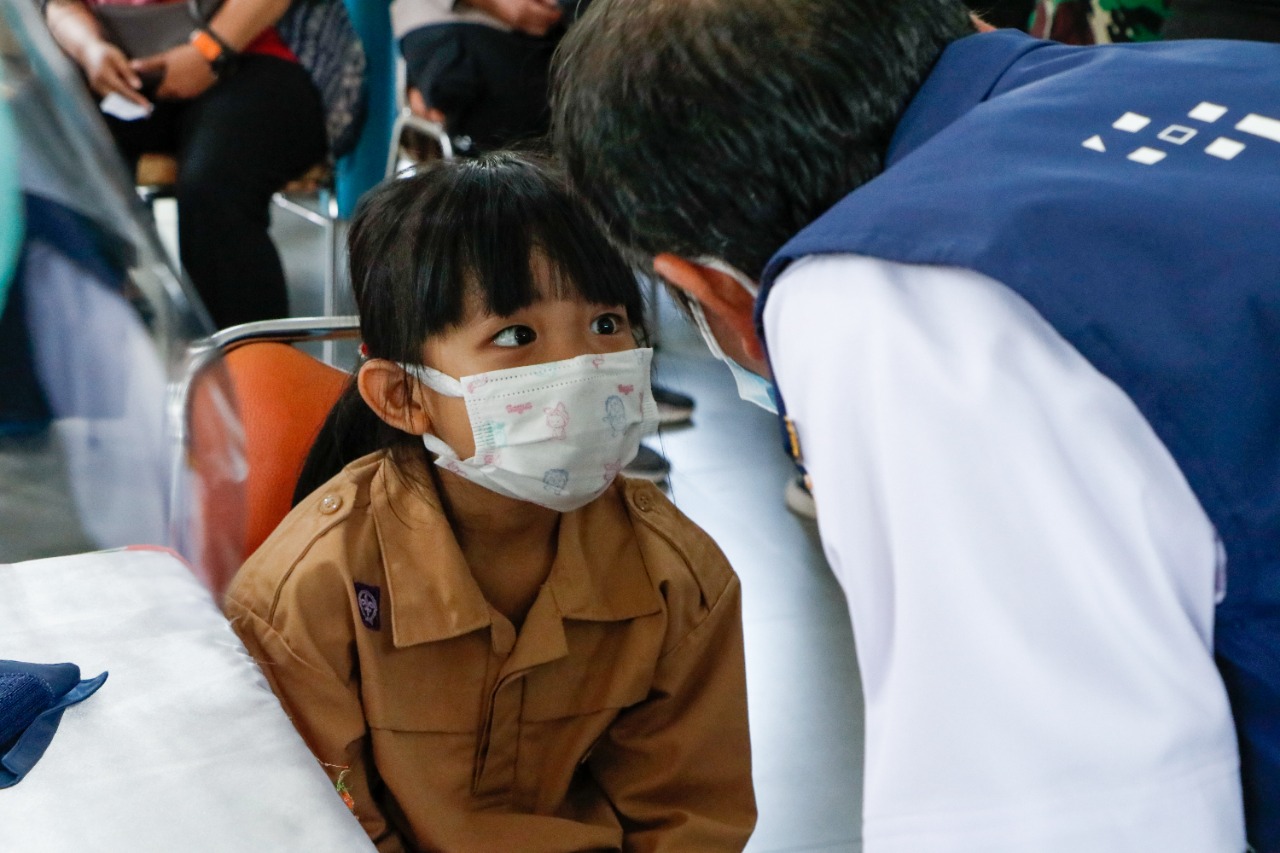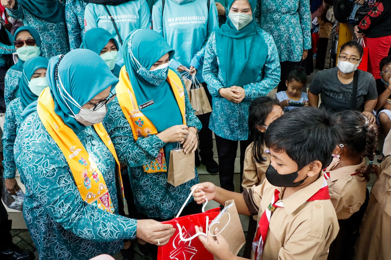 Tim Penggerak Pemberdayaan Kesejahteraan Keluarga (TP-PKK) Pusat meninjau pelaksanaan vaksinasi anak dan dosis ketiga dewasa di Ruang Publik Terpadu Ramah Anak (RPTRA) Mutiara, Sumur Batu, Rabu (9/2). Selain melihat langsung proses vaksin, TP-PKK Pusat juga menyerahkan bantuan berupa masker dan hand sanitizer.