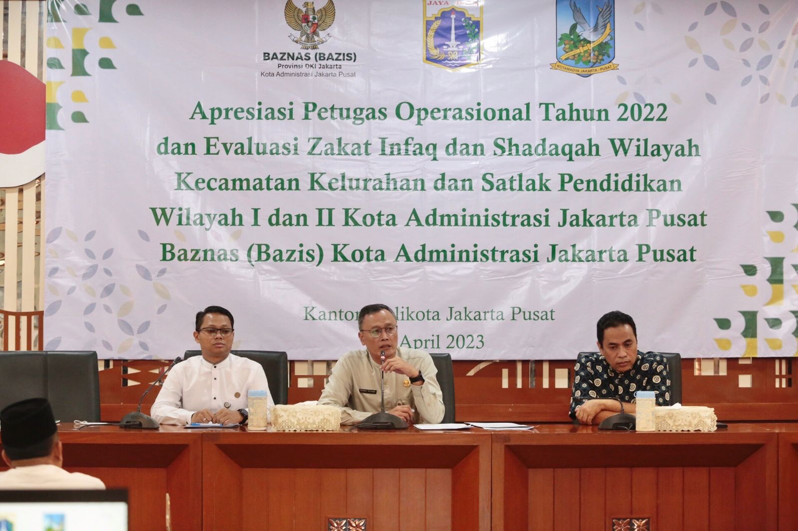 Wali Kota Administrasi Jakarta Pusat Dhany Sukma memberikan apresiasi sekaligus evaluasi kepada kelurahan dan kecamatan atas capaian zakat, infak, dan sedekah (ZIS) Jakarta Pusat di Ruang Pola, Kantor Walikota Jakarta Pusat, Jumat (14/4).