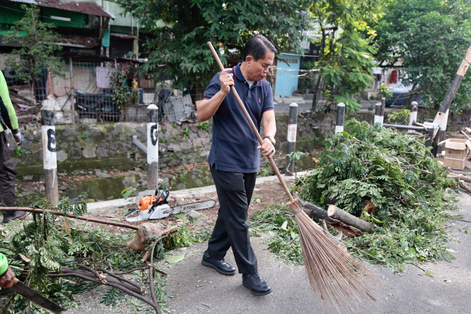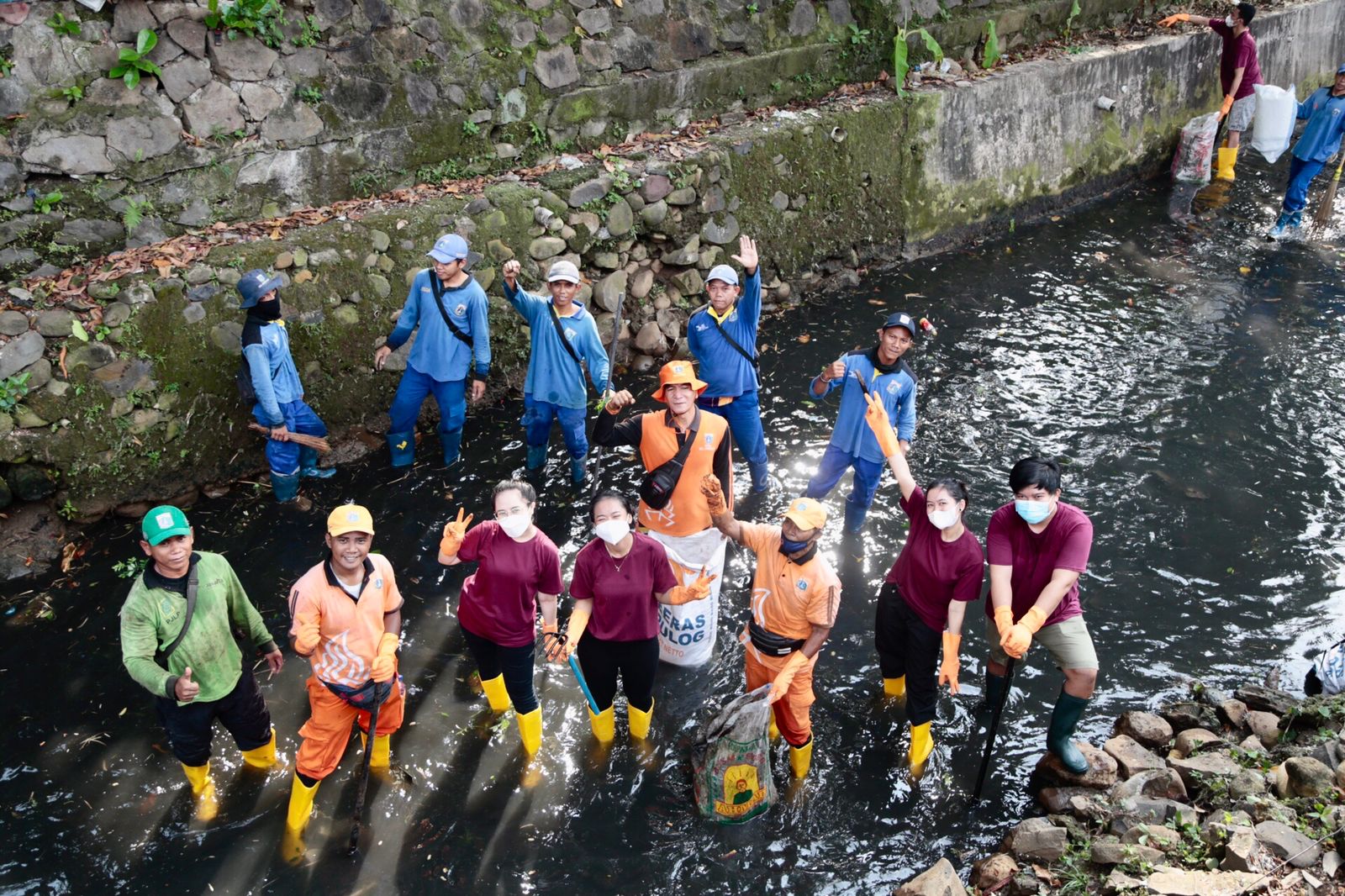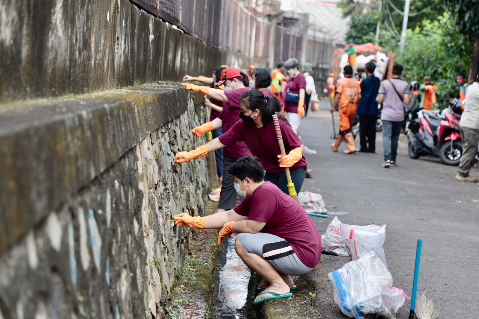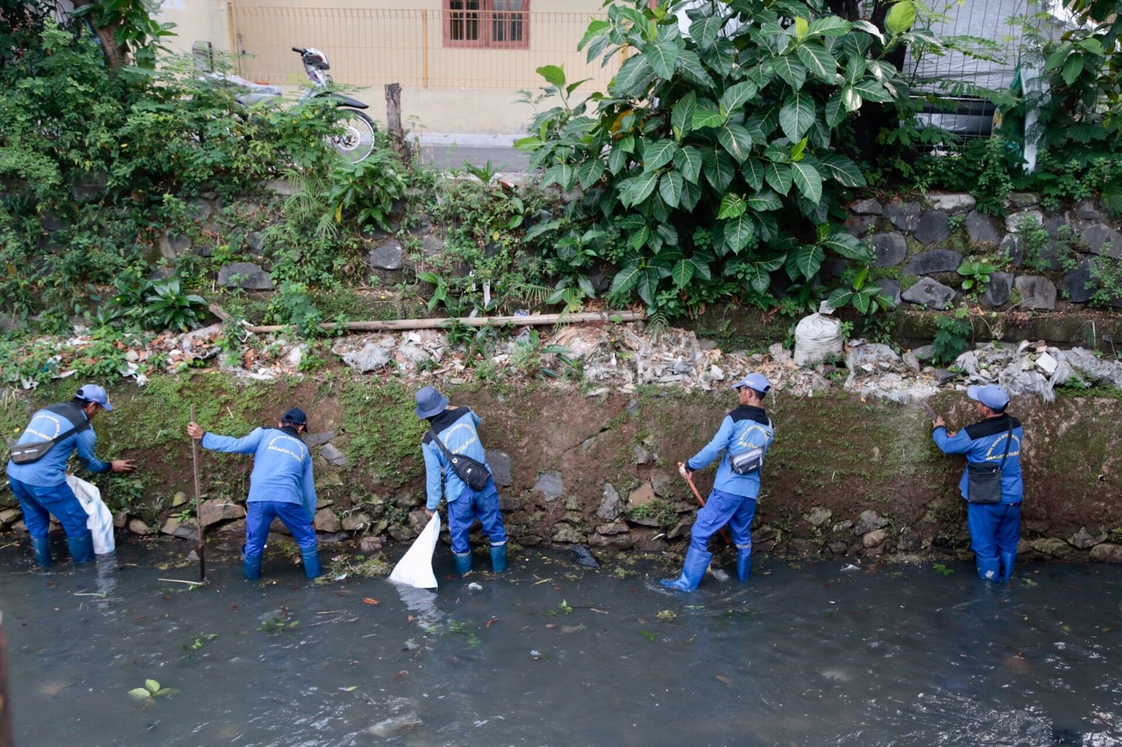 Petugas Gabungan Kelurahan Paseban berkolaborasi dengan RS St. Carolus membersihkan Kali Sentiong Salemba Bluntas, RT 01/RW 05, Kecamatan Senen, Jakarta Pusat, Jumat (28/4).