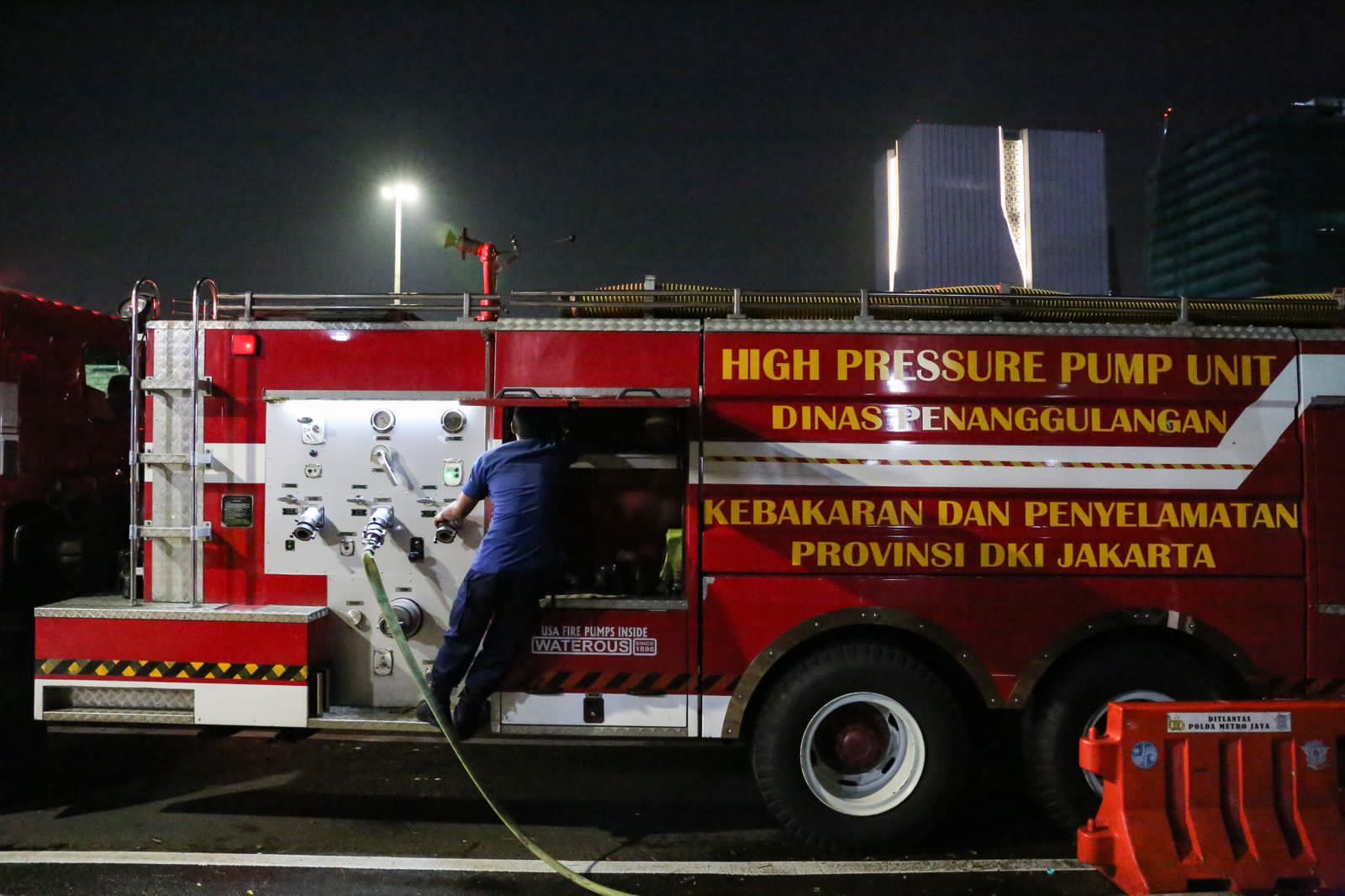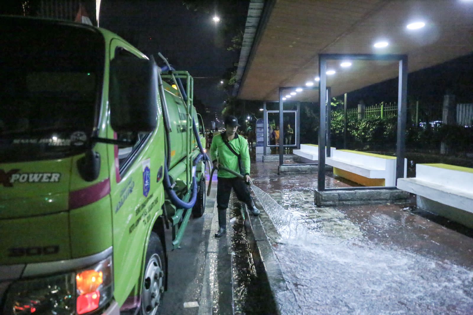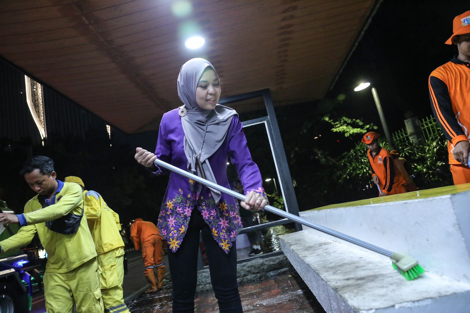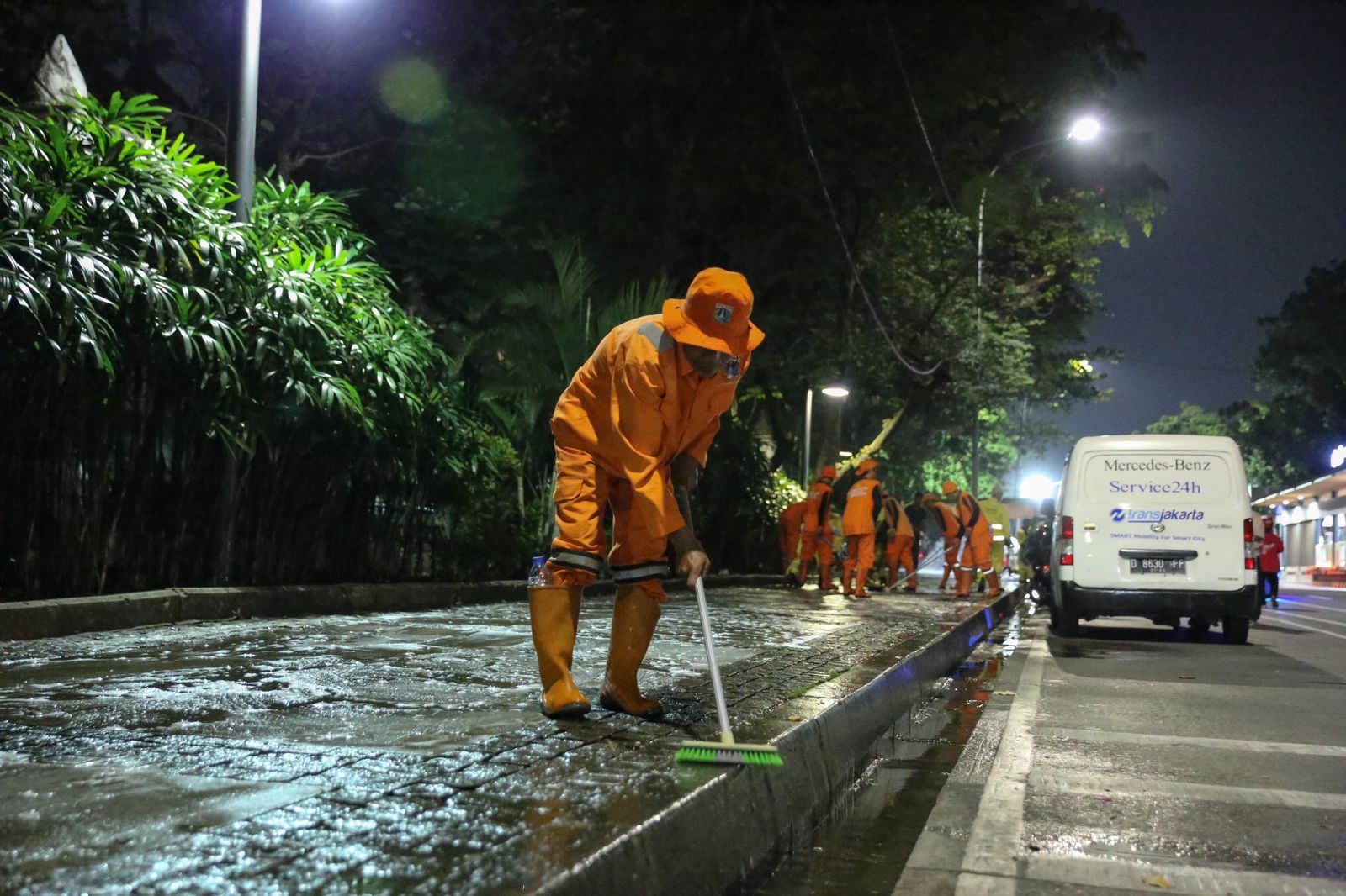 Bersih-bersih sarana dan prasarana umum di Jalan Medan Merdeka