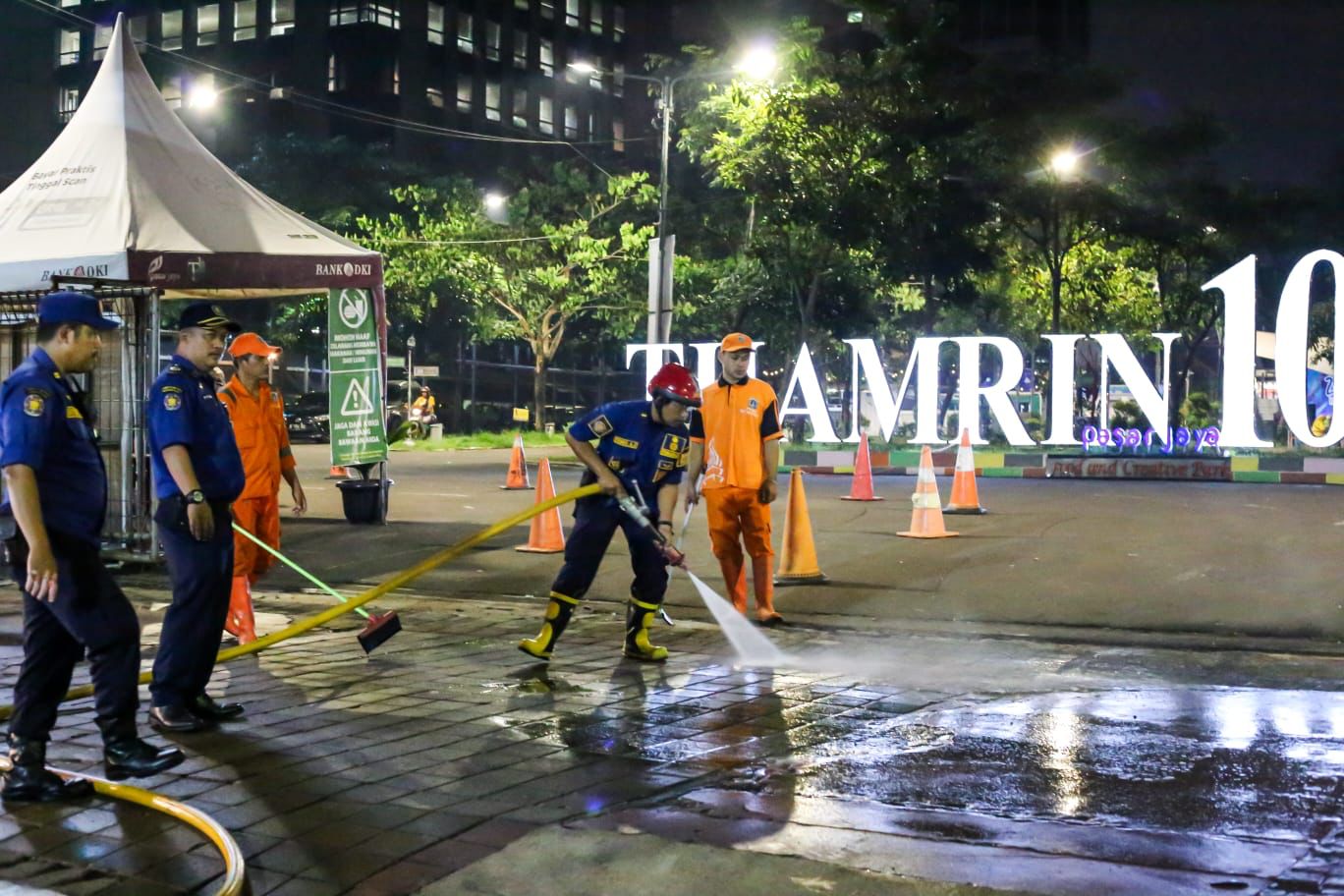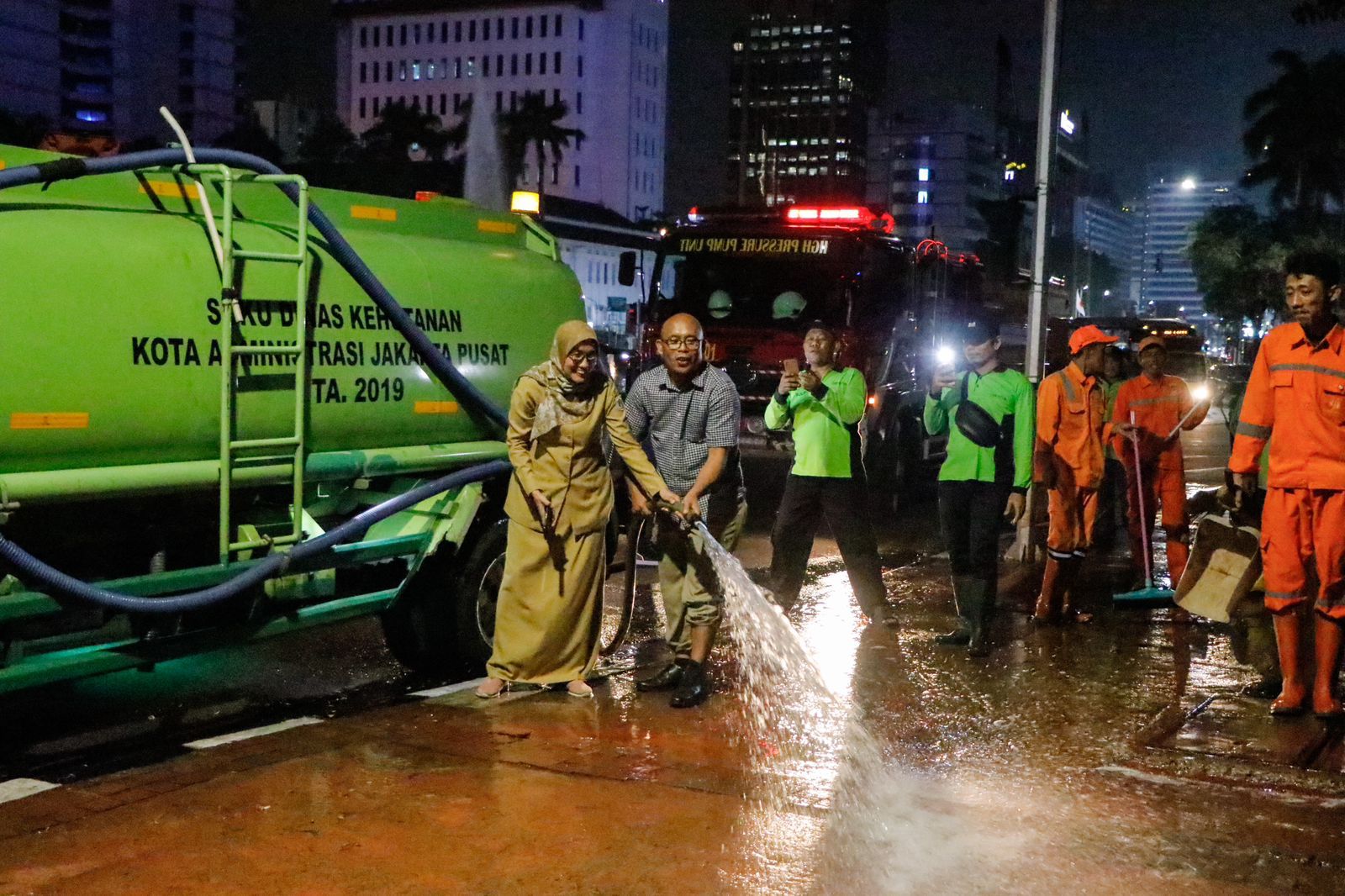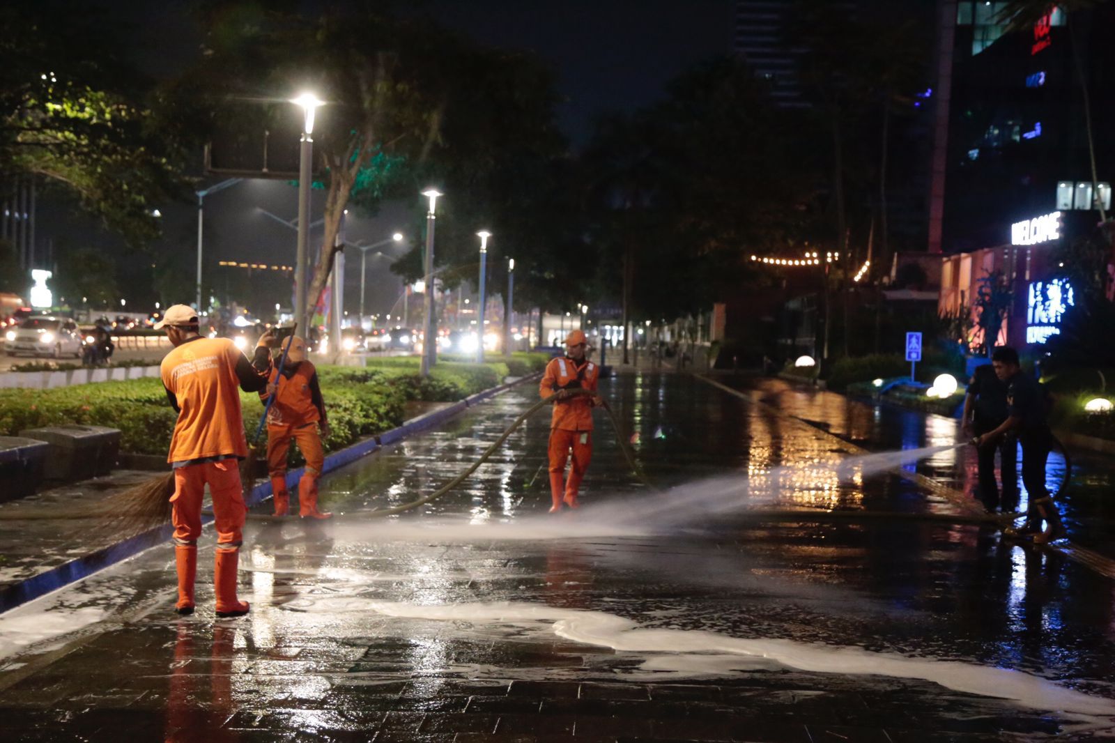 Penerintah Kota Administrasi Jakarta Pusat menggelar kegiatan bersih-bersih trotoar di sekitar kawasan Bundaran HI hingga simpang Kebon Sirih, depan Mal FX Sudirman, dan kawasan Patung Kuda hingga Harmoni, pada Selasa (20/6) malam.