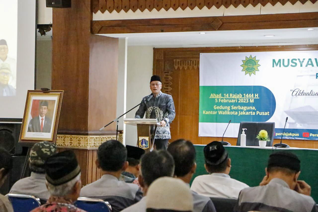 Wali Kota Administrasi Jakarta Pusat Dhany Sukma menghadiri Musyawarah Kerja Daerah (Mukerda) I PD Persatuan Islam (Persis) Jakarta Pusat di Ruang Serbaguna Utama, Kantor Wali Kota Administrasi Jakarta Pusat, Gambir, Minggu (5/2).