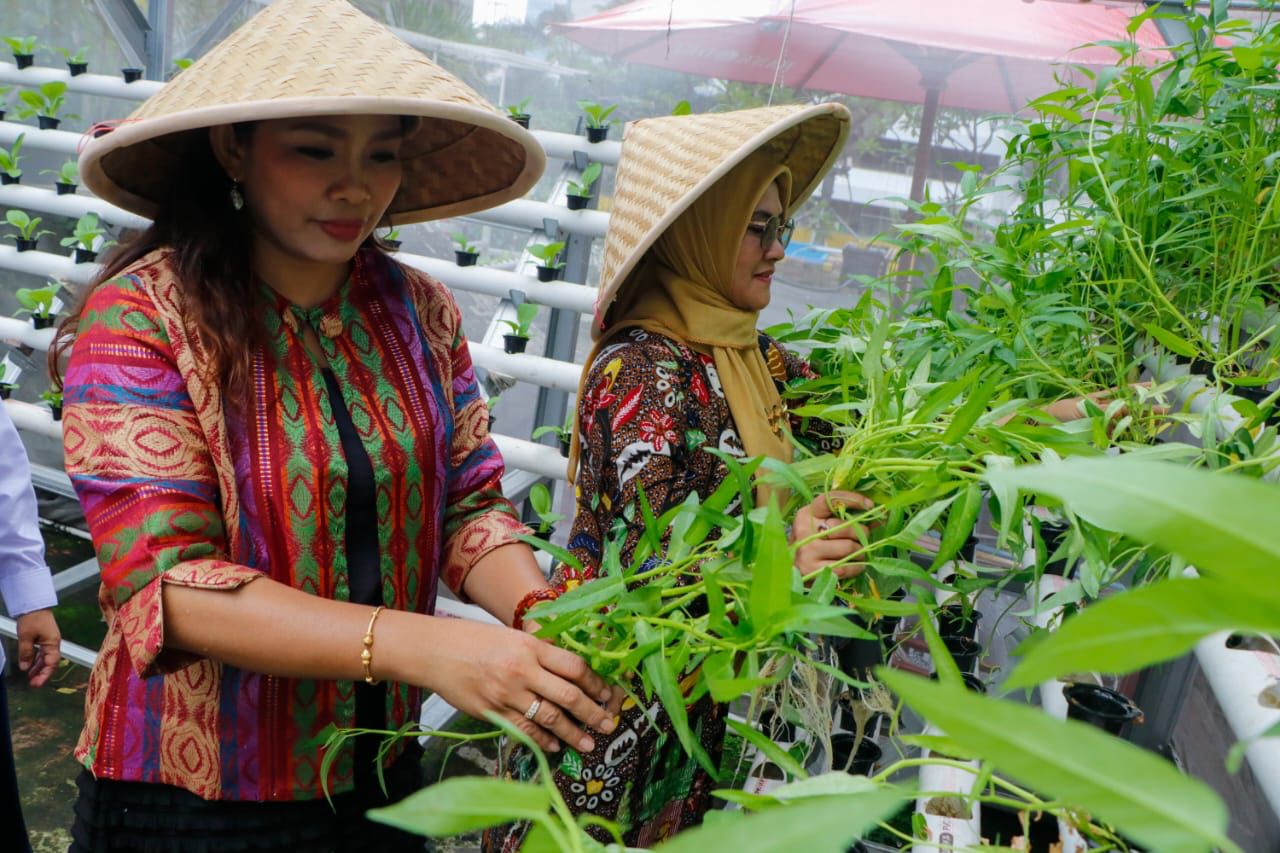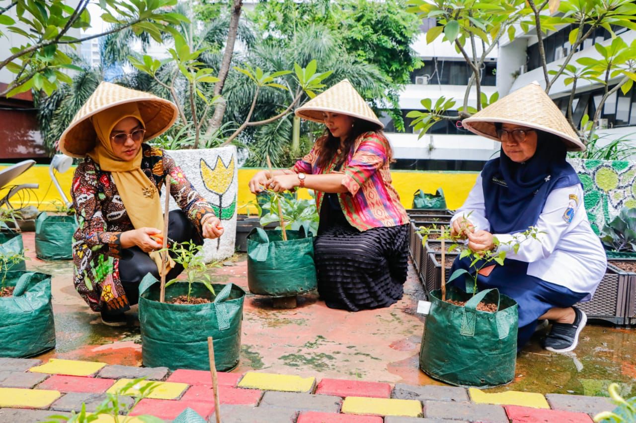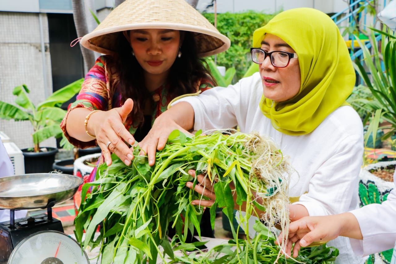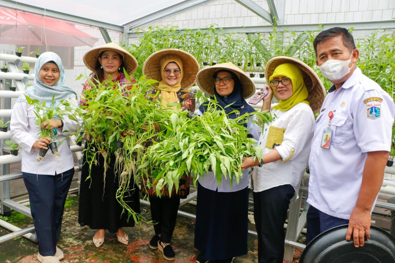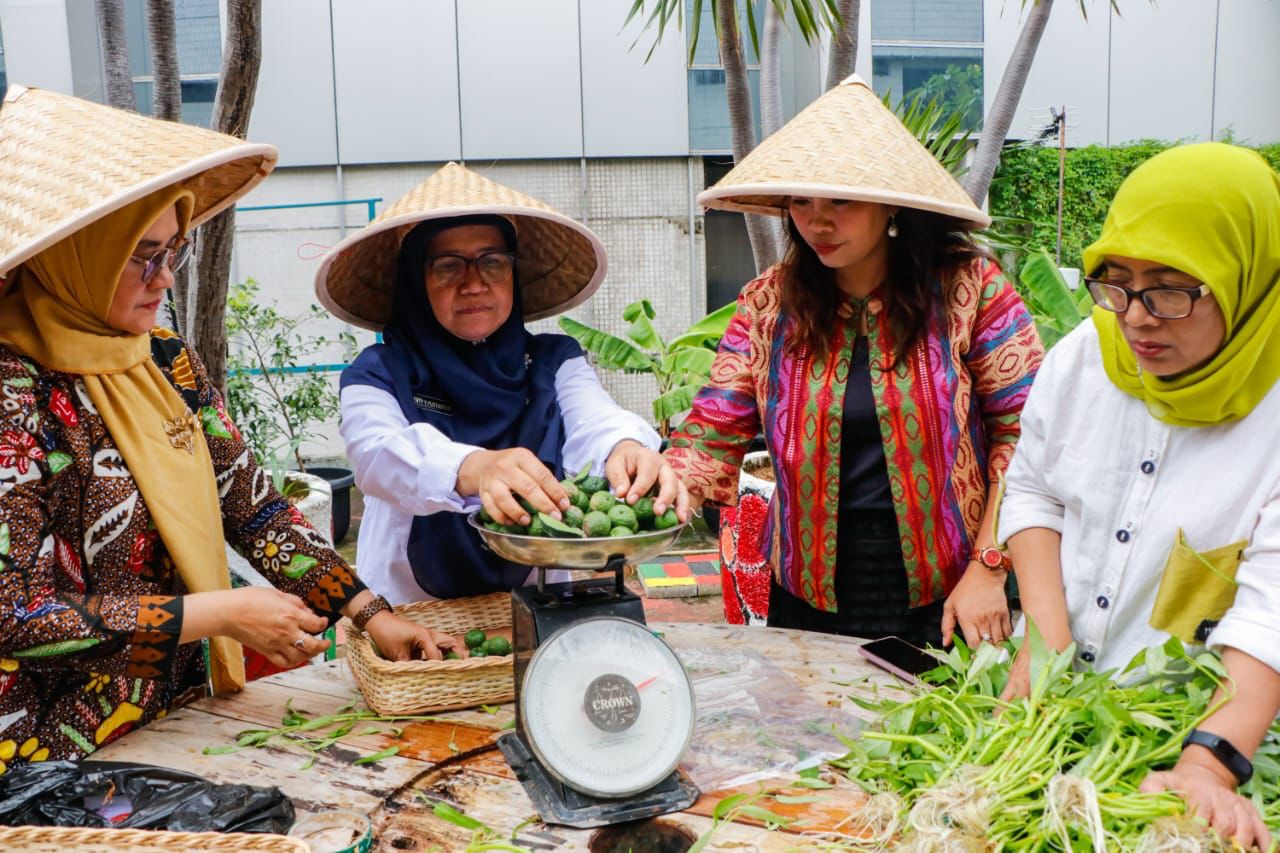 Ketua TP PKK Jakarta Pusat Ucu Jamillah didampingi Wakil III Bidang Ketahanan Pangan Keluarga Isma Marsella Ginting dan Kepala Sudin KPKP Jakarta Pusat Penty Yunesi Pudyastuti memanen berbagai tanaman yang bisa meningkatkan ketahanan pangan di Rooftop Kantor Wali Kota Jakarta Pusat, Selasa (22/2).