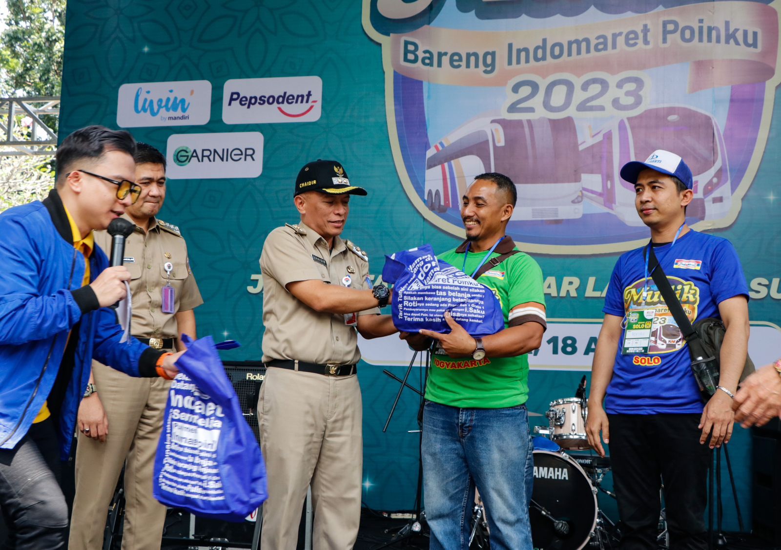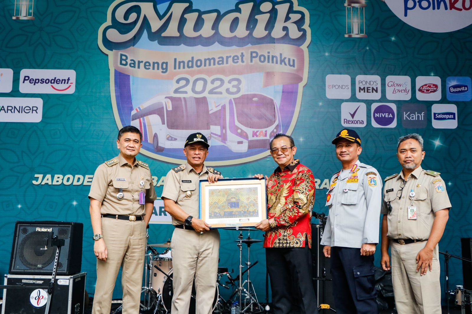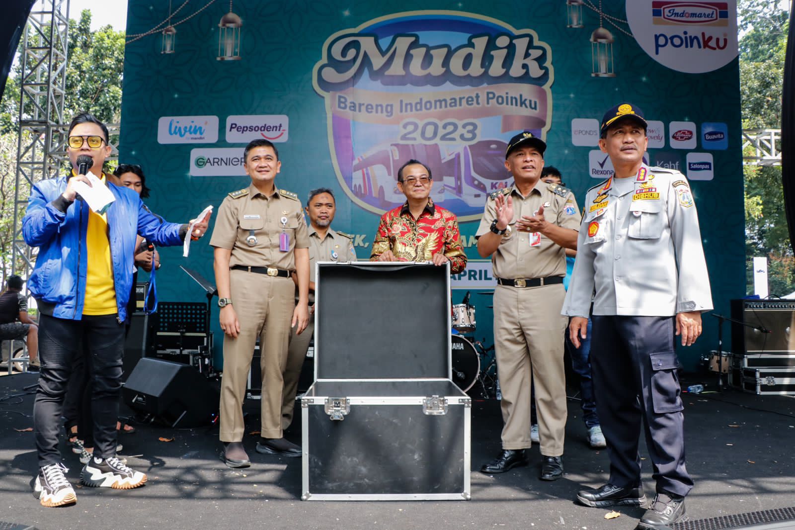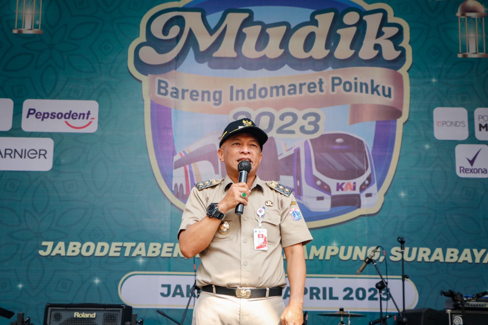 Wakil Wali Kota Administrasi Jakarta Pusat Chaidir melepas keberangkatan peserta mudik gratis menggunakan bus yang diselenggarakan perusahaan ritel Indomaret, di area Parkir Timur Senayan, Kompleks Gelora Bung Karno (GBK), Kecamatan Tanah Abang, Selasa (18/4).