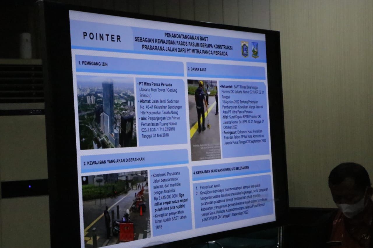 Pemerintah Kota Administrasi Jakarta Pusat melakukan penandatanganan Berita Acara Serah Terima (BAST) kepada PT Mitra Panca Persada terkait sebagian kewajiban fasilitas umum-fasilitas sosial (fasos fasum) berupa konstruksi prasarana jalan.?