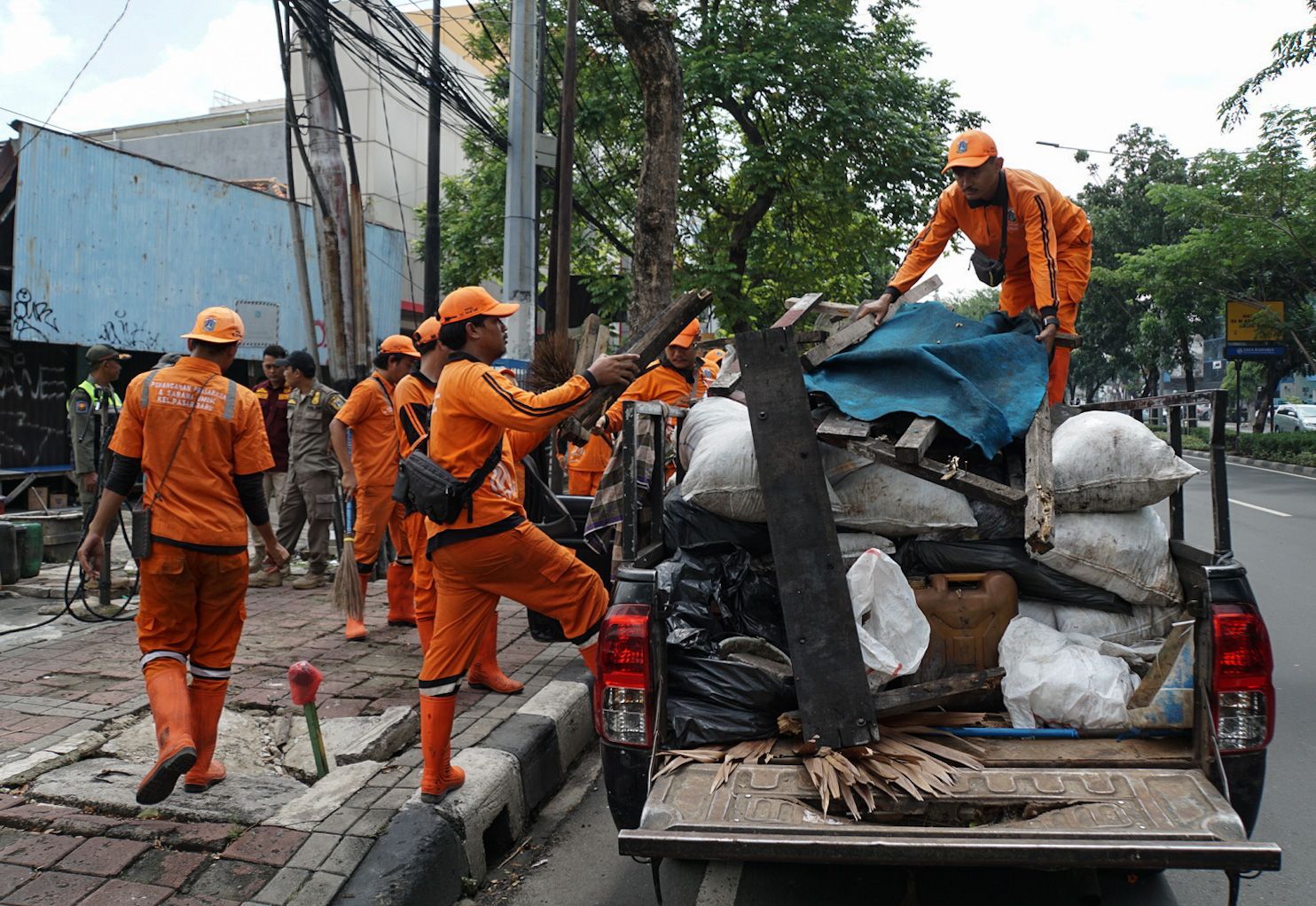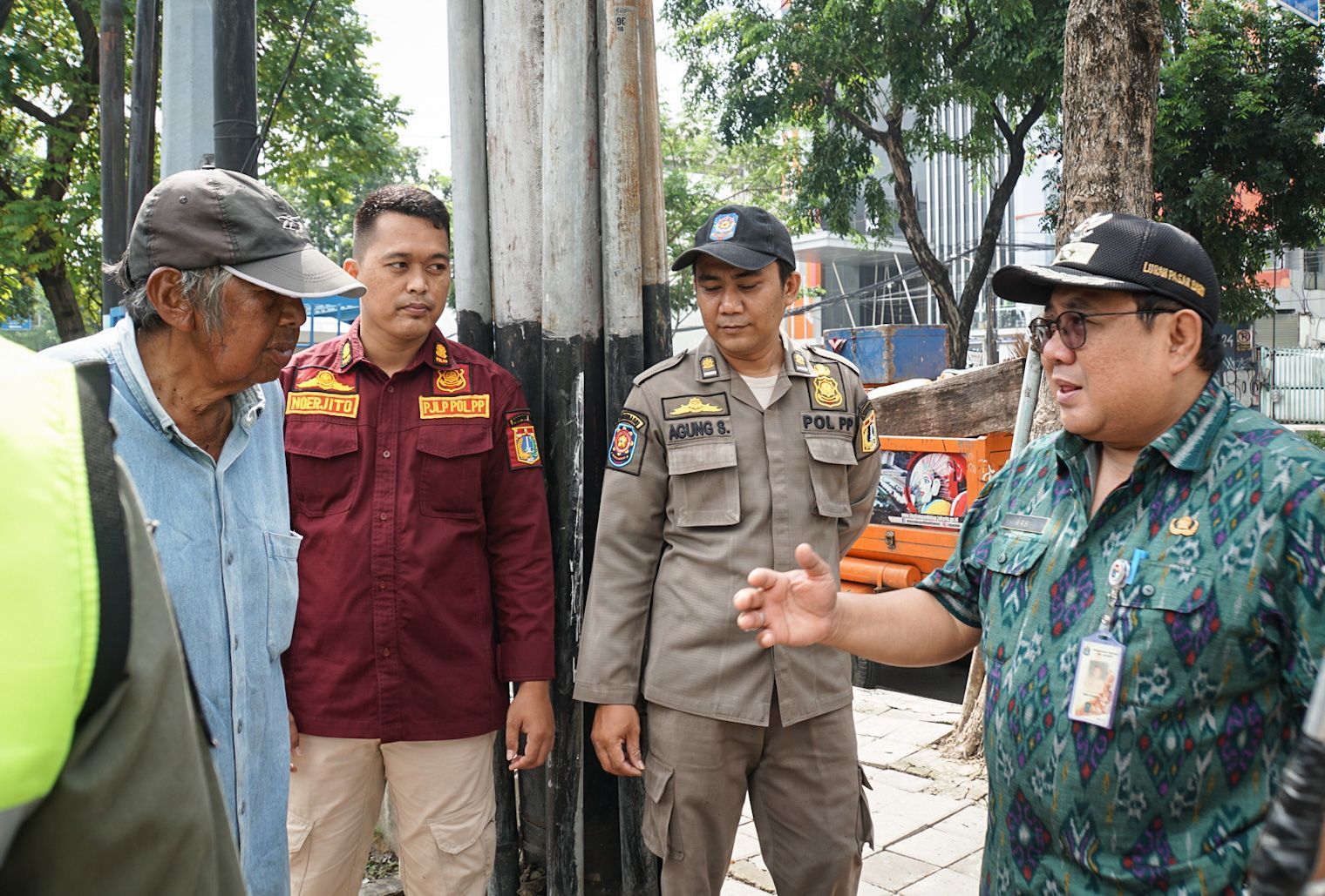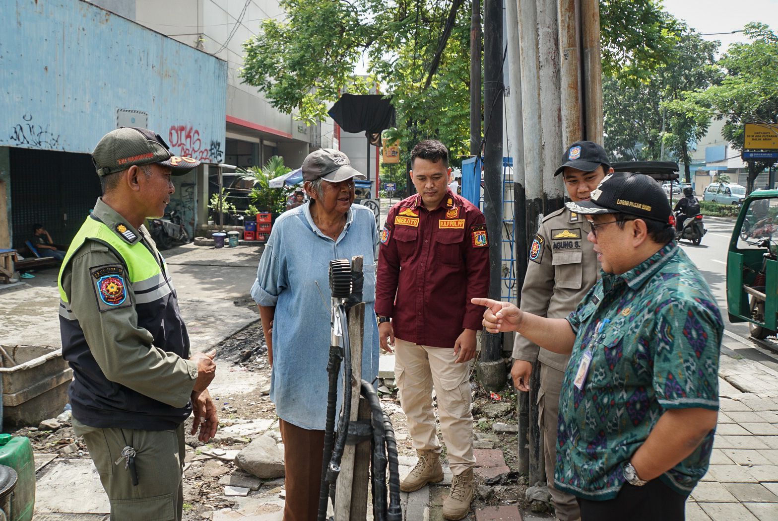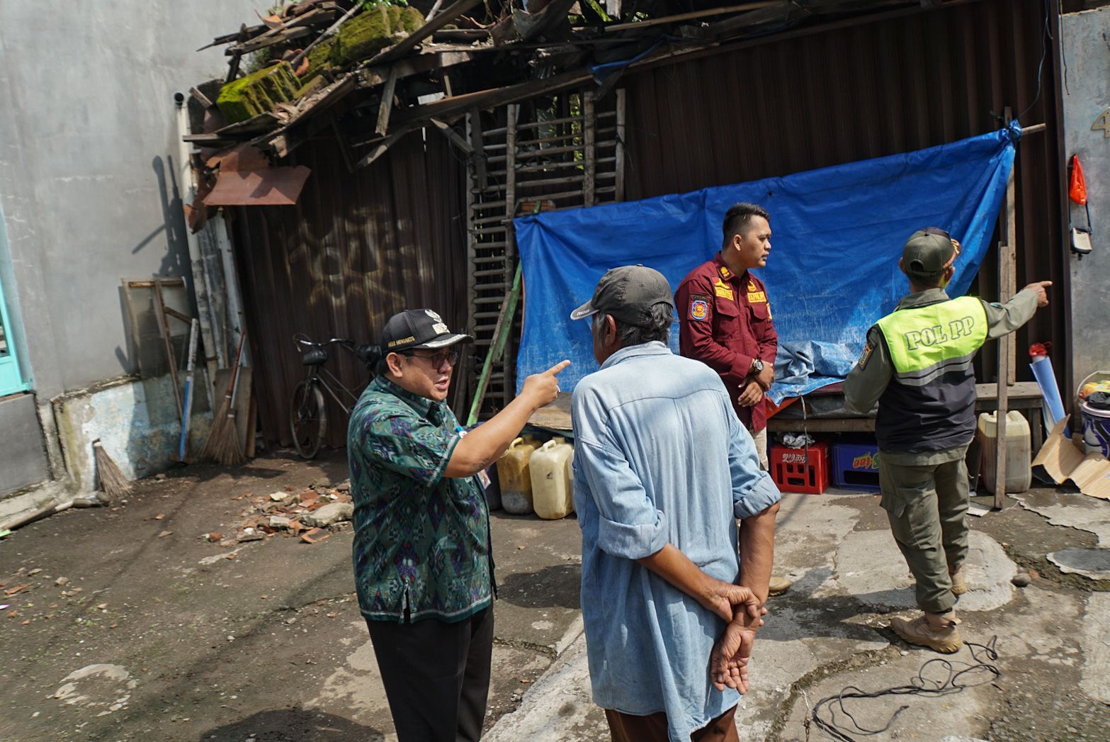 Petugas gabungan Kelurahan Pasar Baru melakukan sosialisasi dan penertiban terhadap seorang bukan warga DKI Jakarta yang berdagang dan tinggal di emper toko, Jalan Samanhudi, Kecamatan Sawah Besar, Kamis (30/3).