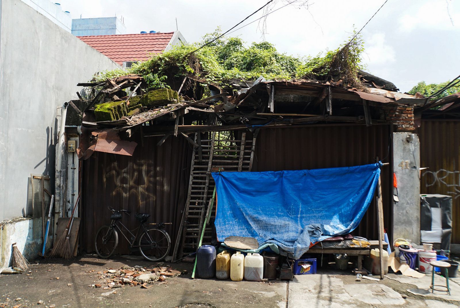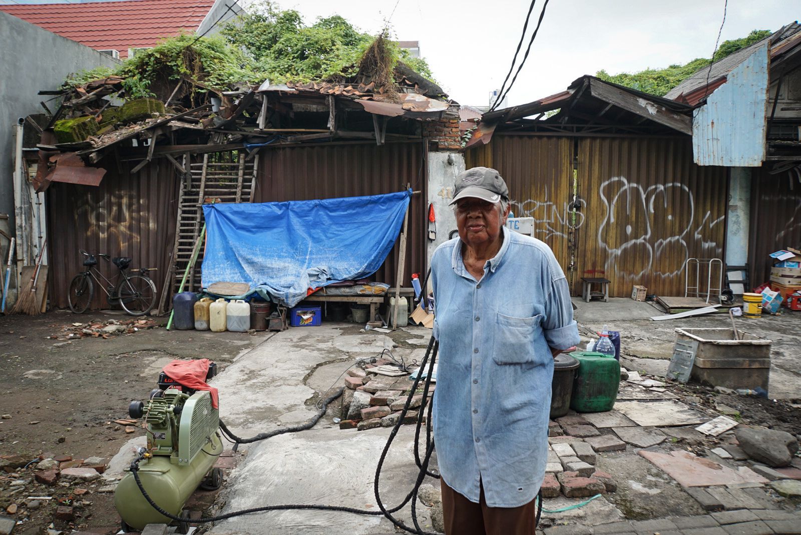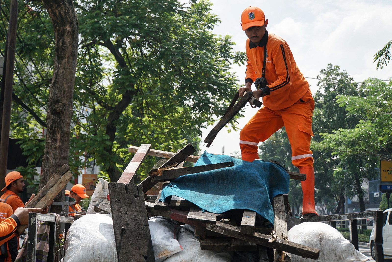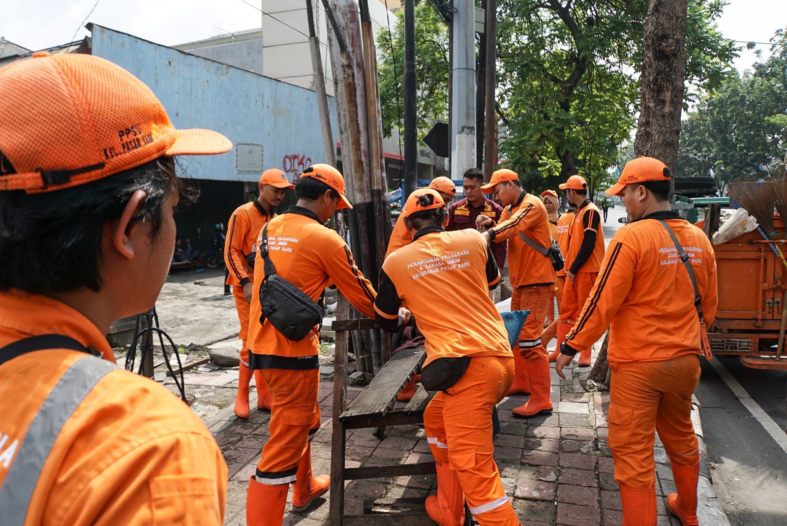 Petugas gabungan Kelurahan Pasar Baru melakukan sosialisasi dan penertiban terhadap seorang bukan warga DKI Jakarta yang berdagang dan tinggal di emper toko, Jalan Samanhudi, Kecamatan Sawah Besar, Kamis (30/3).