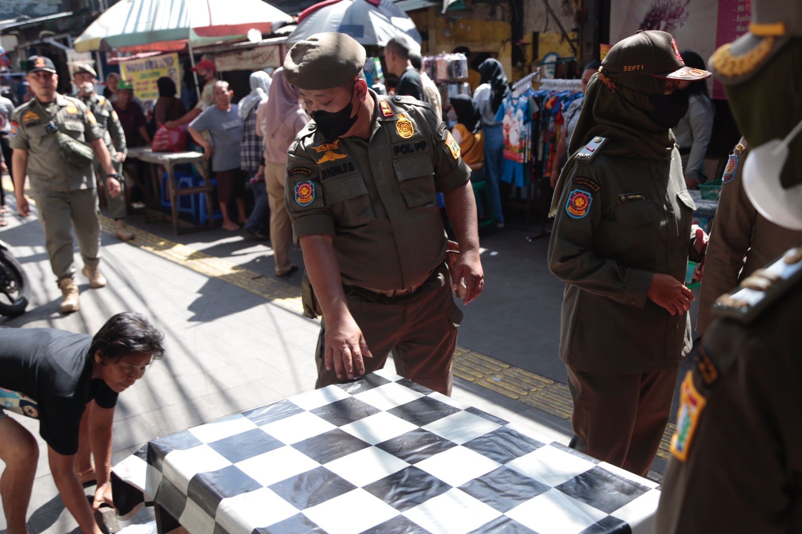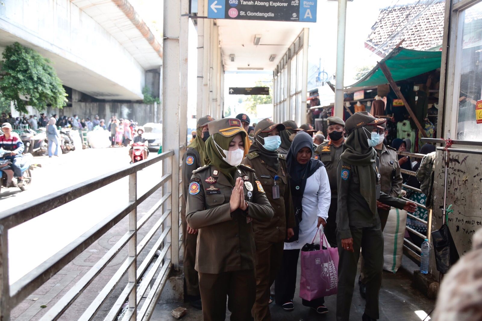 Srikandi Satuan Polisi Pamongn Praja (Satpol PP) Kota Administrasi Jakarta Pusat melaksanakan pengamanan dari gangguan ketentraman dan ketertiban umum (trantibum) di kawasan Pasar Tanah Abang, Senin (17/4).
