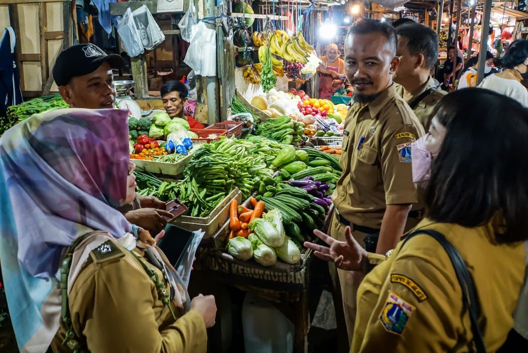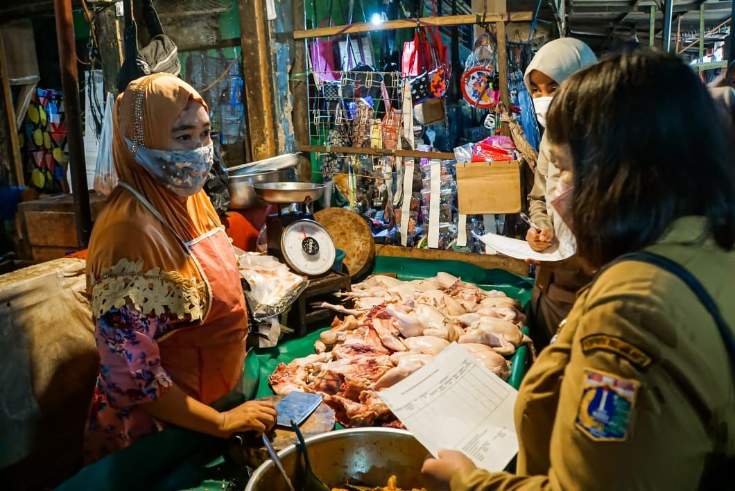 Menjelang Hari Raya Idulfitri, Kelurahan Kartini bersama Kasatpel Ketahanan Pangan, Kelautan dan Pertanian, dan jajaran Kecamatan Sawah Besar melakukan pengecekan serta memastikan ketersediaan daging ayam dan daging sapi di Pasar Timbul Kartini, Jakarta Pusat, Senin (10/4).