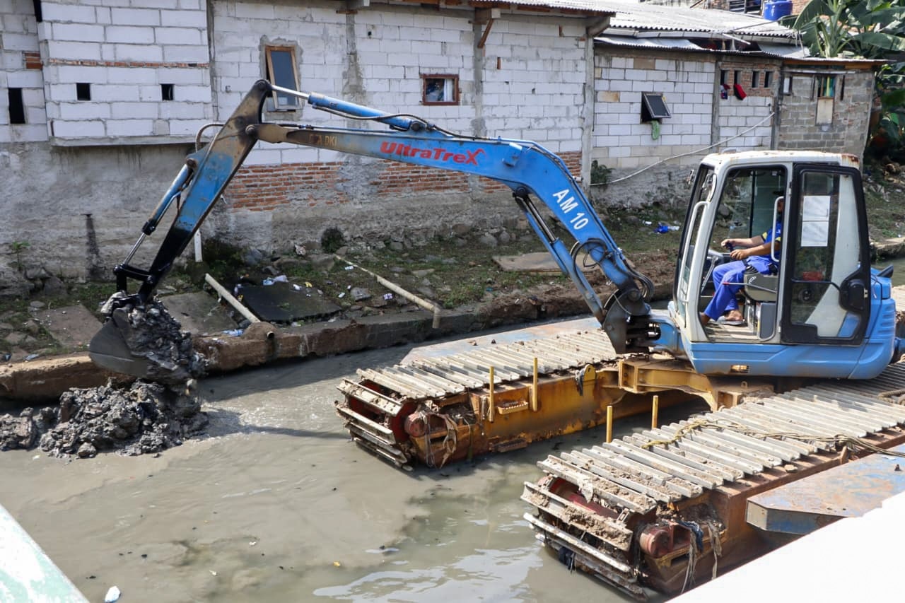 Guna mengantisipasi terjadinya genangan air dan banjir, Suku Dinas Sumber Daya Air (SDA) bersama Satpel SDA Kecamatan Kemayoran melakukan pengerukkan dengan menggunakan dua excavator amfibi di Kali Utan Kayu, Jakarta Pusat, Kamis (12/1) pagi.
