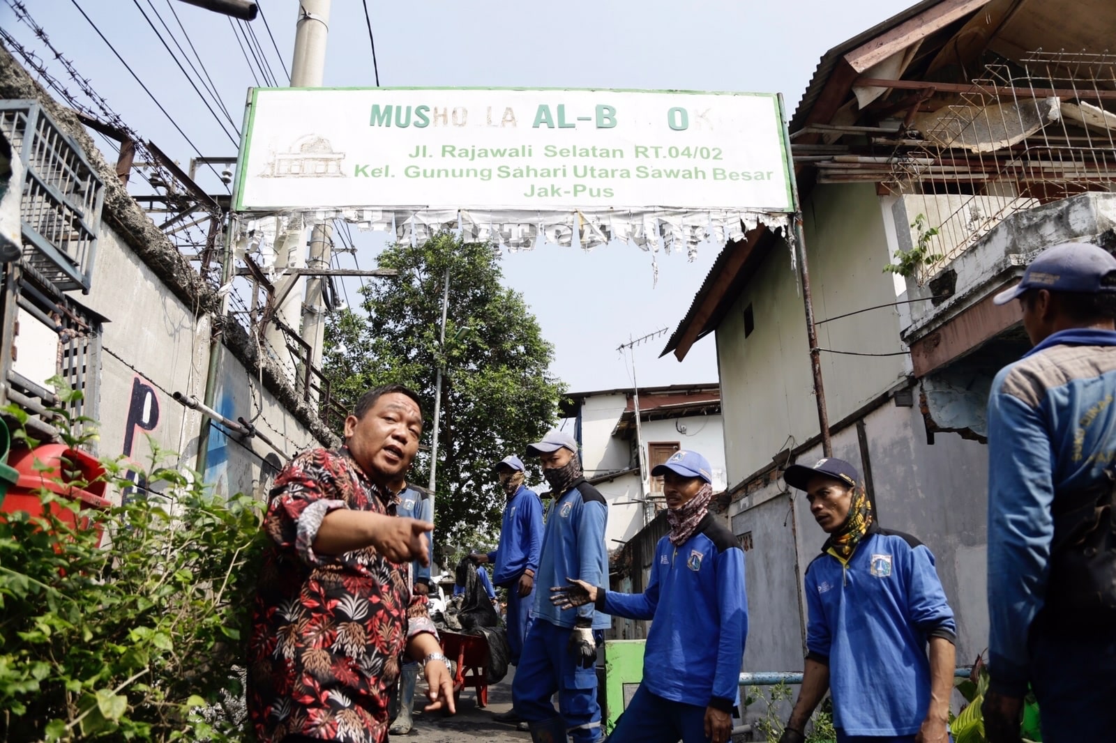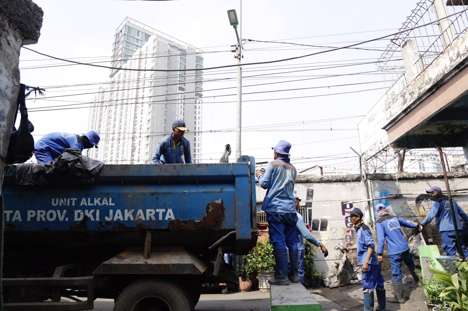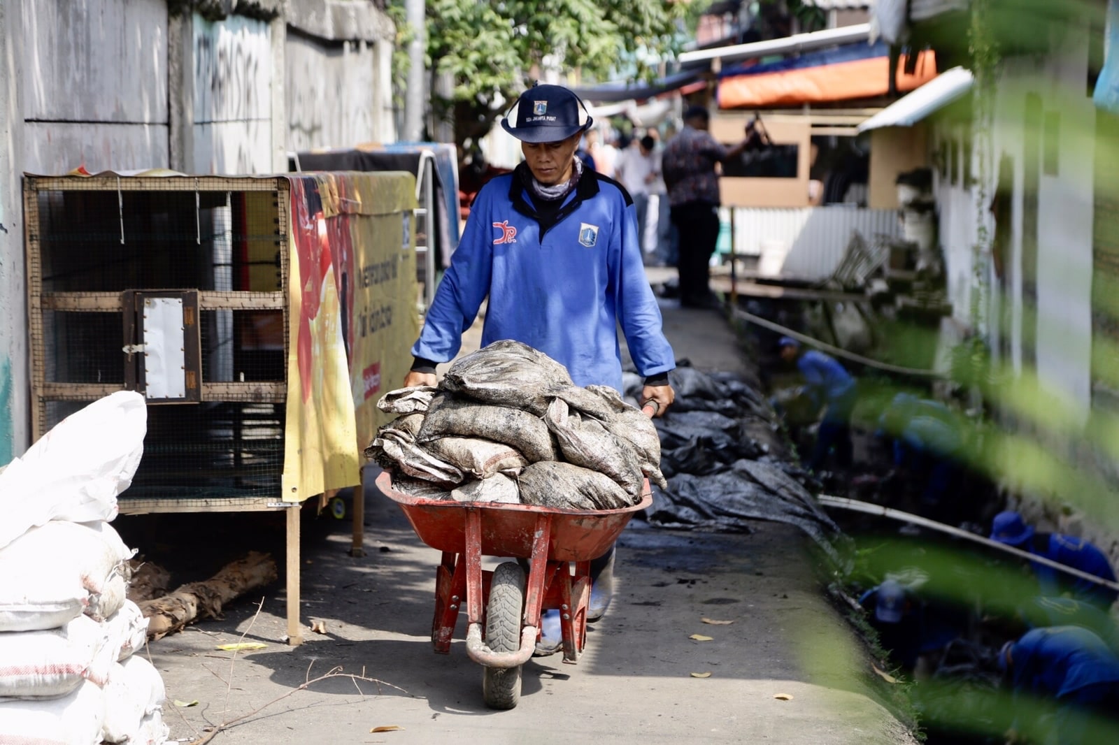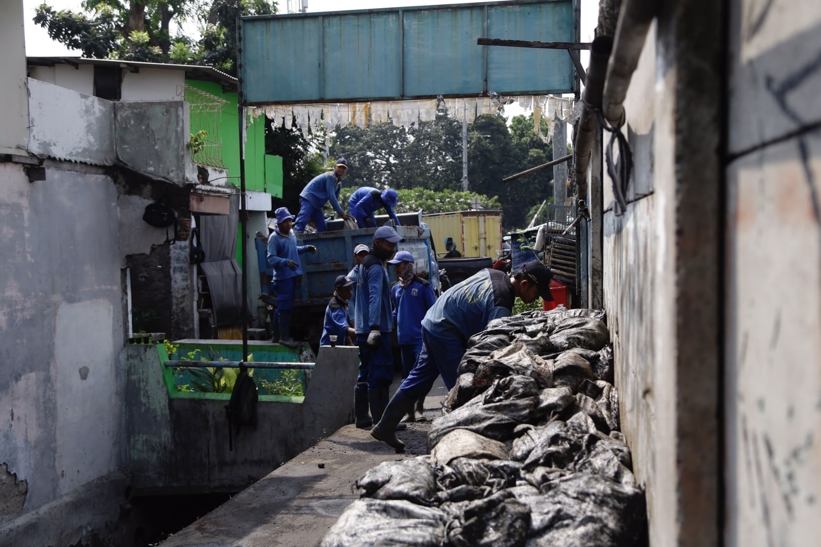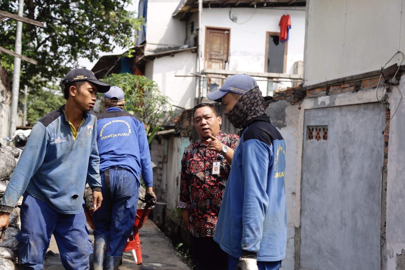 Kasatpel Sumber Daya Air (SDA) Kecamatan Sawah Besar melakukan pengerukan saluran penghubung (PHB), di Jalan Rajawali Selatan 1, Kelurahan Gunung Sahari Utara, Jakarta Pusat, Kamis (12/1).