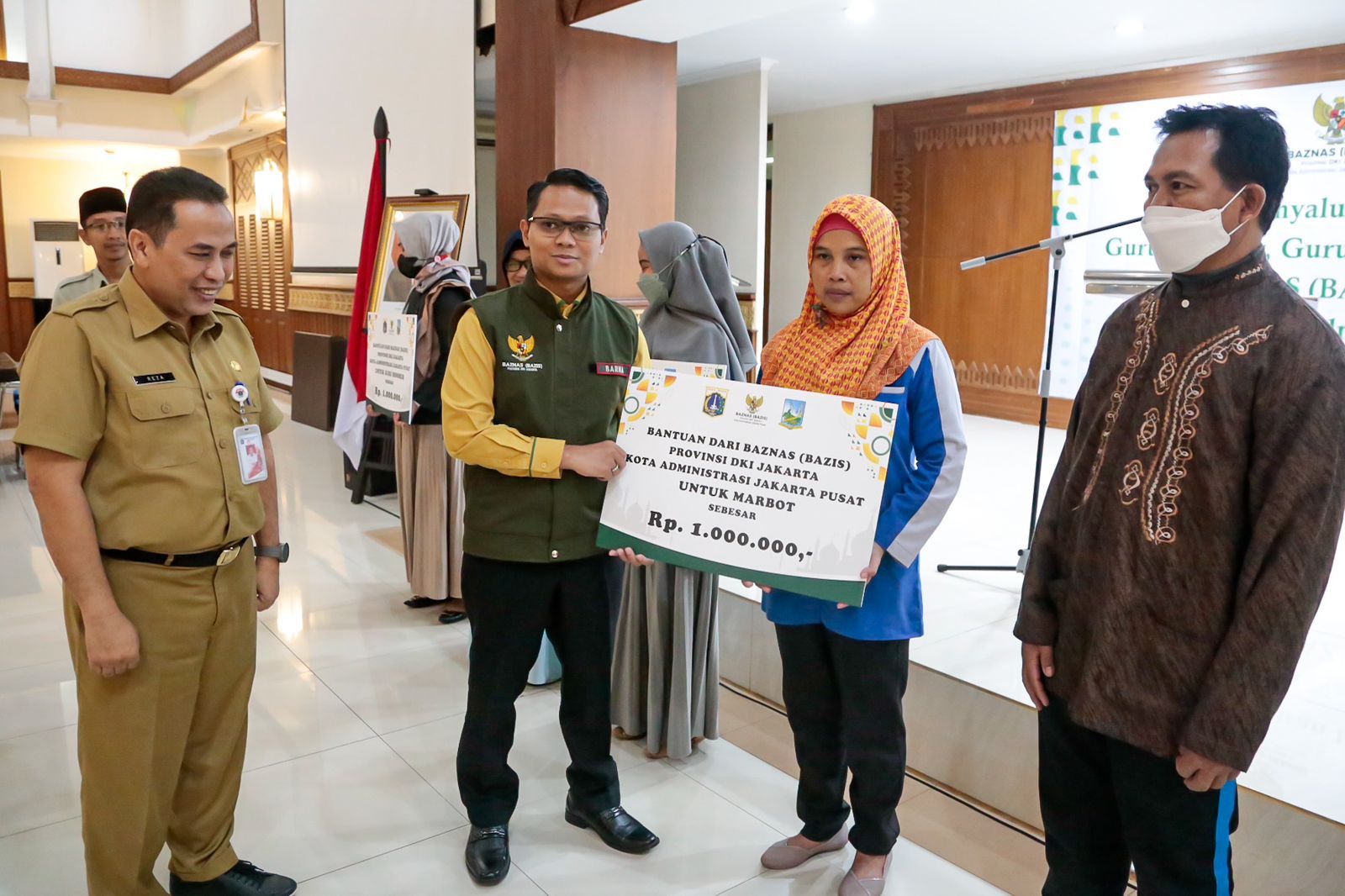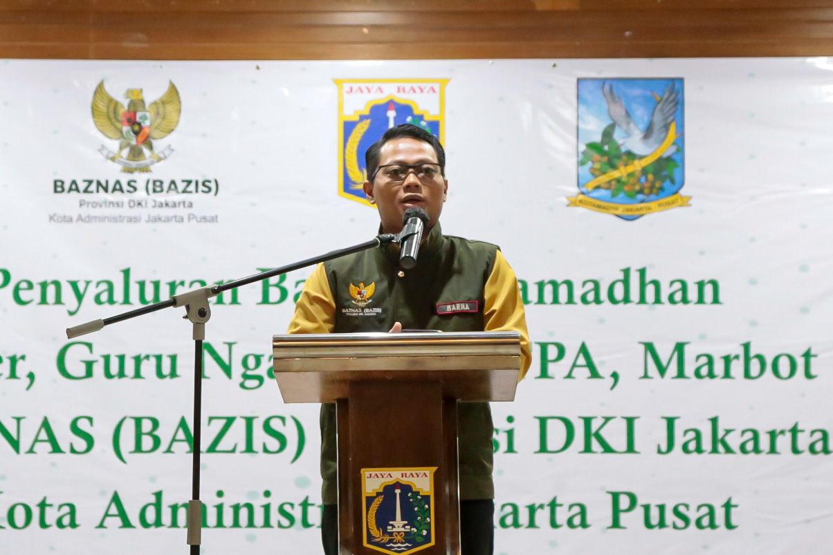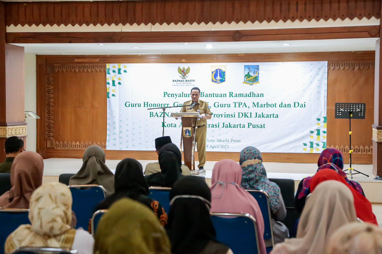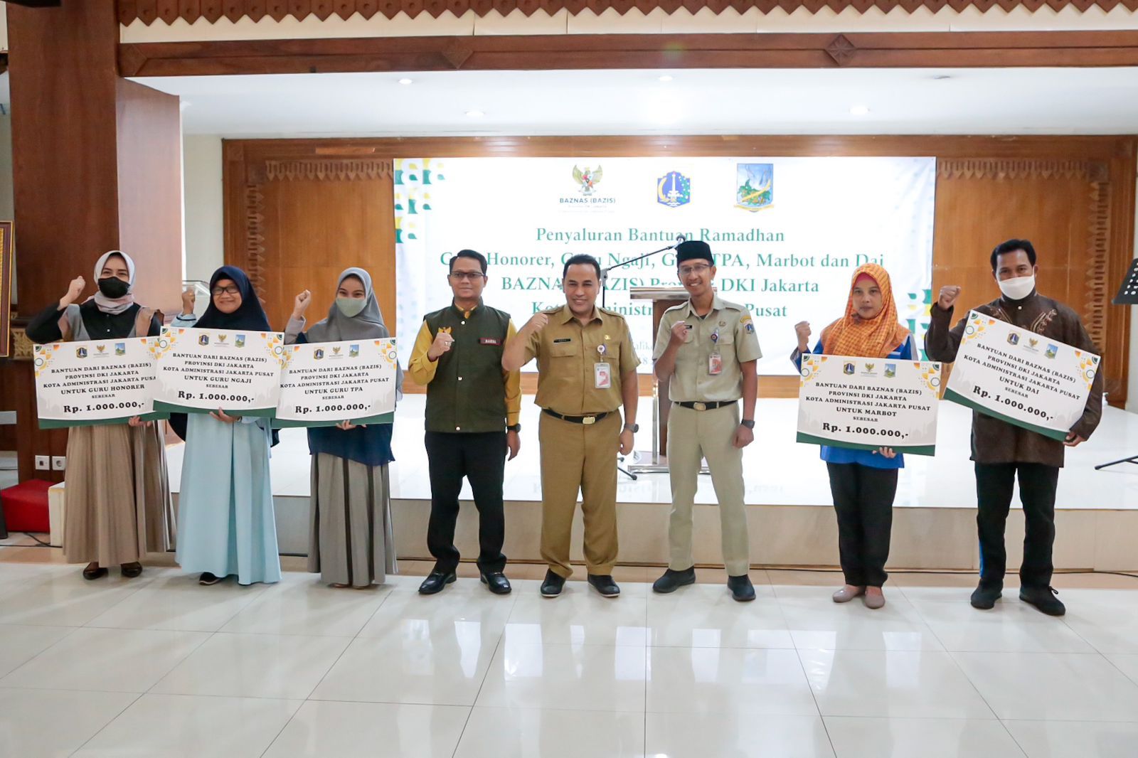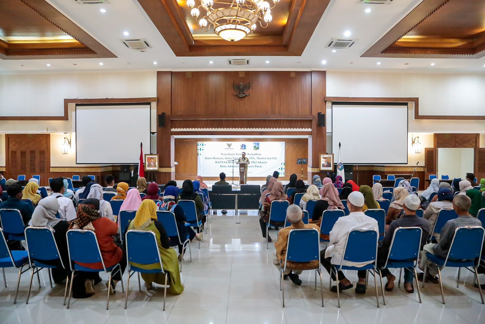 Bazis Baznas Kota Administrasi Jakarta Pusat menyalurkan bantuan Ramadan kepada guru honorer, guru ngaji, guru TPA, marbut masjid, dan juga dai, di Ruang Serbaguna Utama, Kantor Wali Kota Jakarta Pusat, Selasa (18/4).