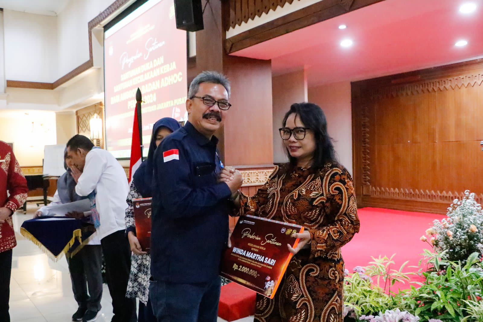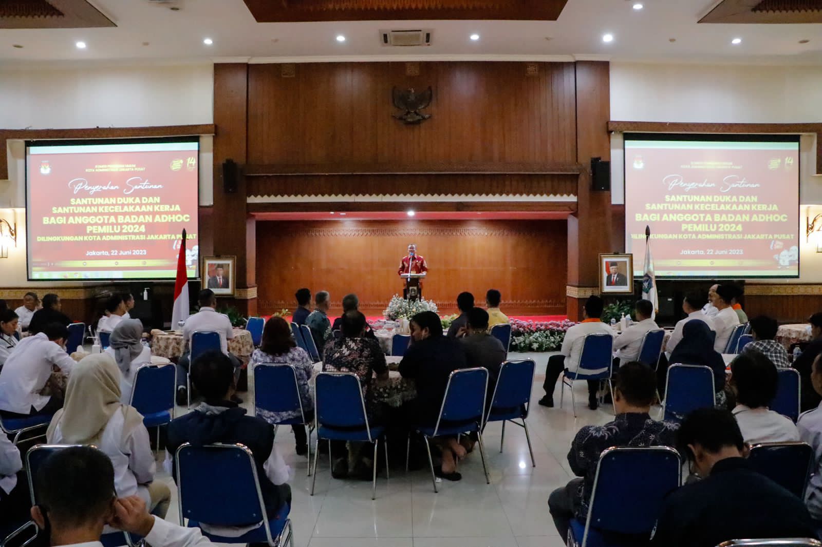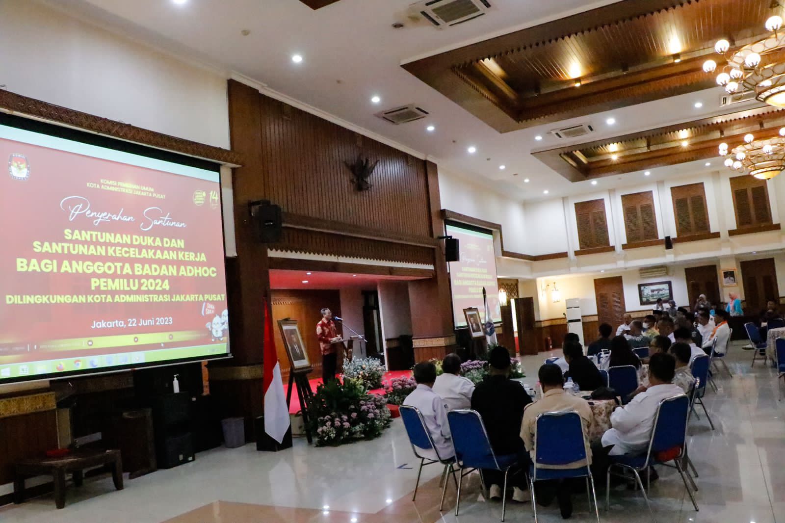 Wali Kota Administrasi Jakarta Pusat Dhany Sukma didampingi Ketua KPU Jakarta Pusat menyerahkan santunan kepada anggota Badan Adhoc Pemilu 2024 di Ruang Serbaguna Utama, Kantor Wali Kota Jakarta Pusat, Kamis (22/6).