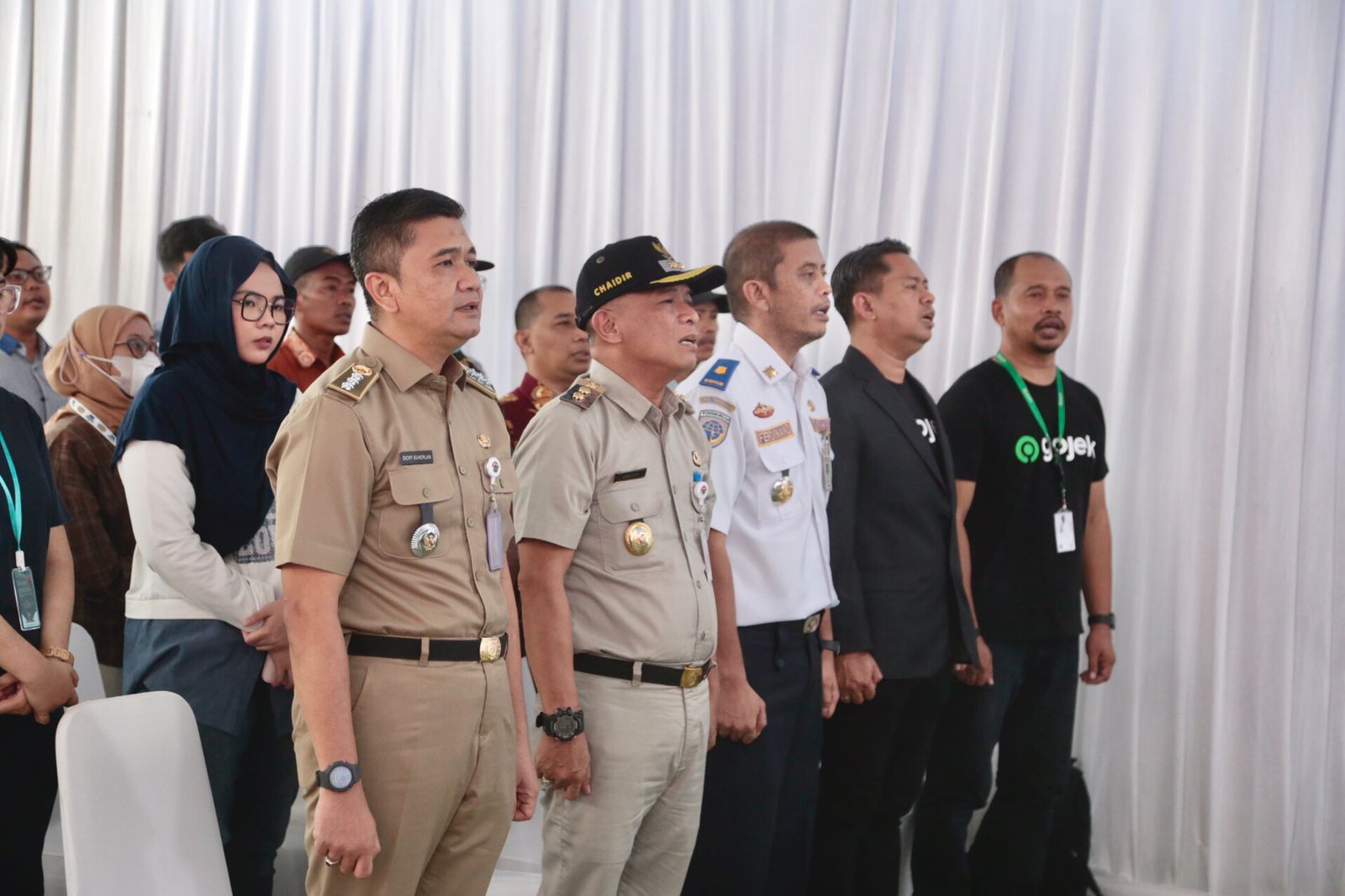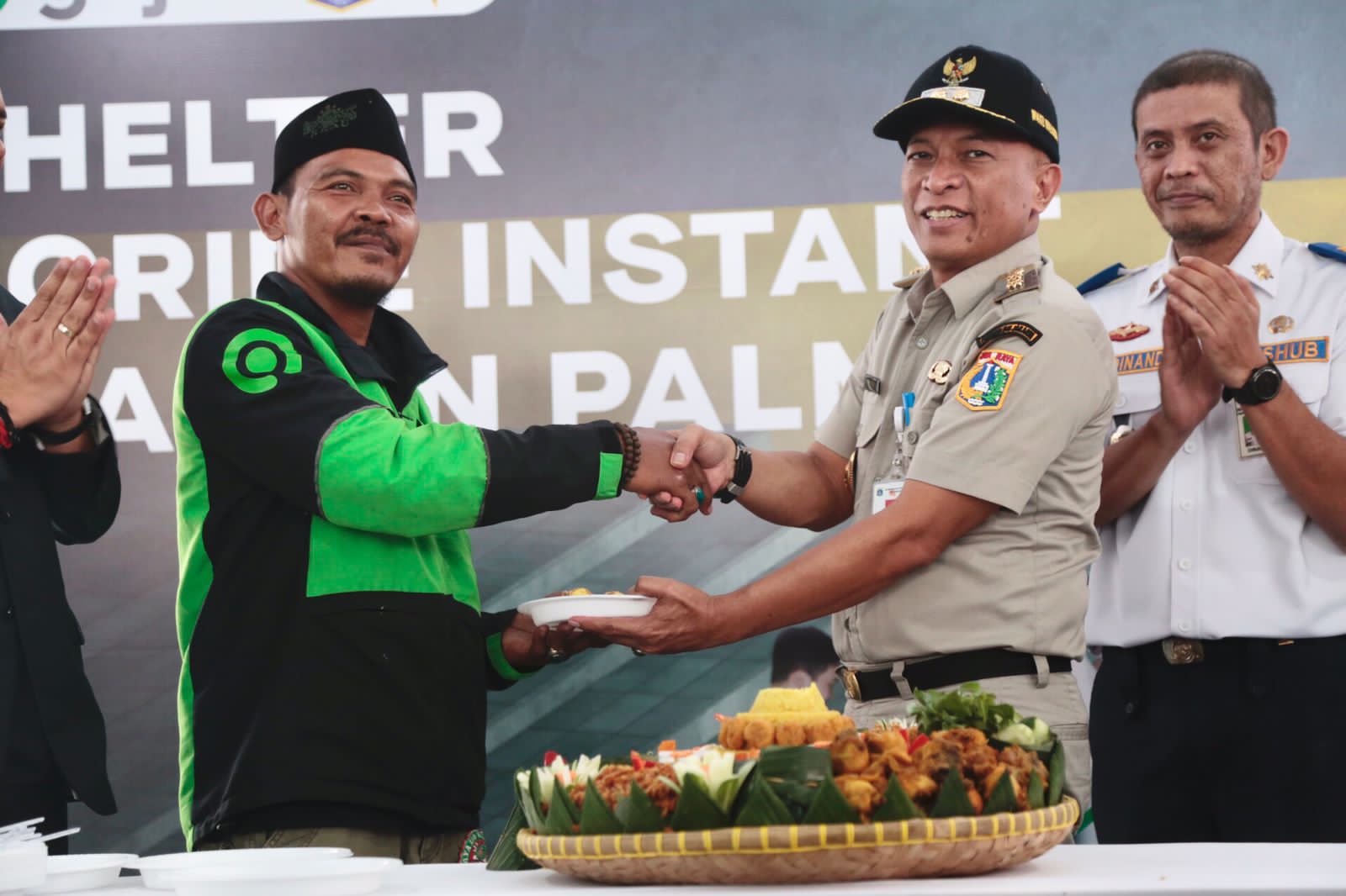 Wakil Wali Kota Administrasi Jakarta Pusat Chaidir didampingi Camat Tanah Abang Dicky Suherlan dan Lurah Gelora Nurul Huda, meresmikan shelter atau area pengendapan untuk para mitra Gojek yang berlokasi di sisi barat Stasiun Palmerah, Jakarta Pusat, Senin (12/6).