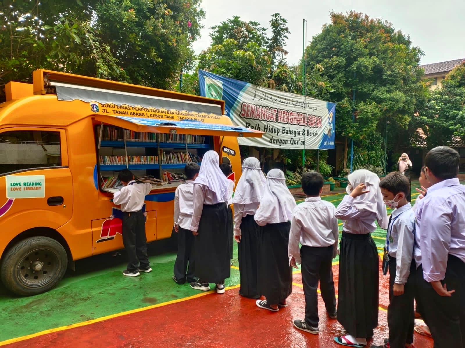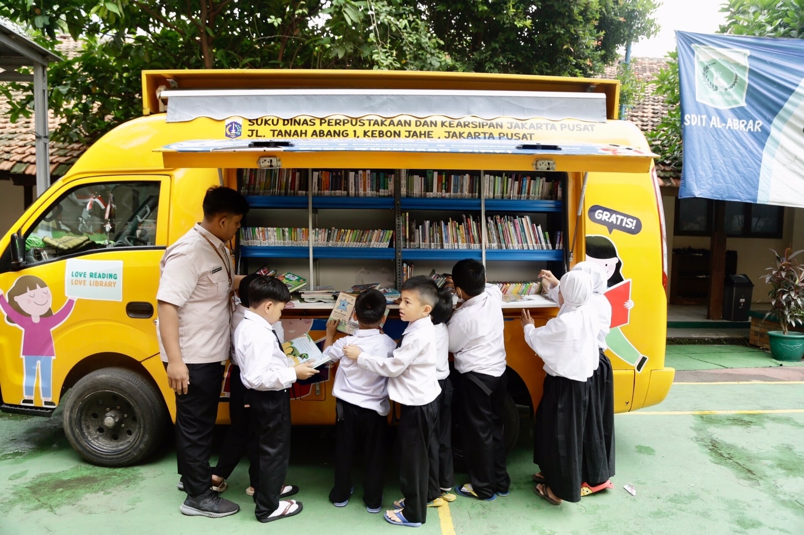 Mobil perpustakaan keliling milik Sudin Pusip Jakarta Pusat menjadi primadona saat mendatangi Sekolah Dasar Islam Terpadu (SDIT) Al-Abrar, Kelurahan Bendungan Hilir, Kecamatan Tanah Abang, pada Selasa (3/1) pagi.