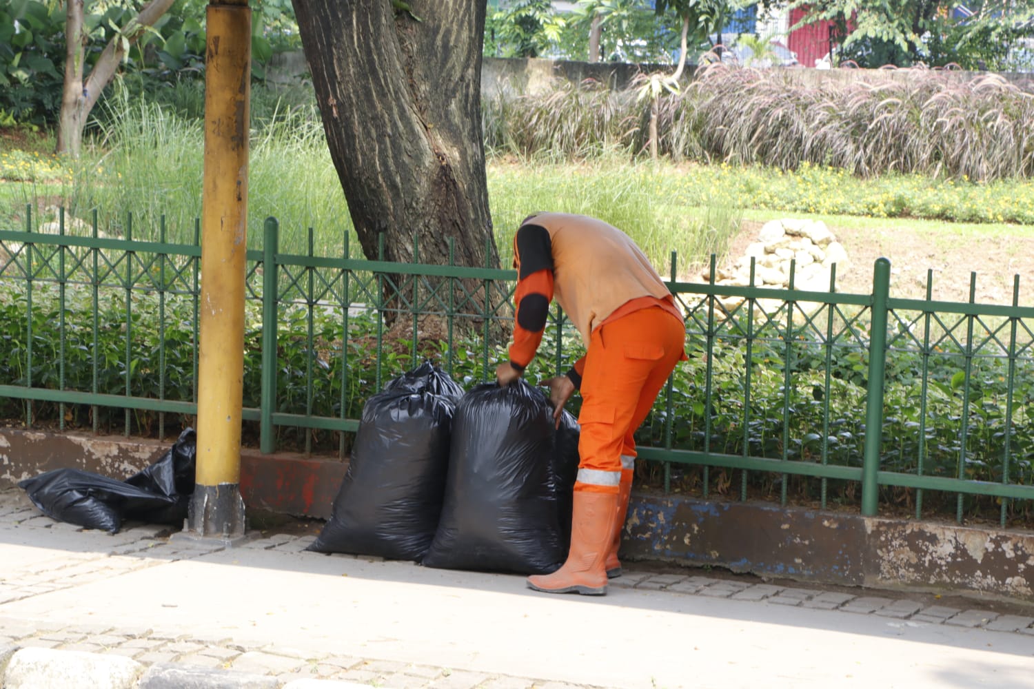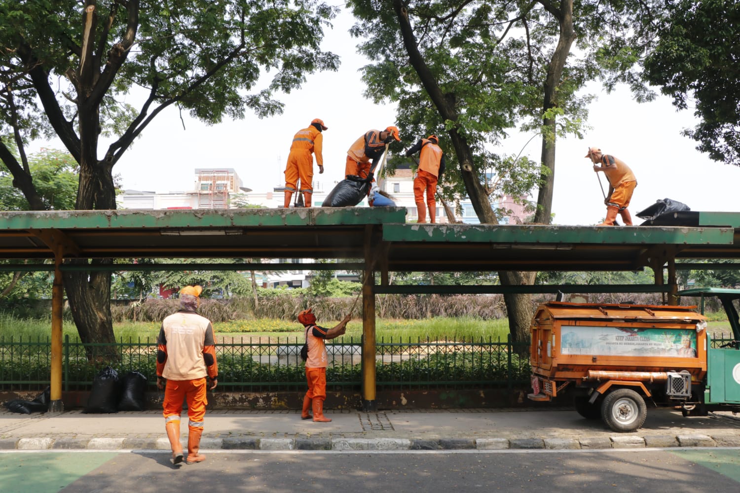 Petugas Prasarana dan Sarana Umum (PPSU) Kelurahan Sumur batu melakukan bersih-bersih halte Cempaka Mas dan taman yang berada di sekitar Embung Biotrans tahap dua, Jalan Letjen Suprapto, Kecamatan Kemayoran, Jakarta Pusat, Kamis (12/1).