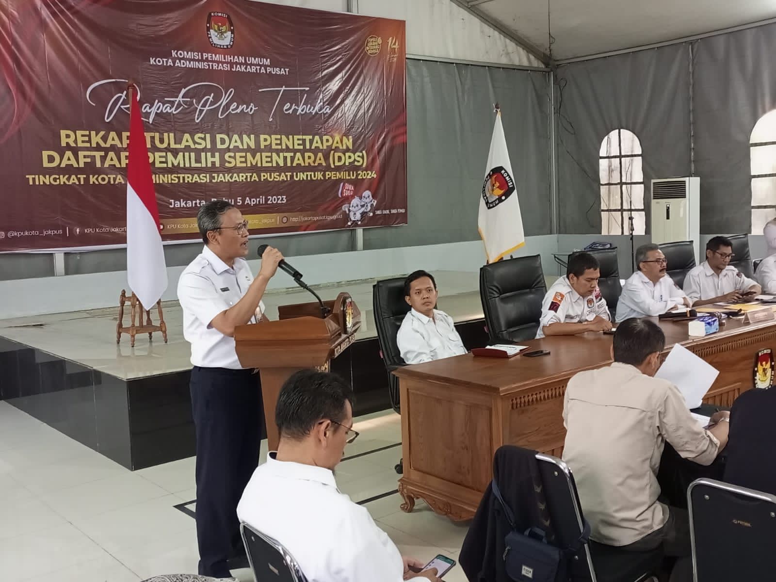 Komisi Pemilihan Umum (KPU) Kota Administrasi Jakarta Pusat melaksanakan rapat pleno terbuka rekapitulasi dan penetapan Daftar Pemilih Sementara (DPS) untuk pemilu 2024 di Kantor KPU, Kelurahan Pasar Baru, Kecamatan Sawah Besar, Jakarta Pusat, Rabu (5/4).