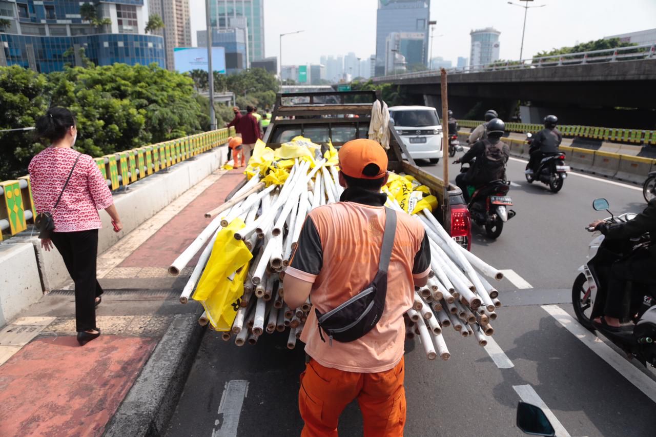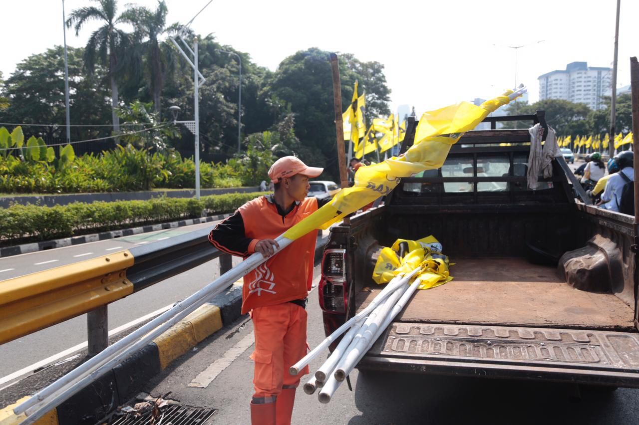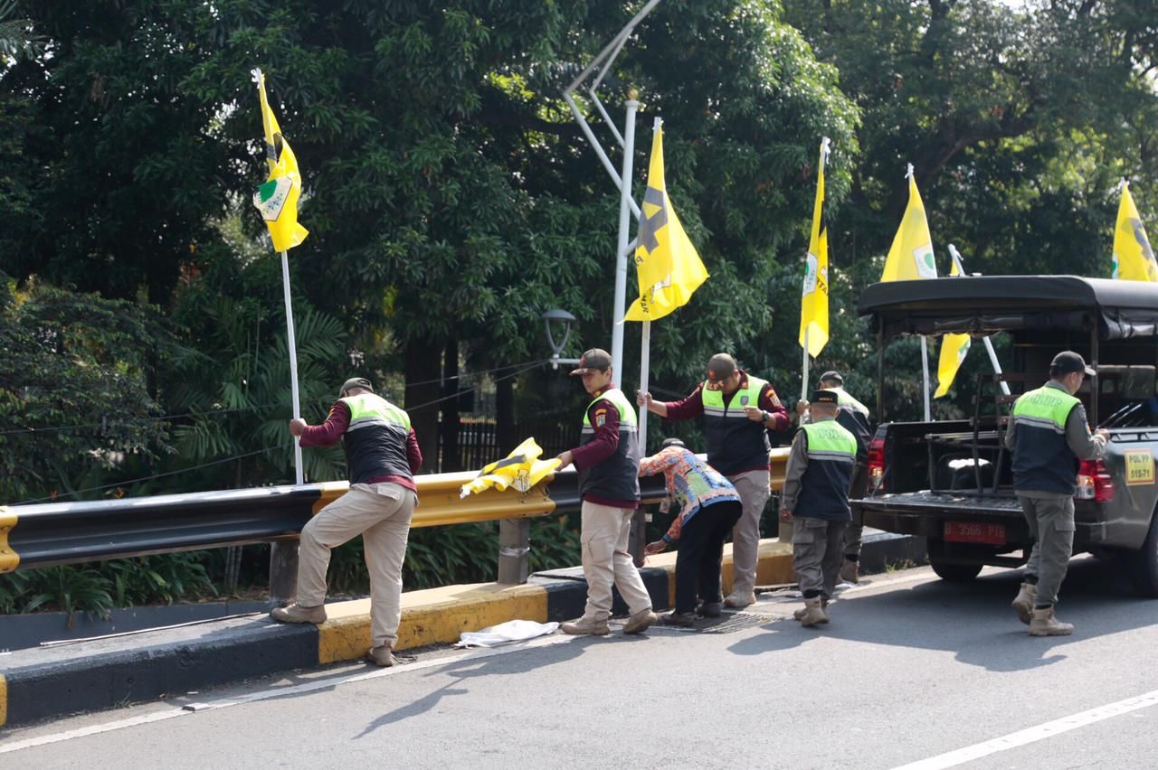Satpol PP dan PPSU Kelurahan Gelora bersihkan bendera dan spanduk di fly over Ladokgi dan Slipi