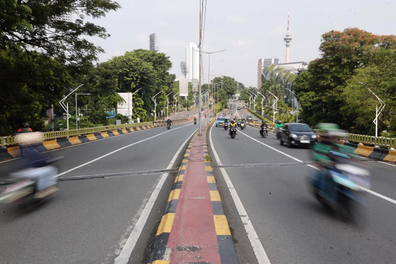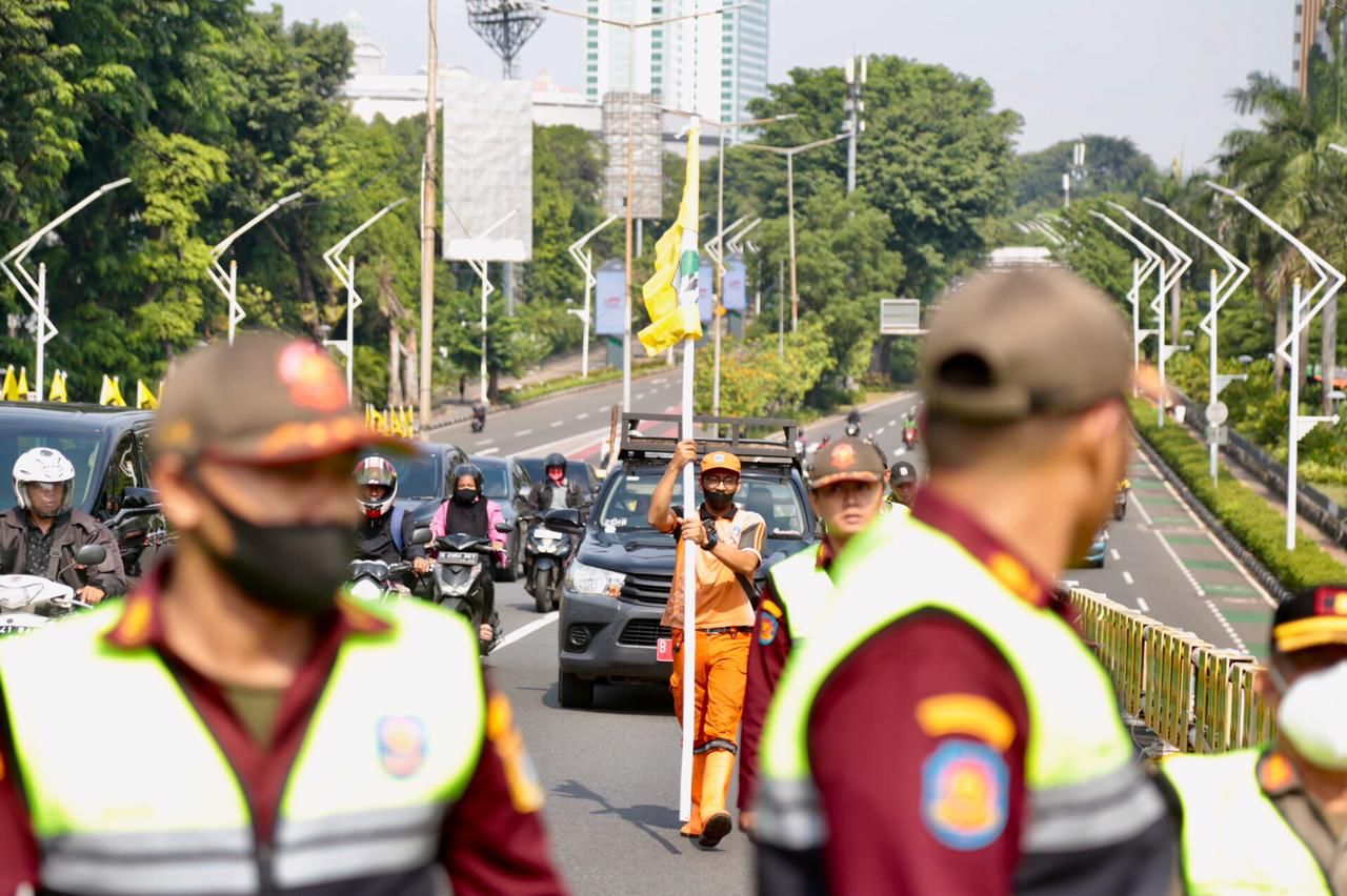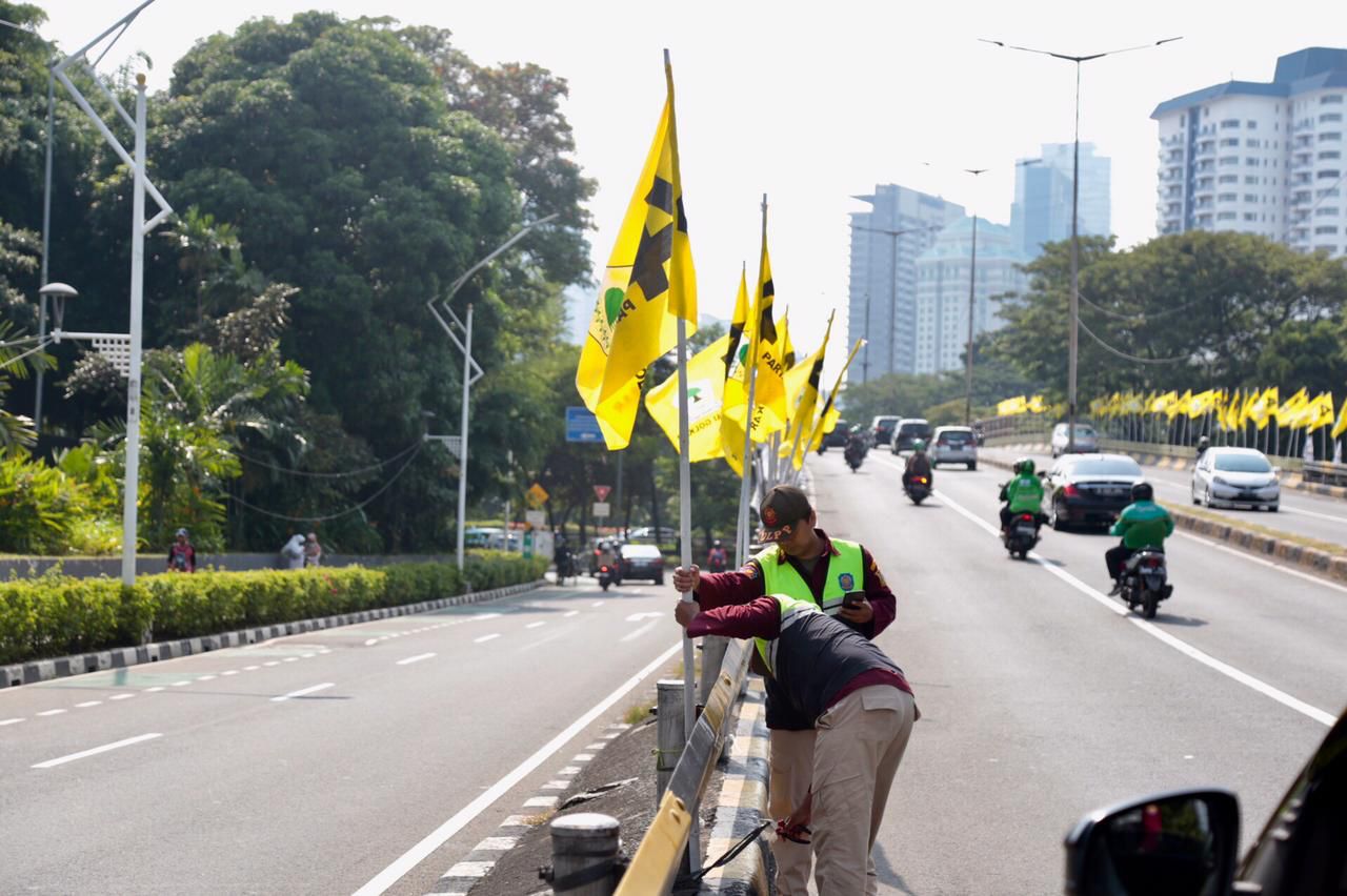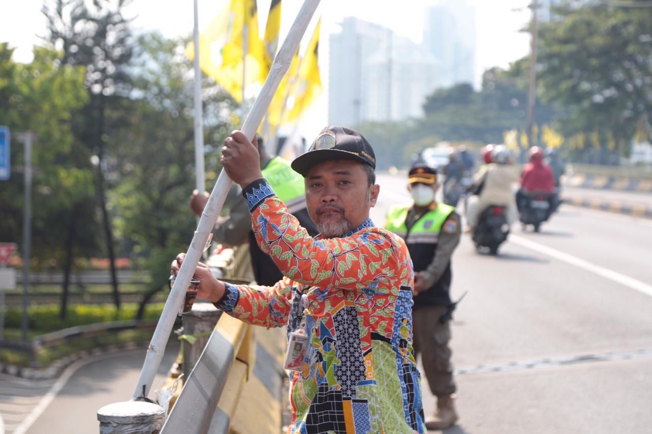 Satpol PP dan PPSU Kelurahan Gelora bersihkan bendera dan spanduk di fly over Ladokgi dan Slipi