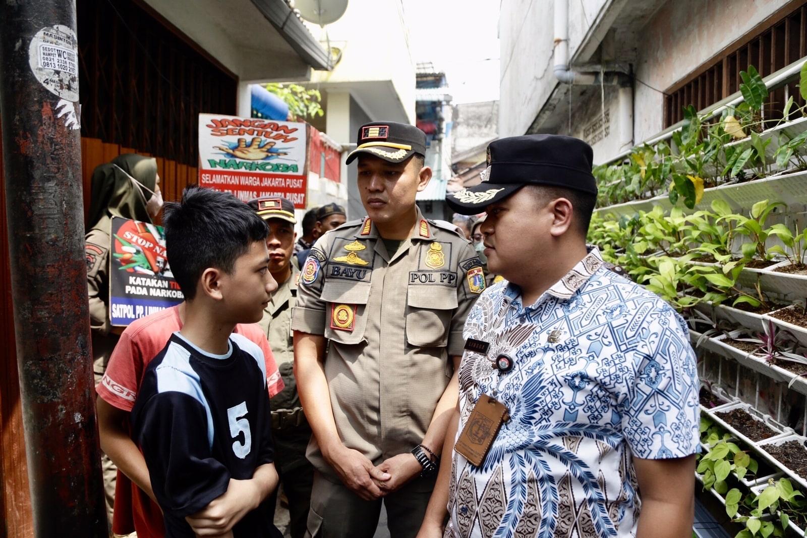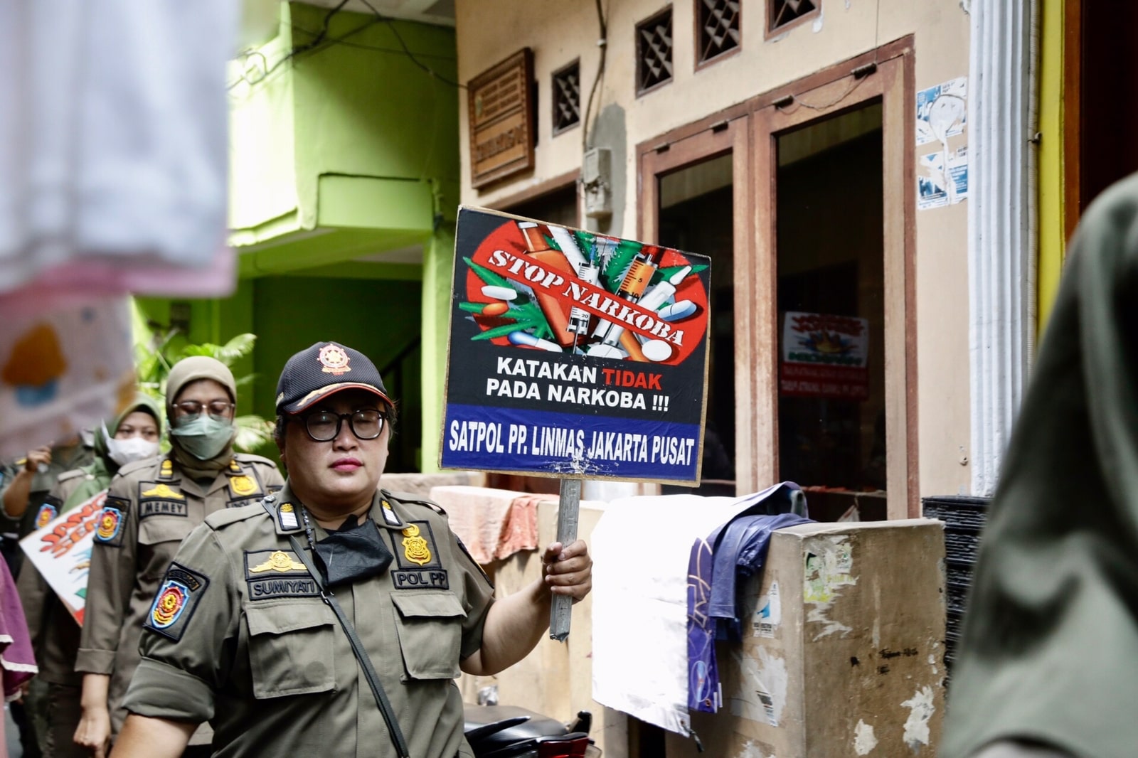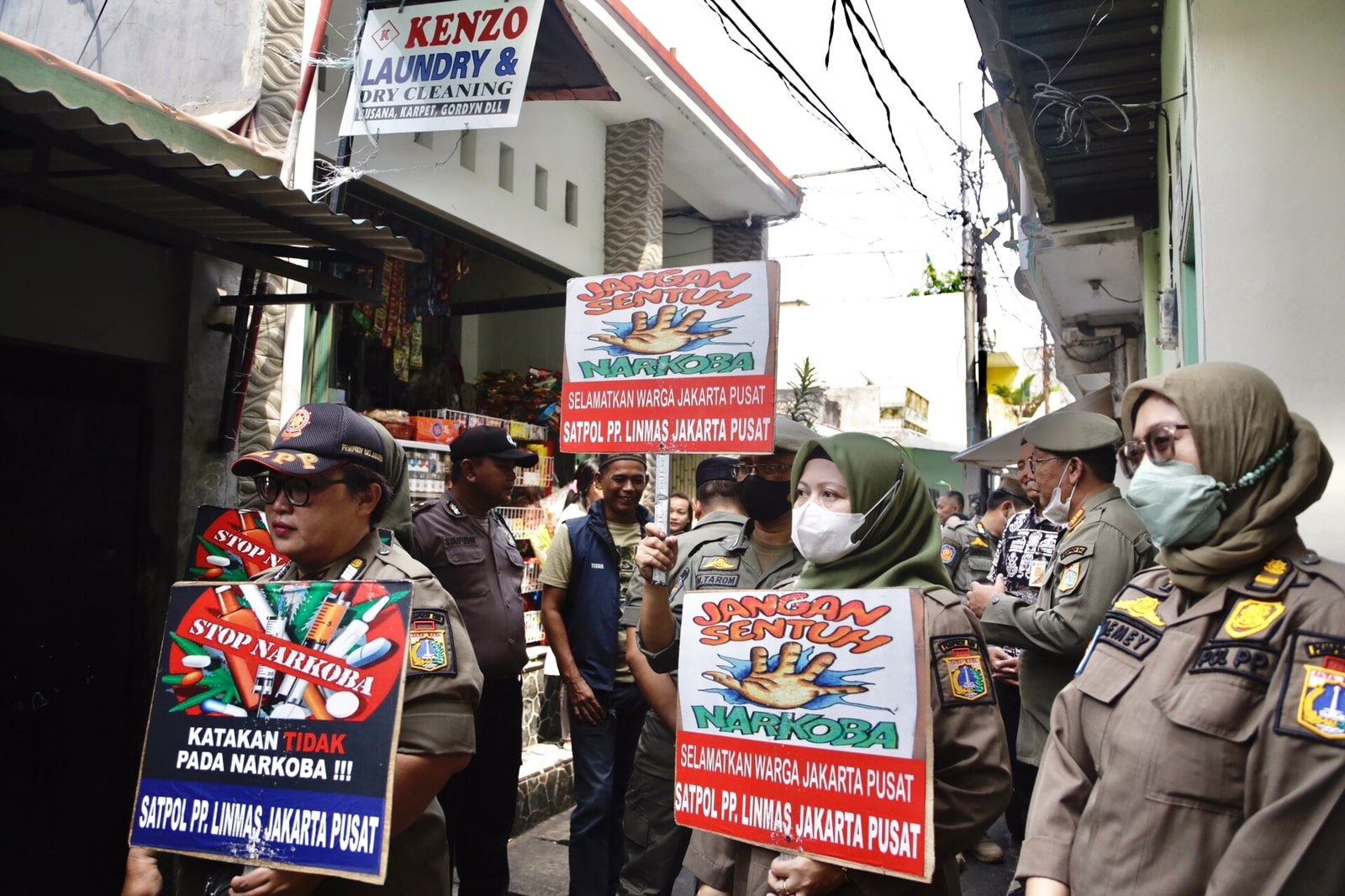 Satpol PP Kota Administrasi Jakarta Pusat melakukan sosialisasi serta edukasi terhadap bahaya narkoba di RW 01 Kelurahan Karang Anyar, Jakarta Pusat, Kamis (12/1).
