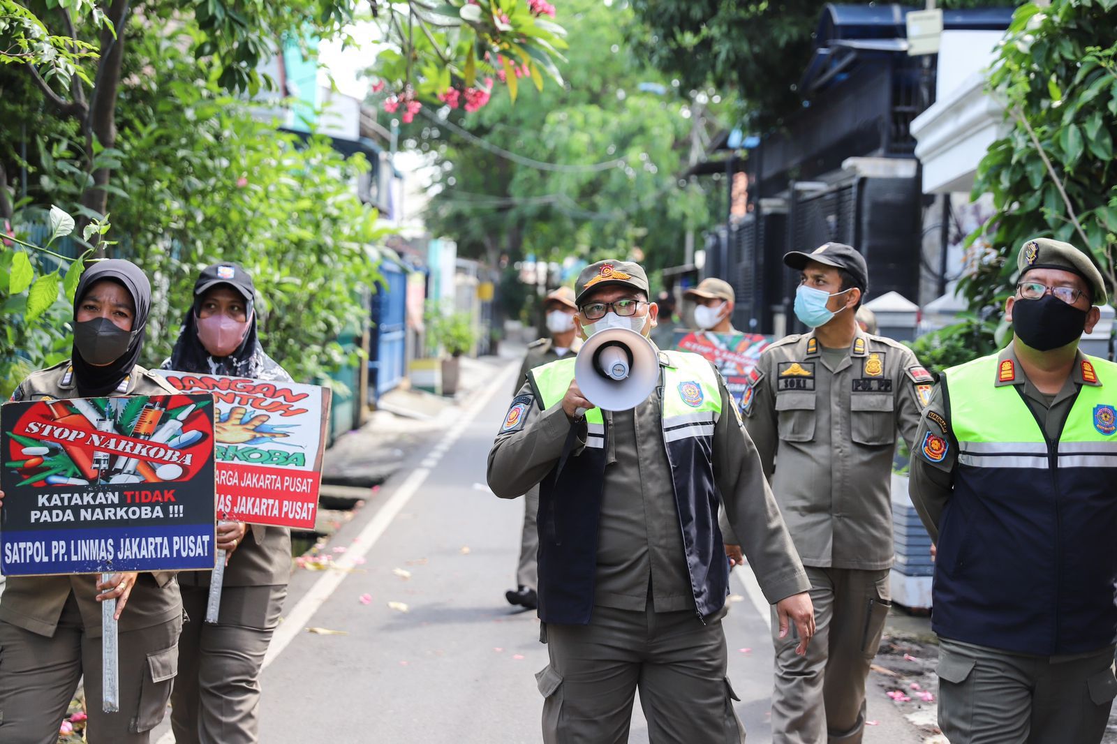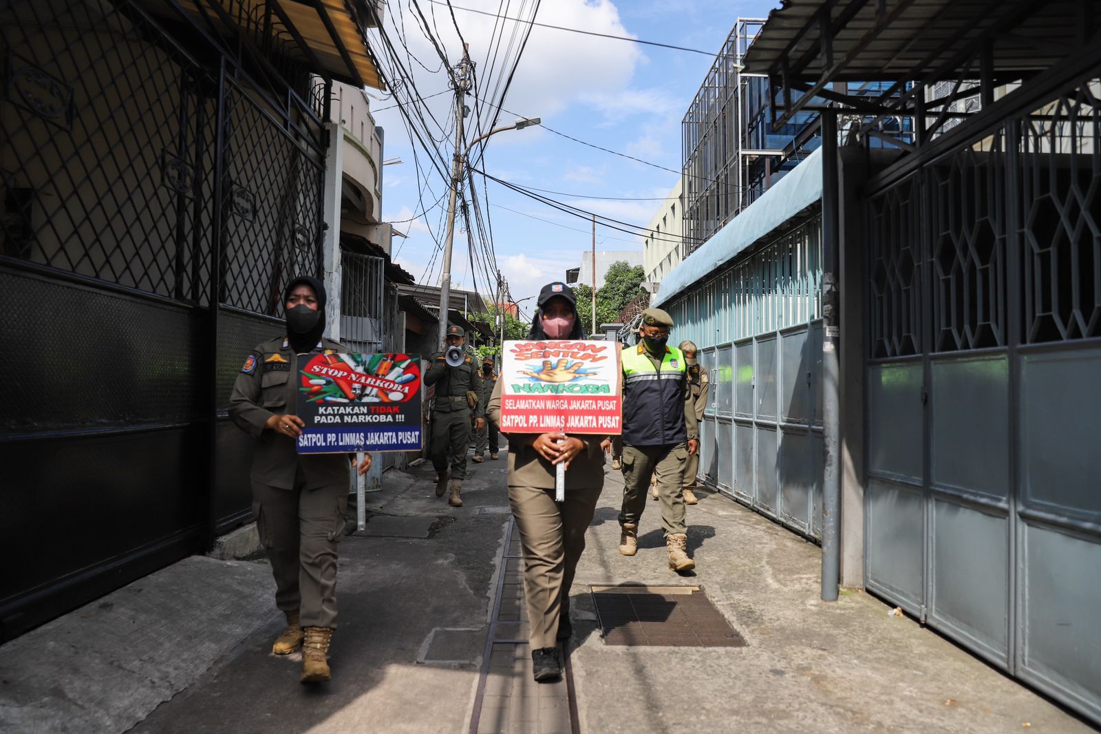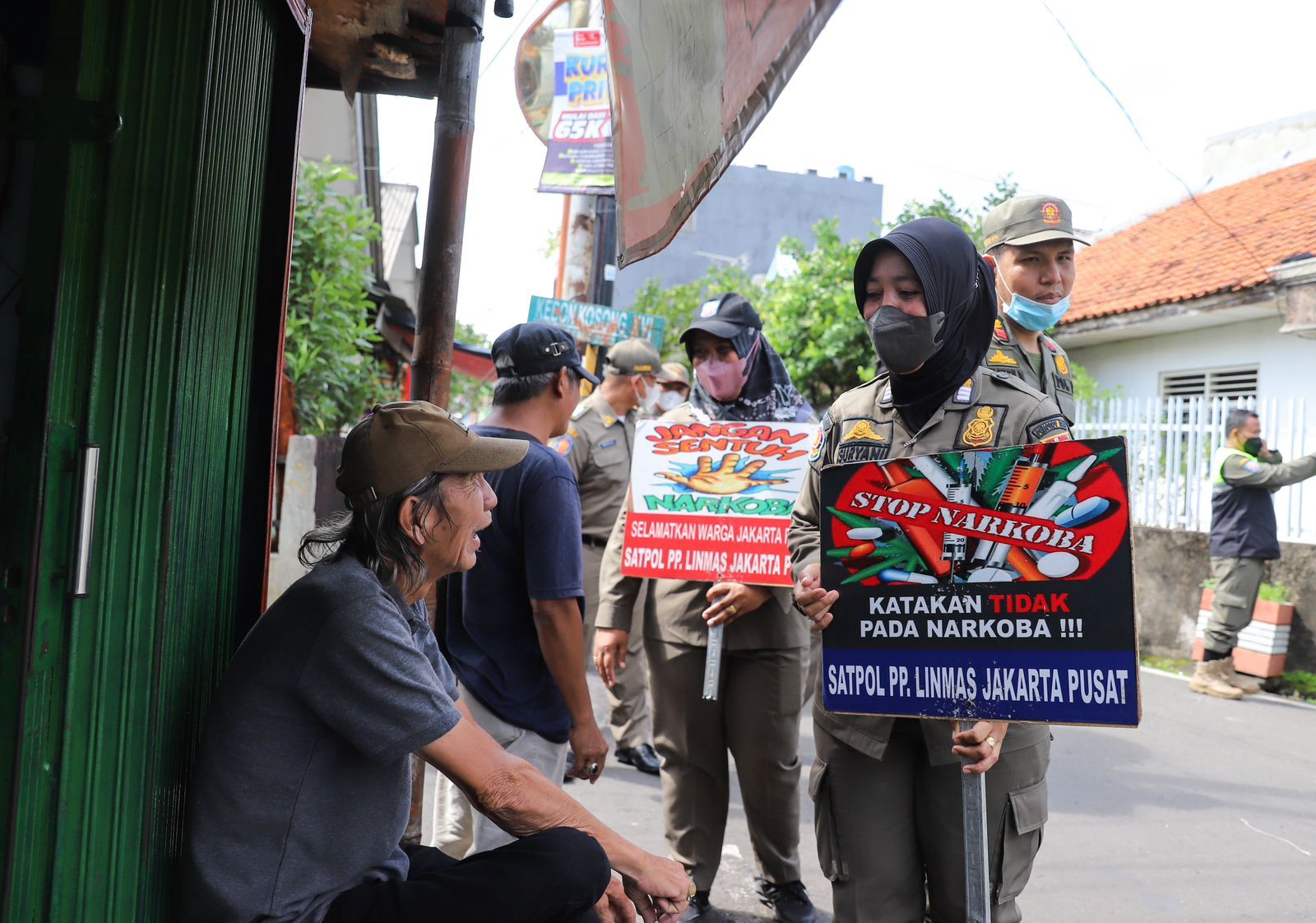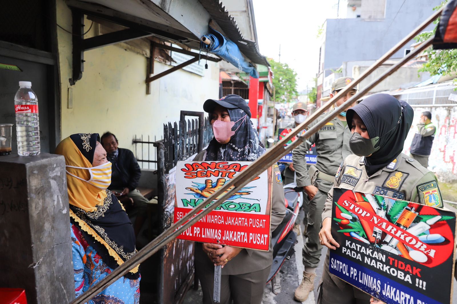 Petugas Satuan Polisi Pamong Praja (Satpol PP) Kota Administrasi Jakarta Pusat melakukan sosialisasi dan edukasi terhadap bahaya narkoba di wilayah RW 01 Kelurahan Kebon Kosong, Kecamatan Kemayoran, Kamis (9/2).