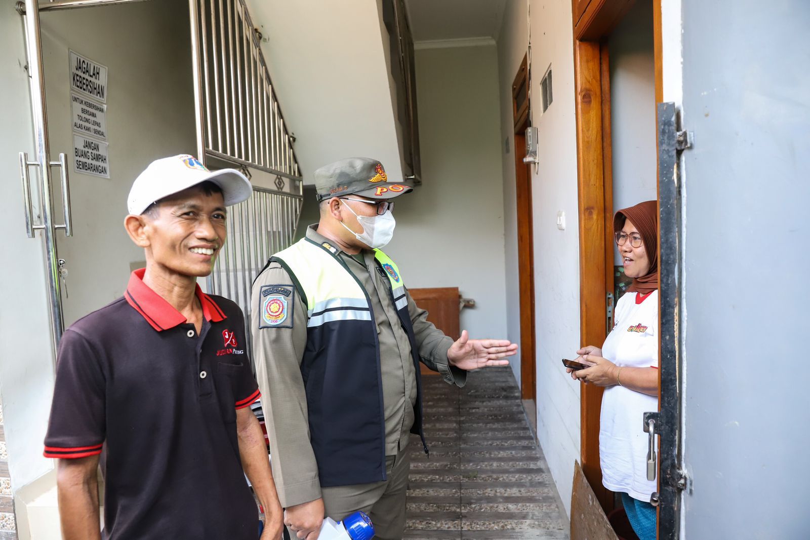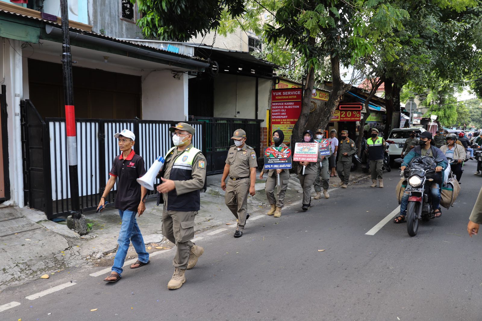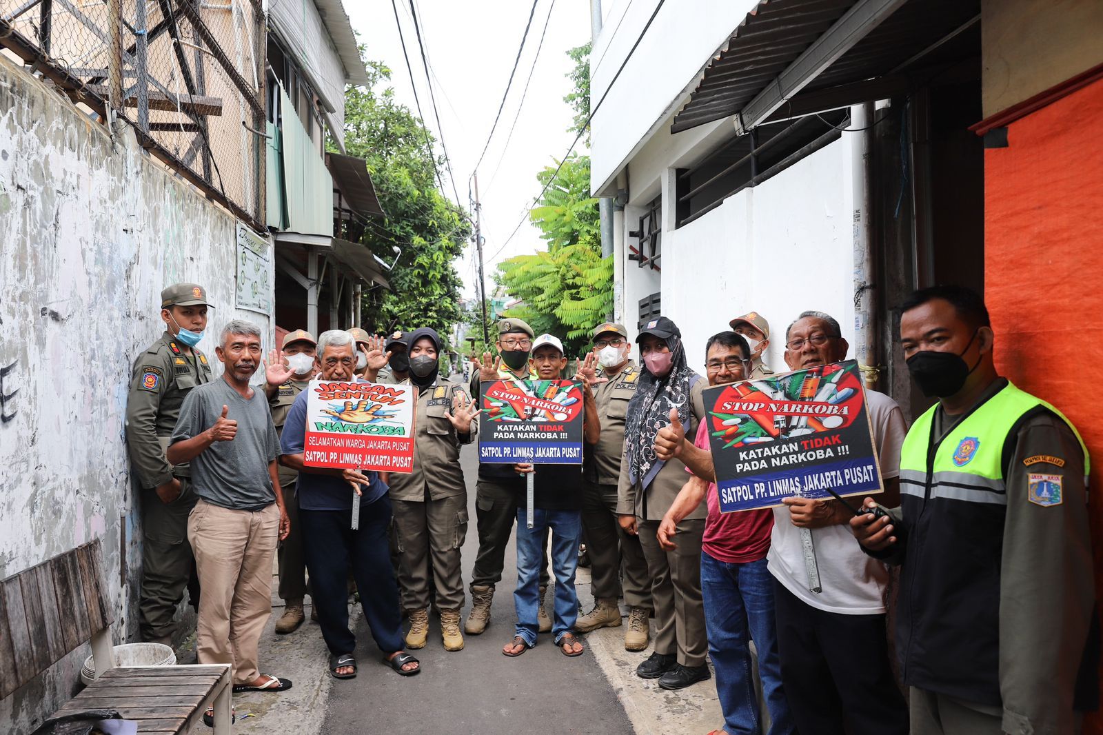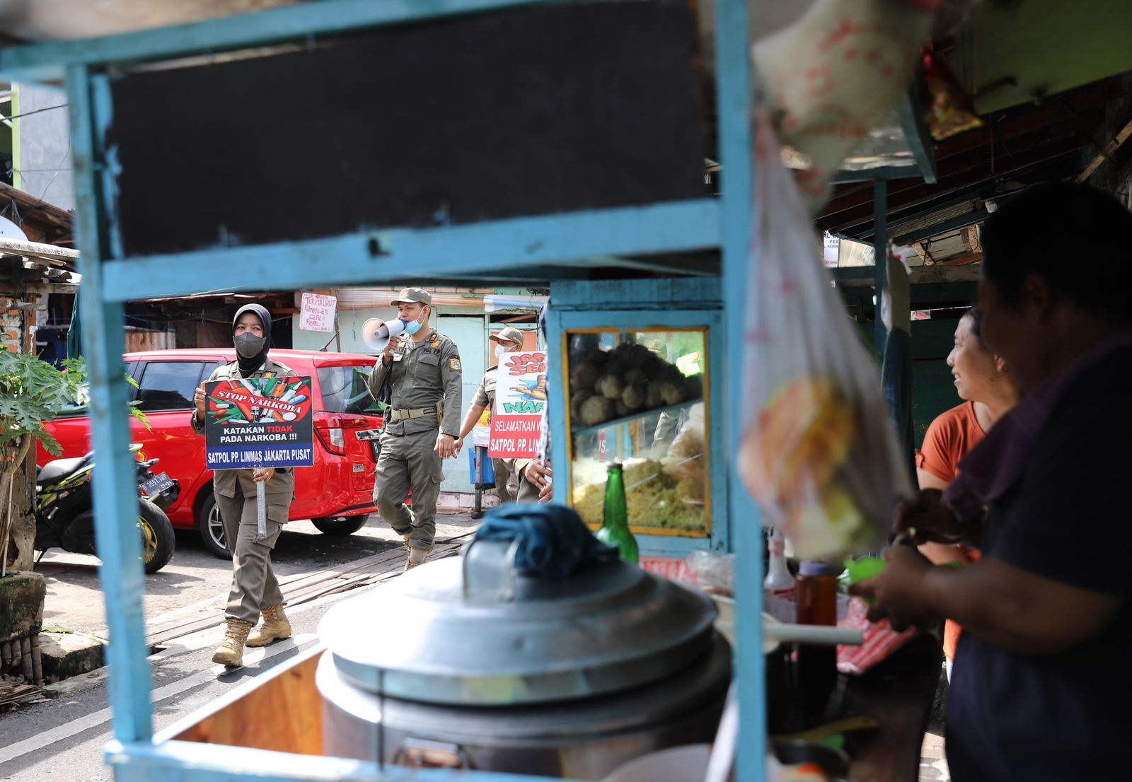 Petugas Satuan Polisi Pamong Praja (Satpol PP) Kota Administrasi Jakarta Pusat melakukan sosialisasi dan edukasi terhadap bahaya narkoba di wilayah RW 01 Kelurahan Kebon Kosong, Kecamatan Kemayoran, Kamis (9/2).