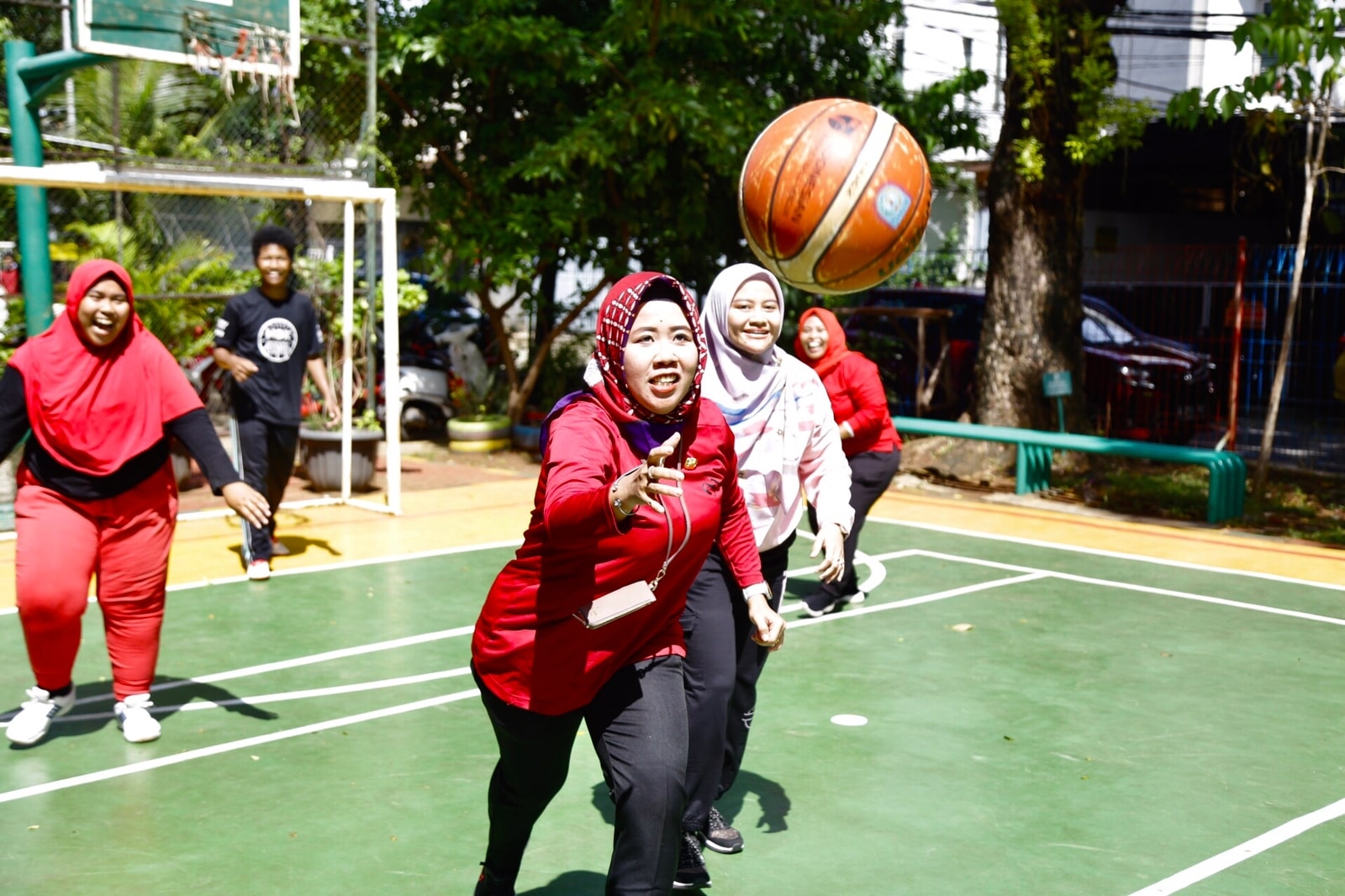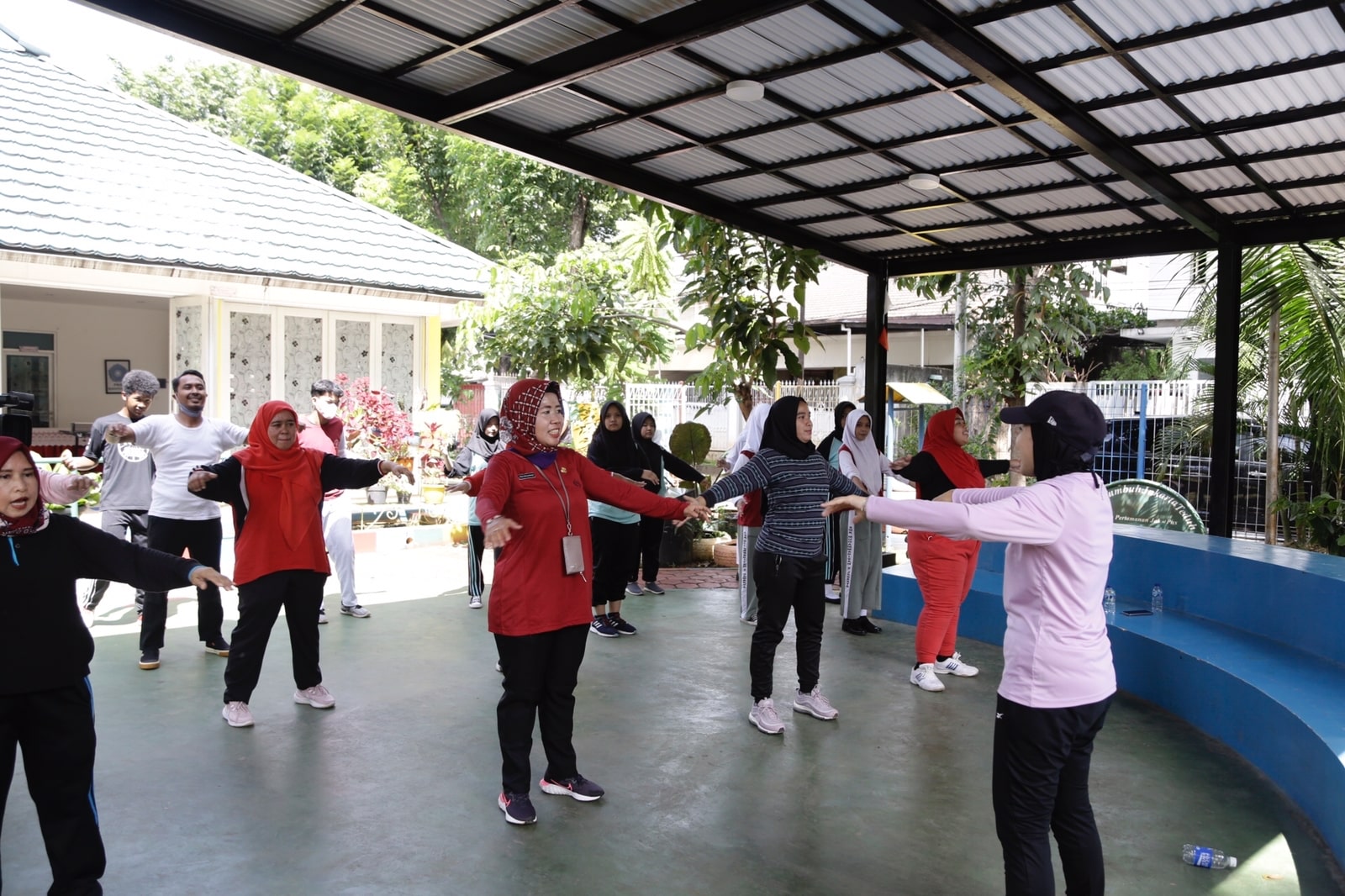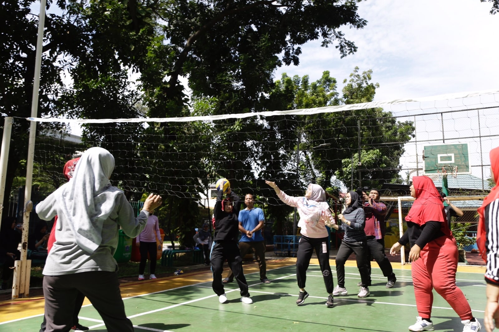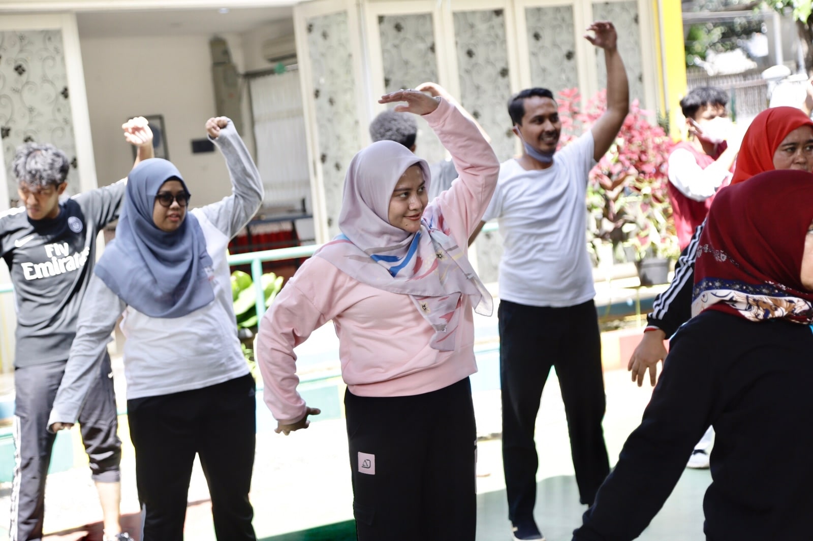 Jajaran Kelurahan Petojo Selatan melakukan olahraga bersama sekaligus sosialisasi fasilitas, di Ruang Publik Terpadu Ramah Anak (RPTRA) Tanah Abang 3, Kecamatan Gambir, Jakarta Pusat, Jumat (6/1).