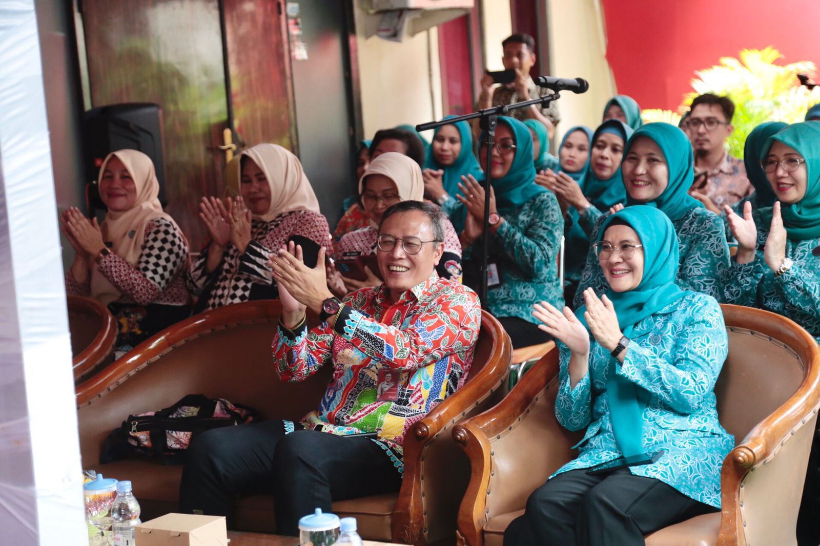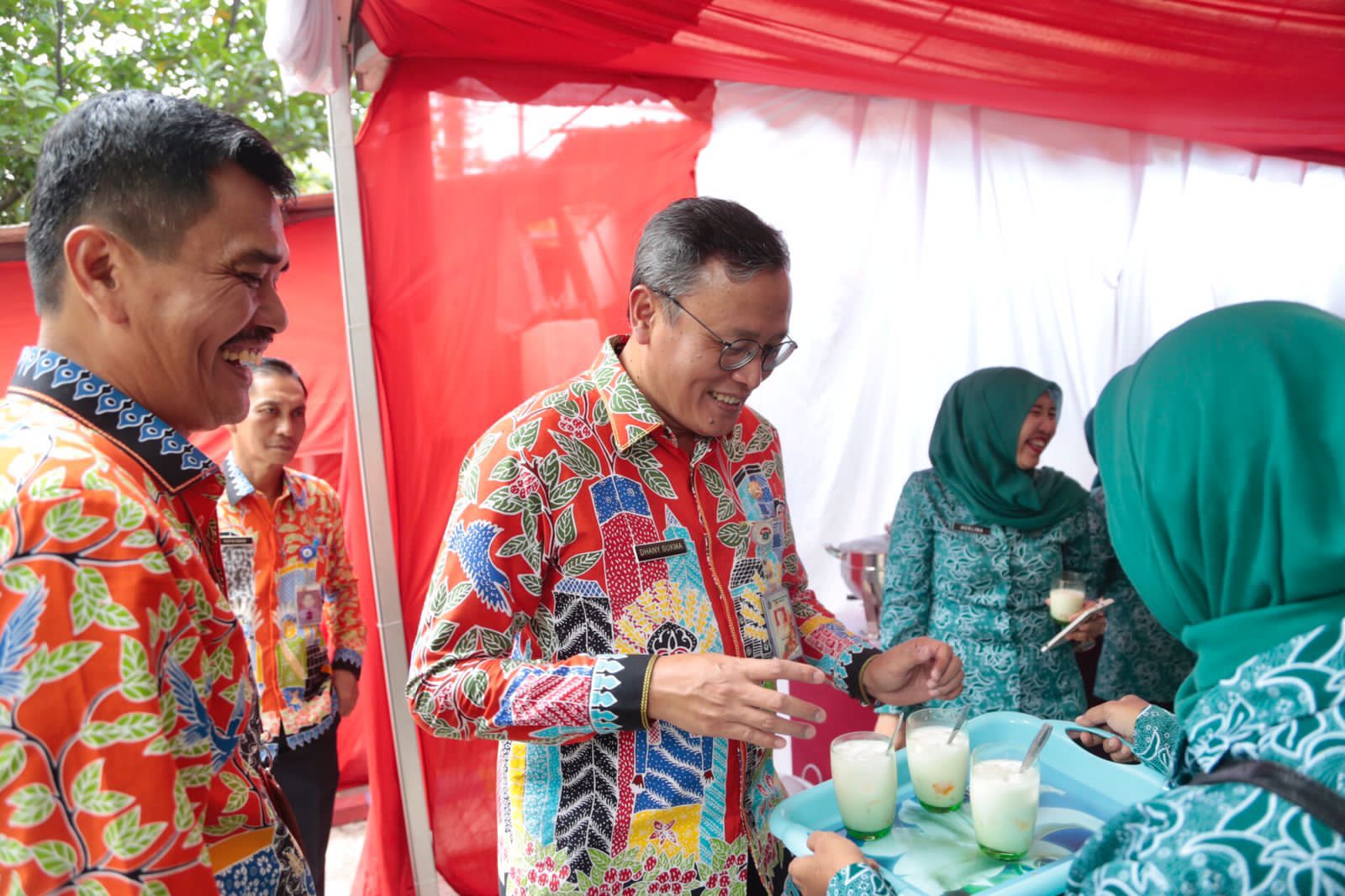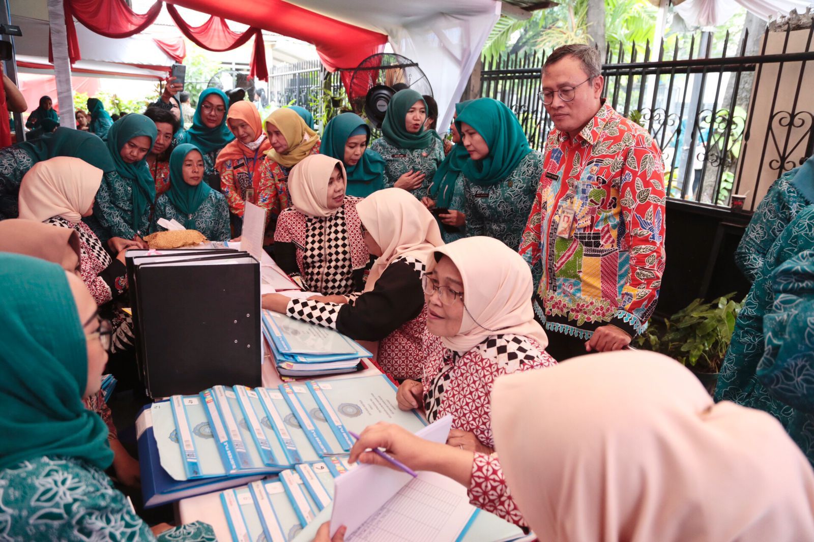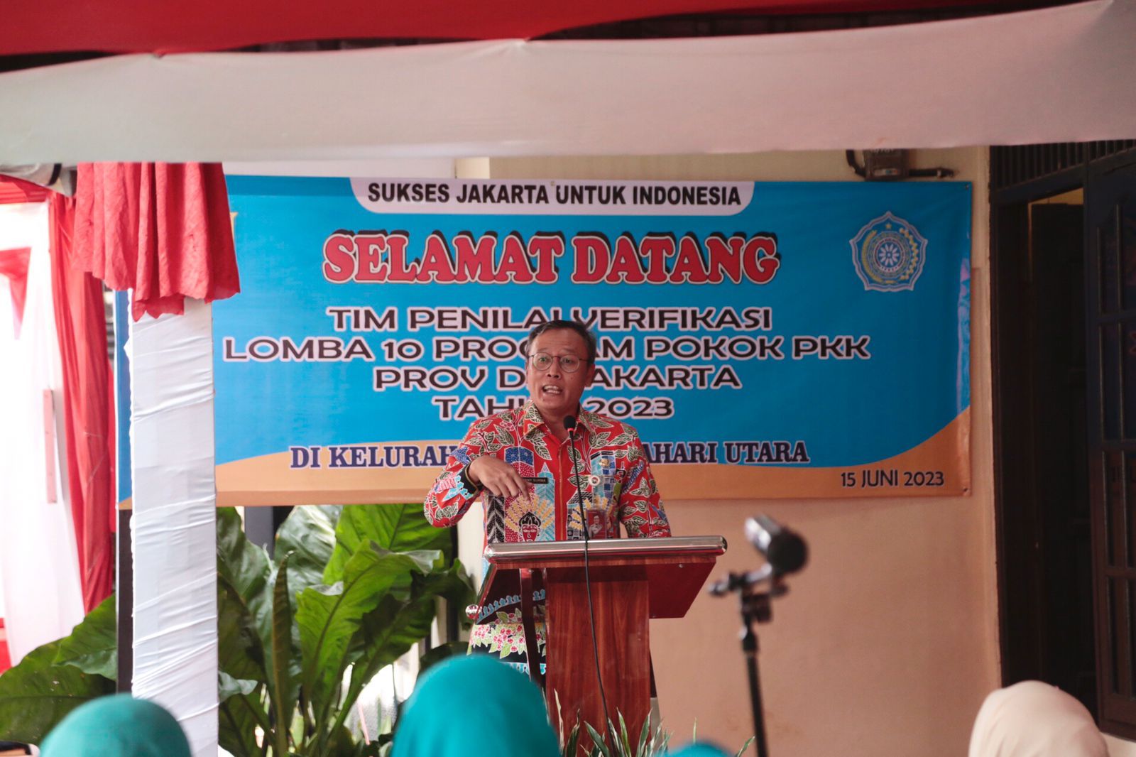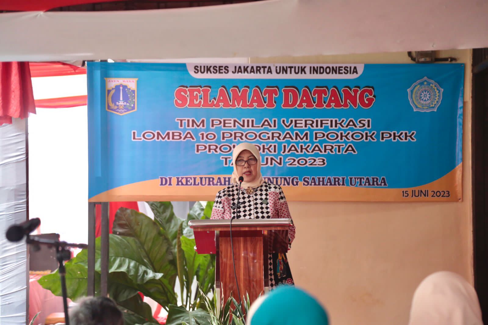 Wali Kota Administrasi Jakarta Pusat Dhany Sukma bersama Ketua TP PKK Ucu Jamilah menerima tim verifikasi lapangan lomba 10 program pokok PKK melalui pokja II kelompok UP2K di pos RW 06 Gunung Sahari Utara, Sawah Besar, Jakarta Pusat, Kamis (15/6).