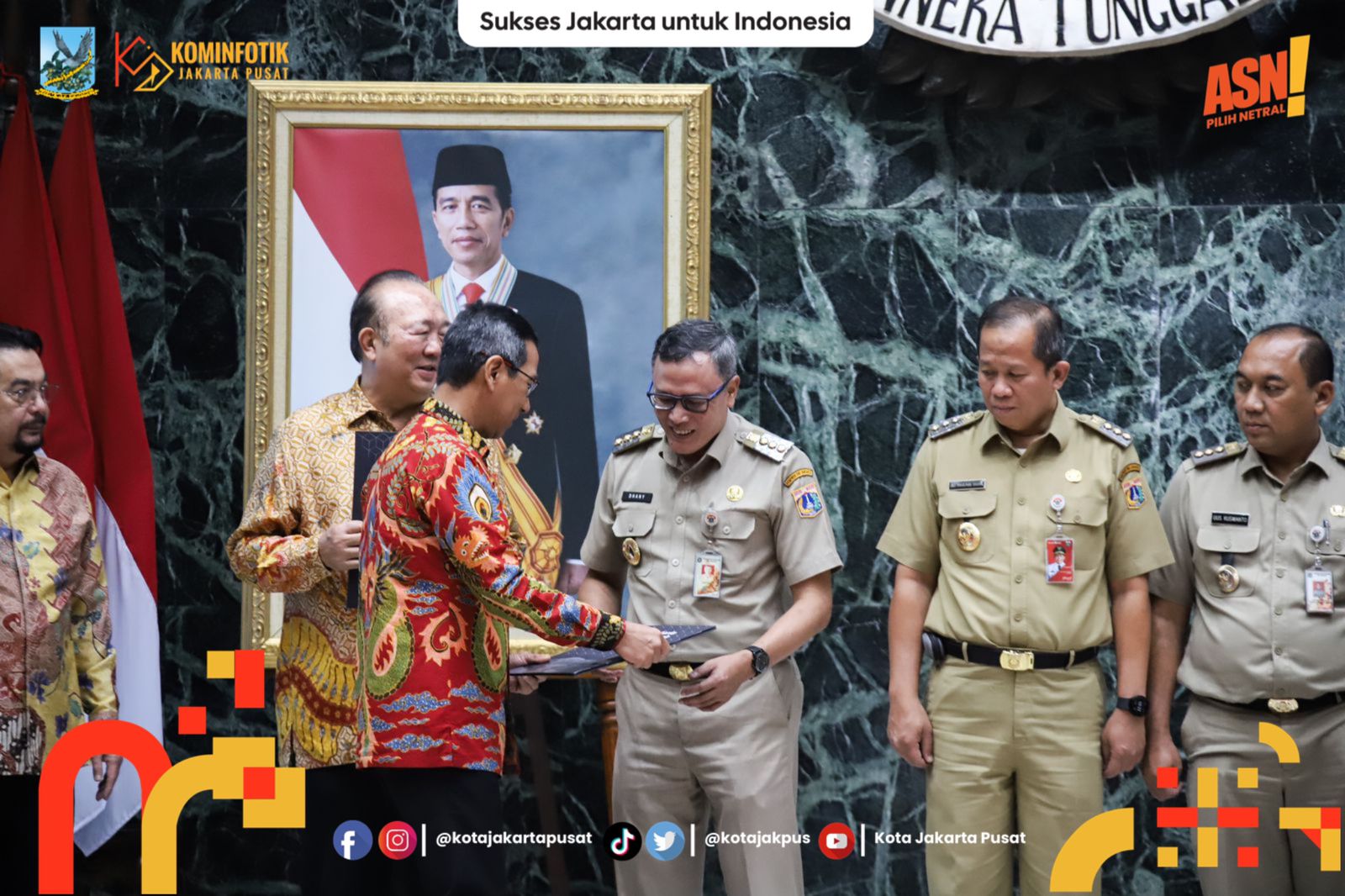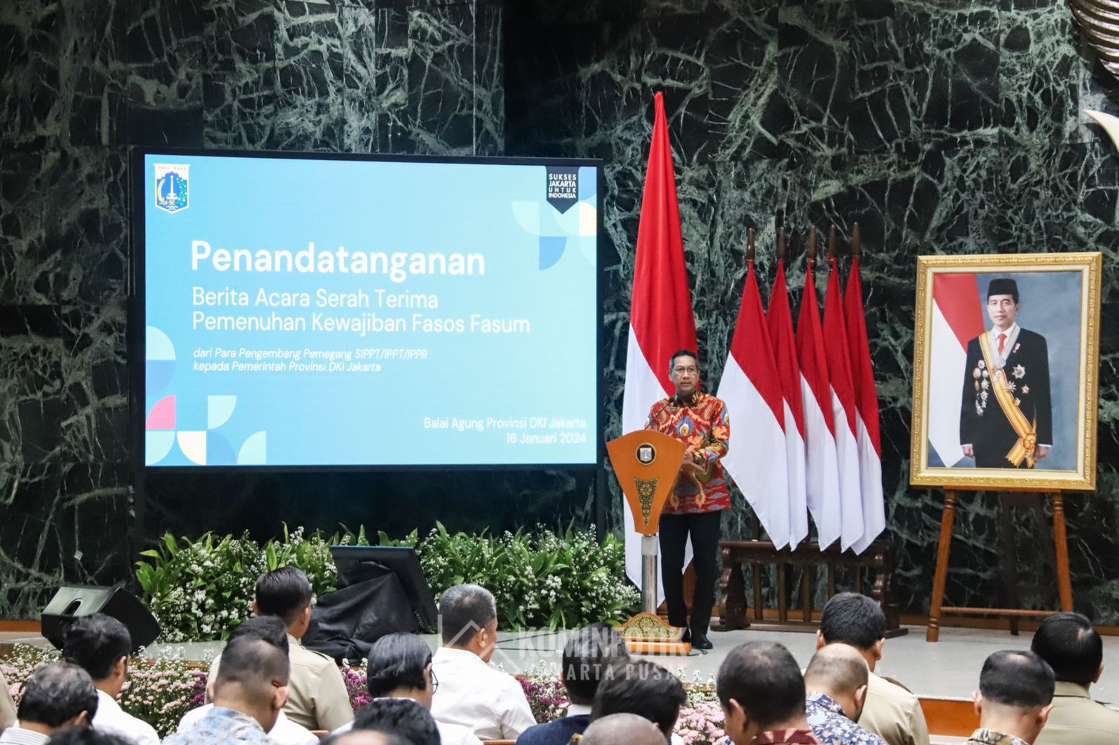 Pejabat (Pj) Gubernur DKI Jakarta Heru Budi Hartono menyaksikan penandatanganan bersama Berita Acara Serah Terima (BAST) pemenuhan kewajiban fasilitas sosial dan fasilitas umum (fasos fasum) dari Pengembang Kepada Pemprov DKI Jakarta. Penandatanganan ini digelar di Balai Agung, Balai Kota DKI Jakarta, Gambir, Jakarta Pusat, Selasa (16/1).