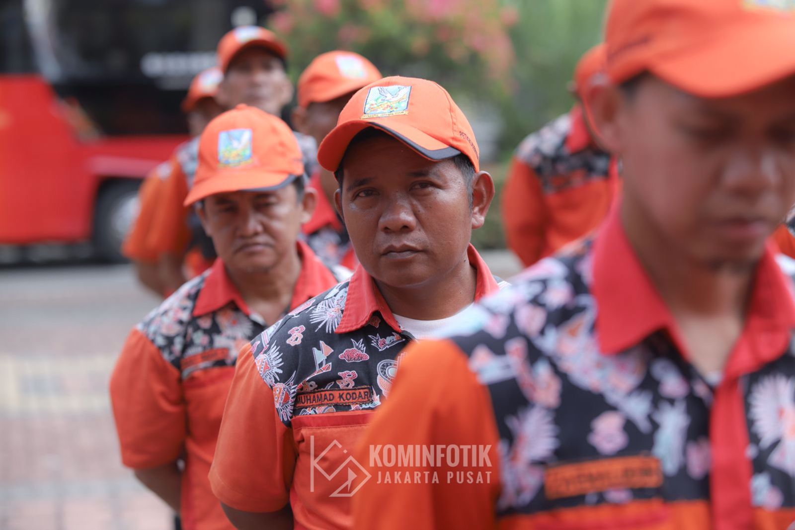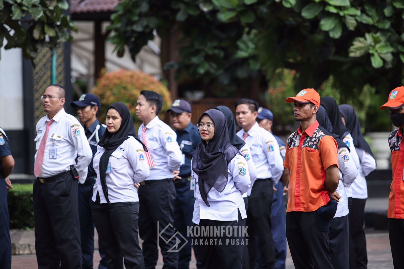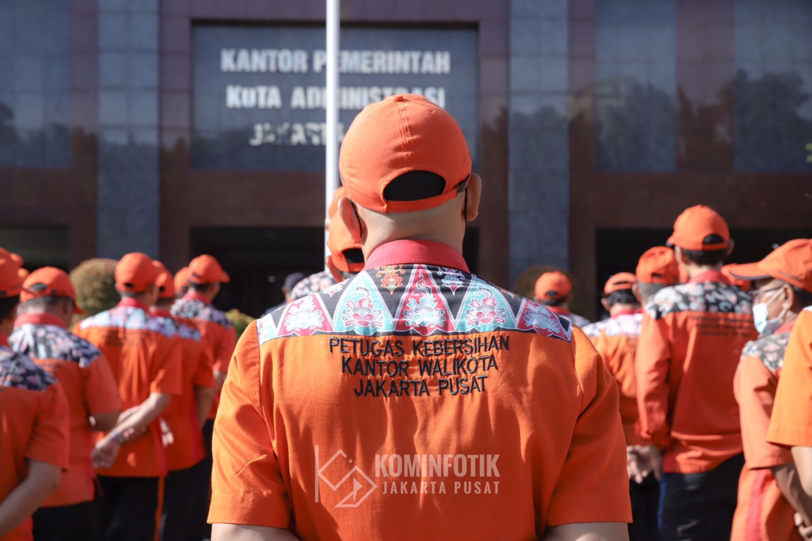 Plh Wali Kota Administrasi Jakarta Pusat Chaidir memberikan penghargaan kepada PJLP Kebersihan atas nama Asih Sunarsih (56) yang telah memasuki purnatugas di Halaman Kantor Wali Kota Jakarta Pusat, Jalan Tanah Abang I, Gambir, Rabu (24/1).