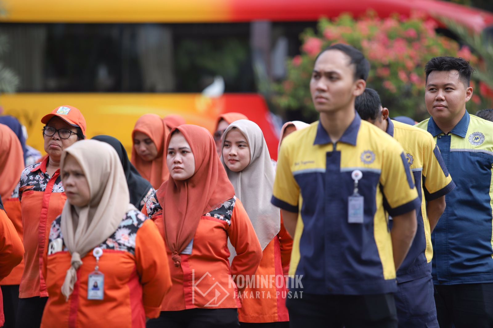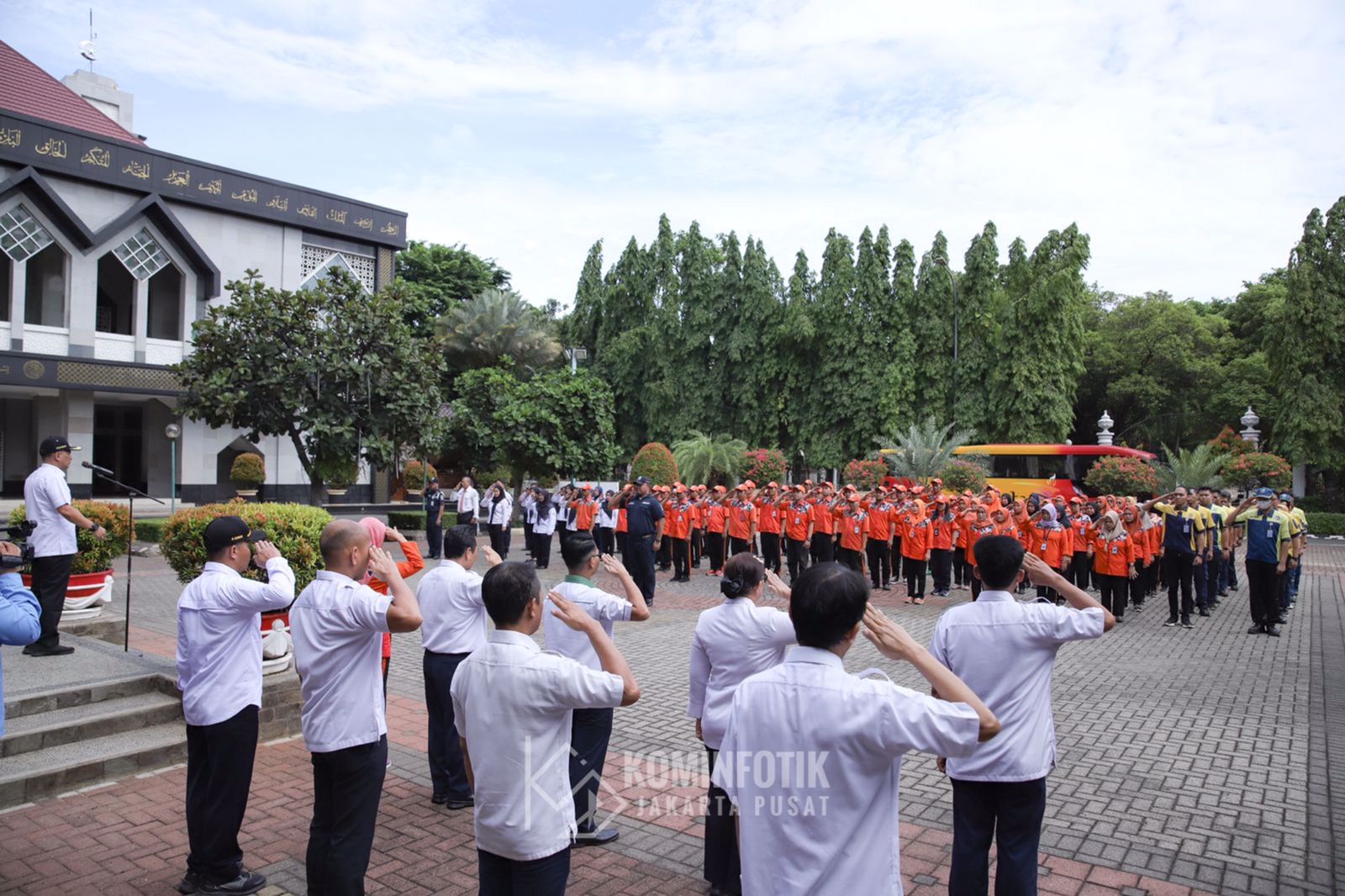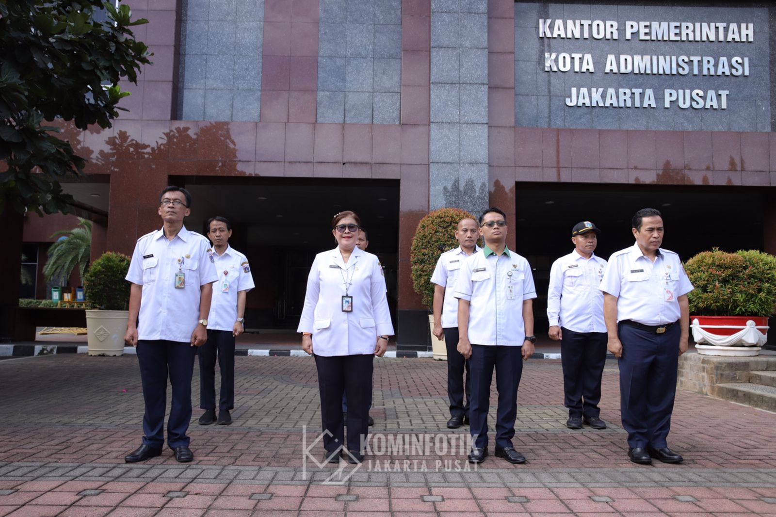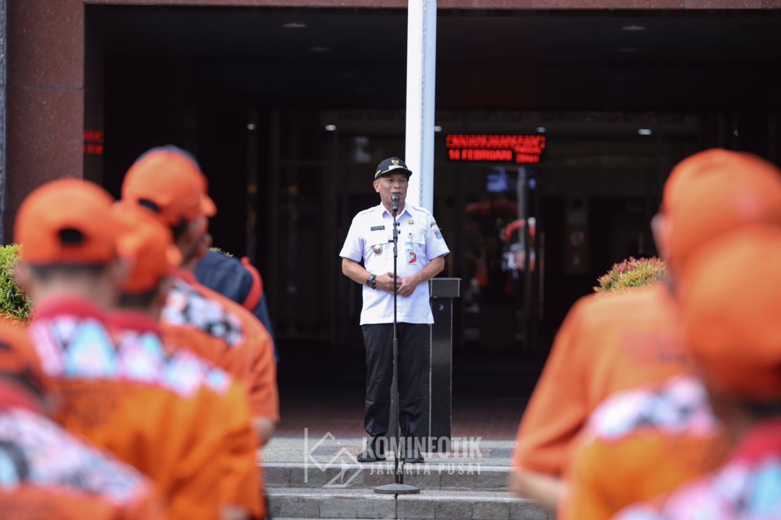 Plh Wali Kota Administrasi Jakarta Pusat Chaidir memberikan penghargaan kepada PJLP Kebersihan atas nama Asih Sunarsih (56) yang telah memasuki purnatugas di Halaman Kantor Wali Kota Jakarta Pusat, Jalan Tanah Abang I, Gambir, Rabu (24/1).