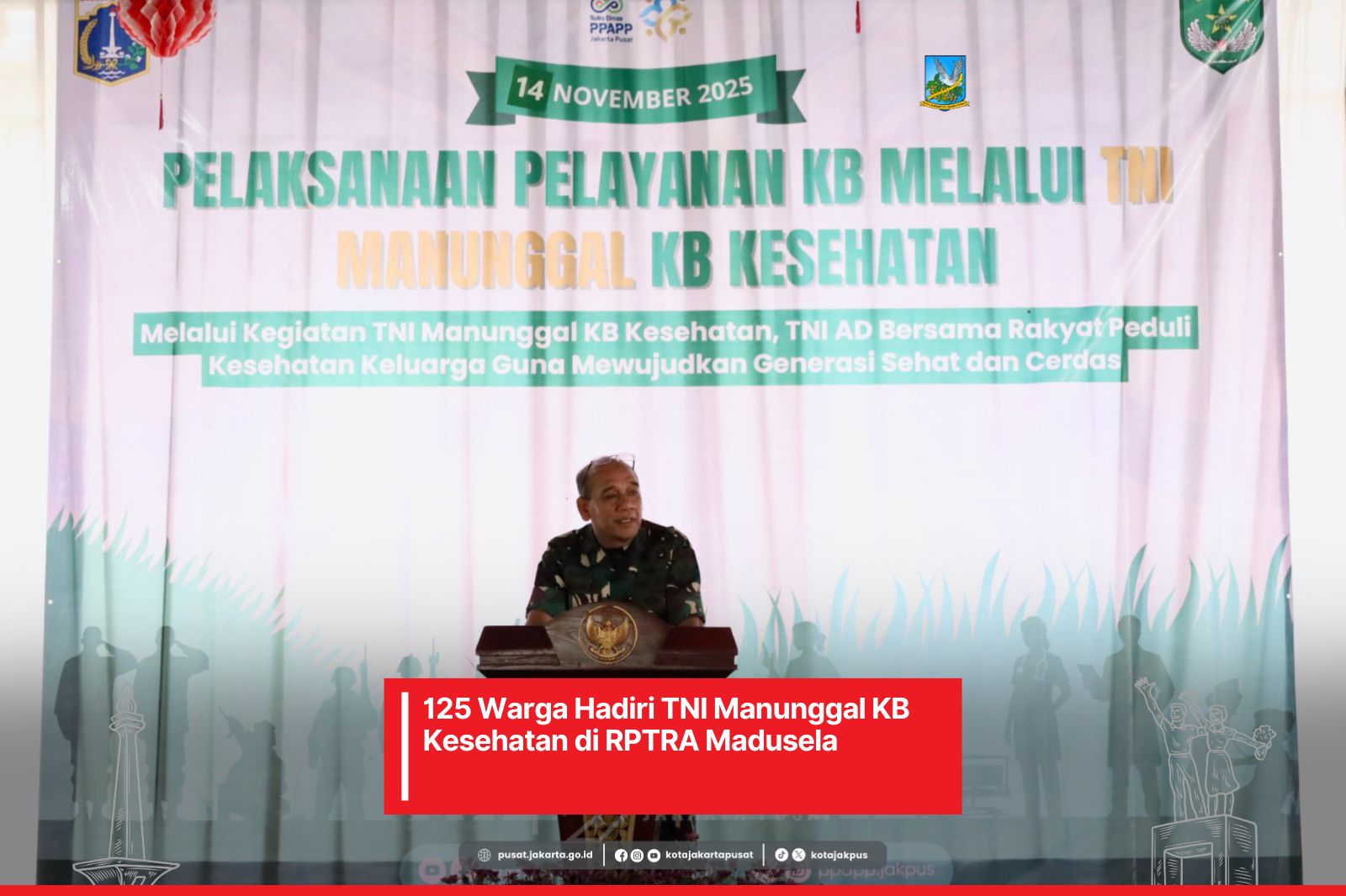 Komando Distrik Militer (Kodim) 05/01 JP BS bersama Pemerintah Kota (Pemkot) Administrasi Jakarta Pusat menggelar TNI Manunggal KB Kesehatan yang berlangsung di RPTRA Madusela, Kecamatan Sawah Besar, Jakarta Pusat, Jumat (14/11).
